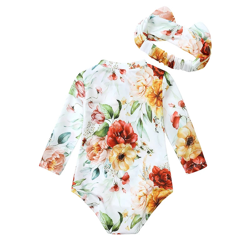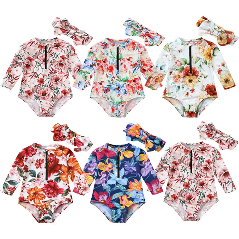 Summer Baby Girls Swimwear Flower Printing One piece Swimwear Romper+Headband...