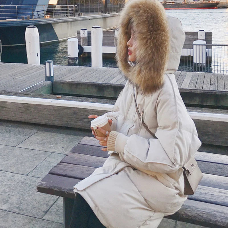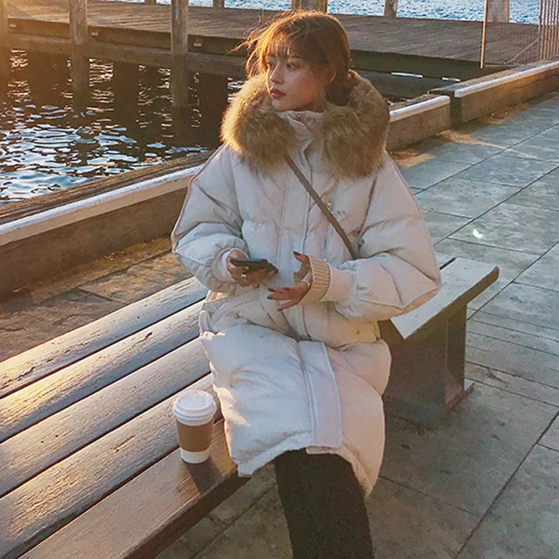 Korean Loose Thicken Mid Long Parkas Women Winter Faux Fur Collar Warm Hooded Jacket Woman Zipper Up Pock...