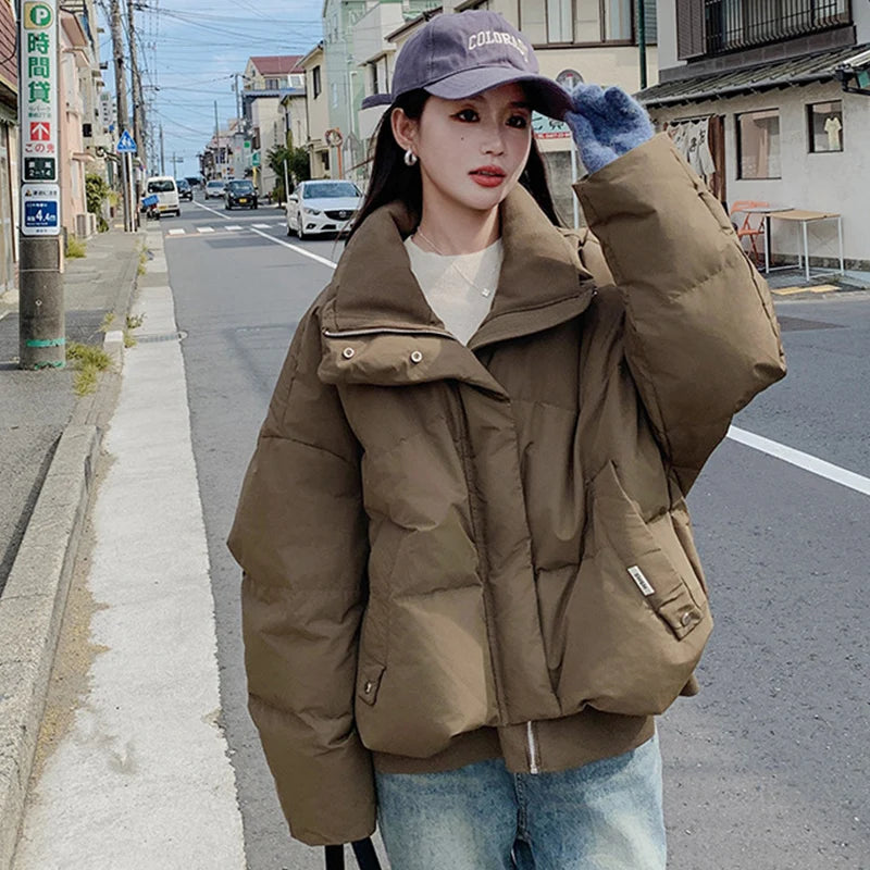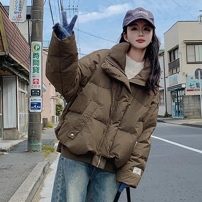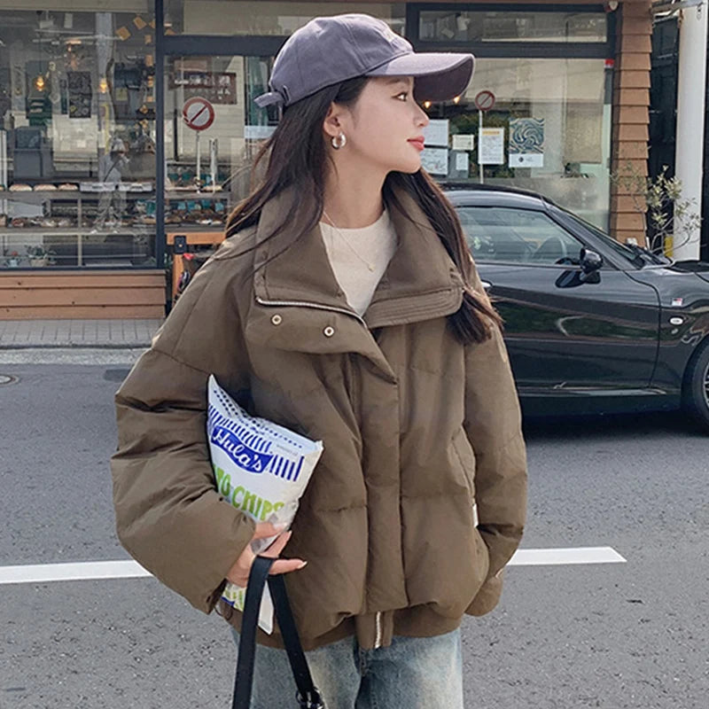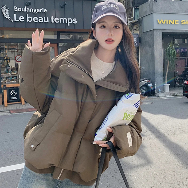 Korean Stand Collar Parkas for Women Khaki Loose Thicken Warm Parka Jacket Woman Winter Button Zipper Up ...