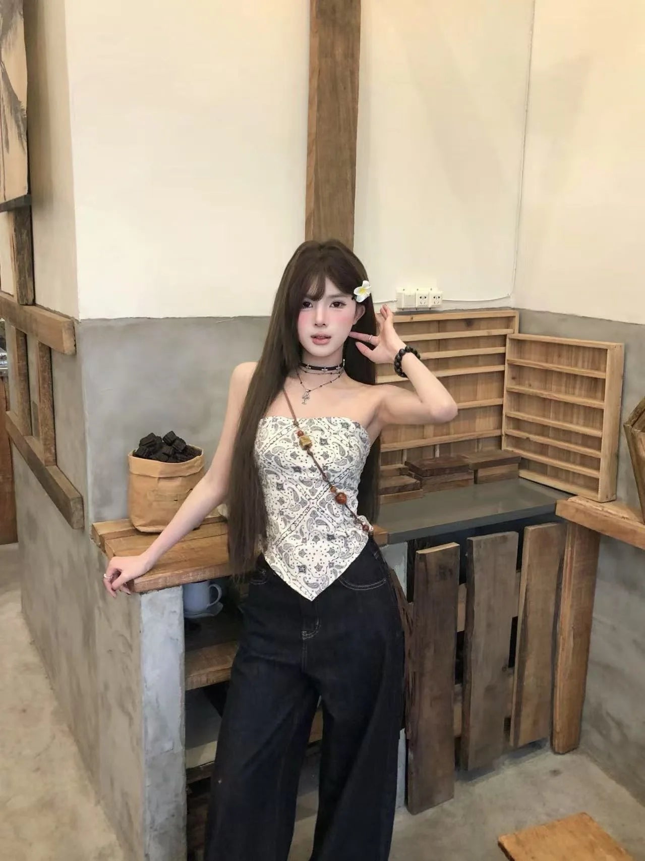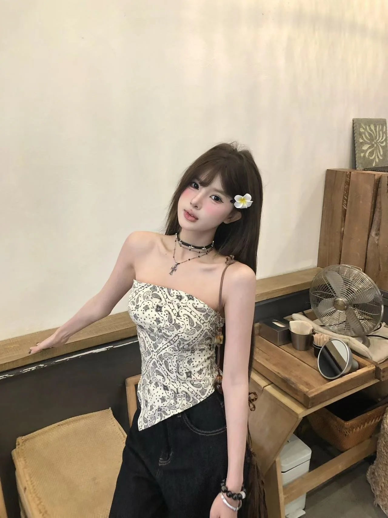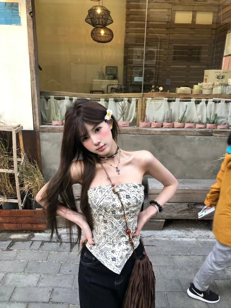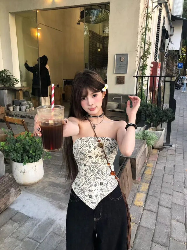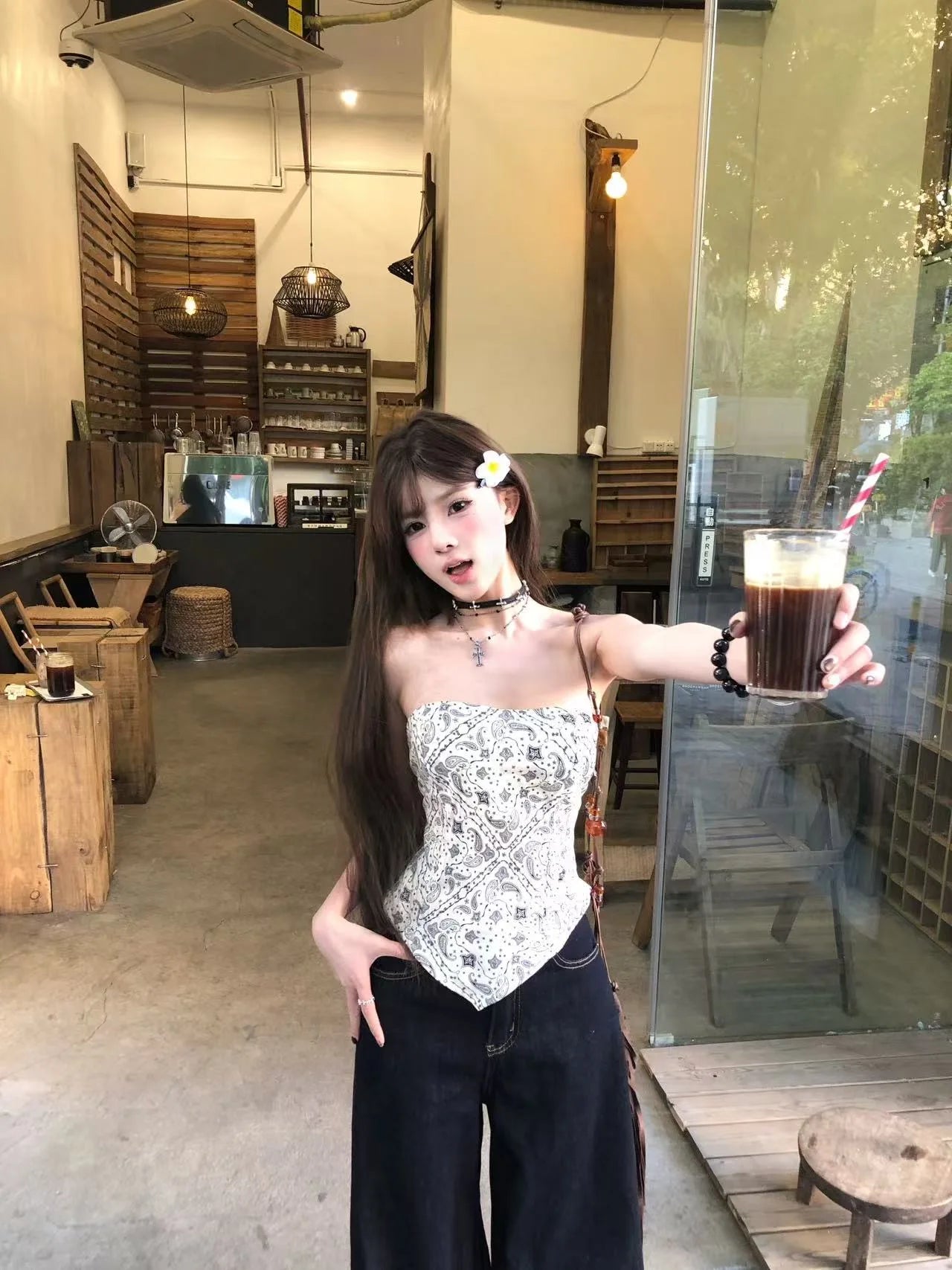 Vintage Pattern Print Slim Women Tank Tops Backless Sexy Rave Outfits Sleeveless Lace Up Bralette Crop To...