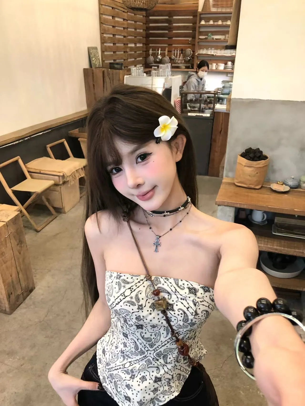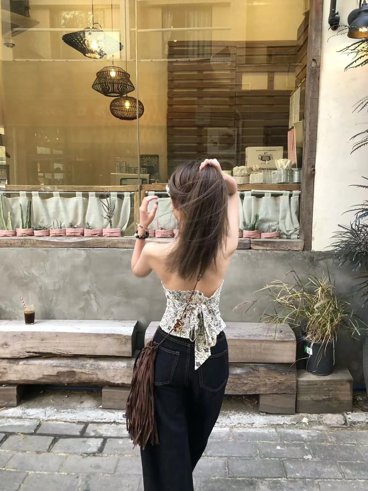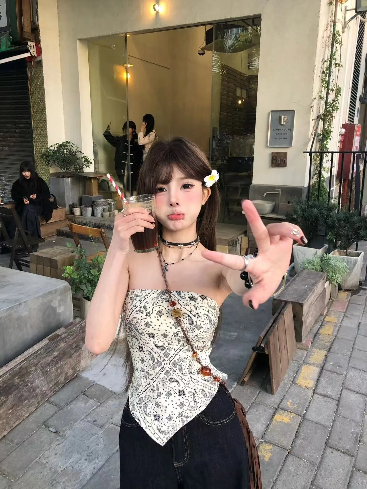 Vintage Pattern Print Slim Women Tank Tops Backless Sexy Rave Outfits Sleeveless Lace Up Bralette Crop To...