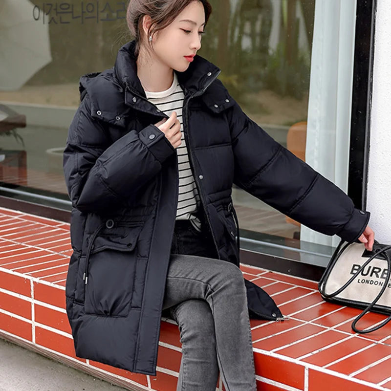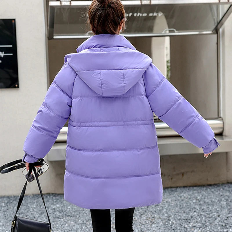 Winter Hooded Mid Long Parkas Women Purple Black Zipper Up Parka Jacket Woman Comfort Pockets Thickened W...