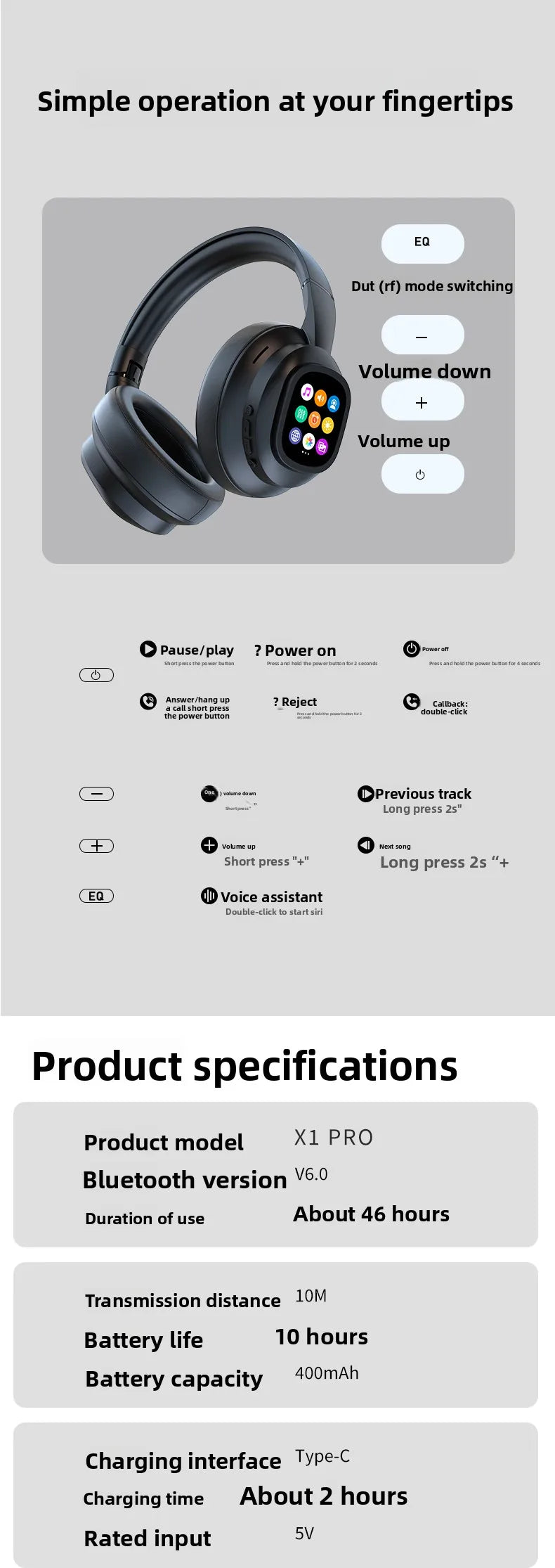 Hyundai X1pro Wireless Bluetooth 6.0 Headphone, AI Translation Earphones, 100...