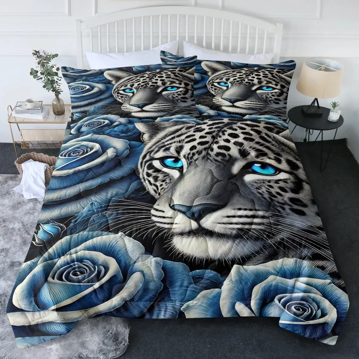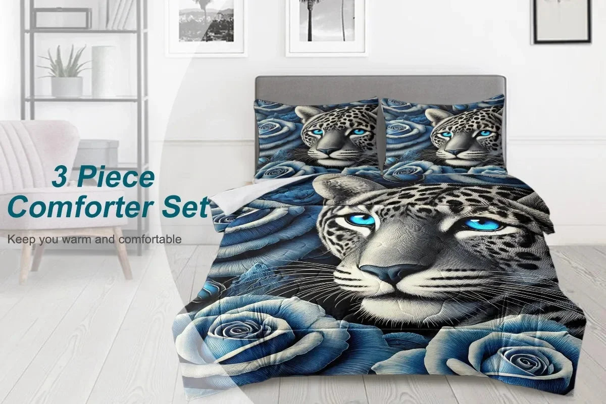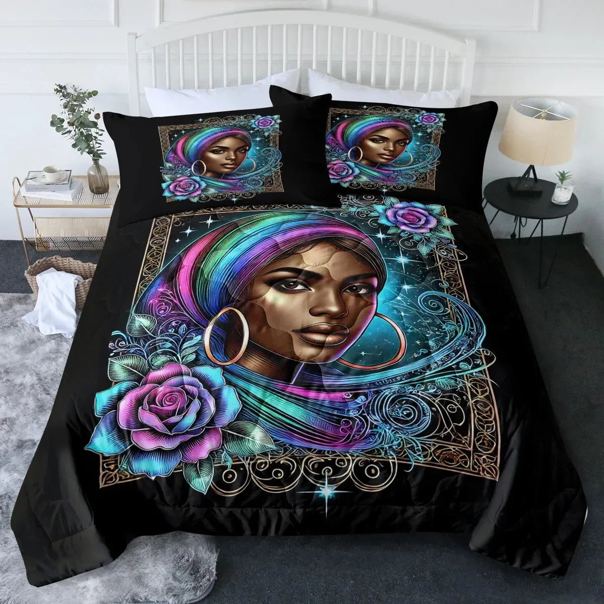3 Pcs Blue Rose Snow Leopard Bedding Sets Black Woman with Big Earrings Bed