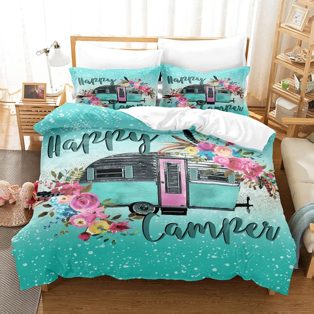 3pcs Happy Camper Pattern Printed Bedding Set, Suitable For Teenagers And