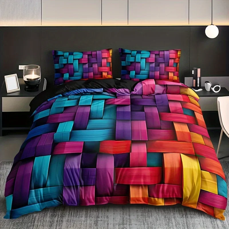 Geometric Colorful Plaid Duvet Cover Set Breathable Woven Polyester All Season 3