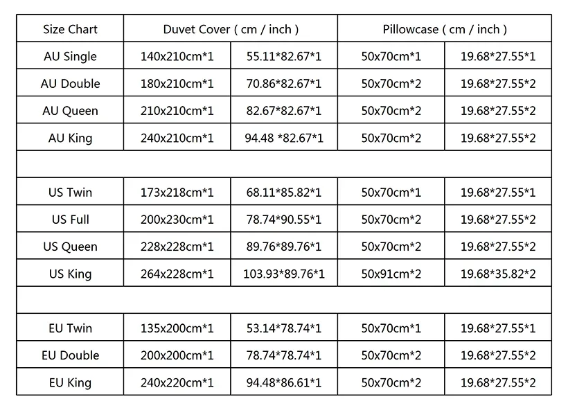Package Include: 1*Duvet Cover, 2*Pillowcases