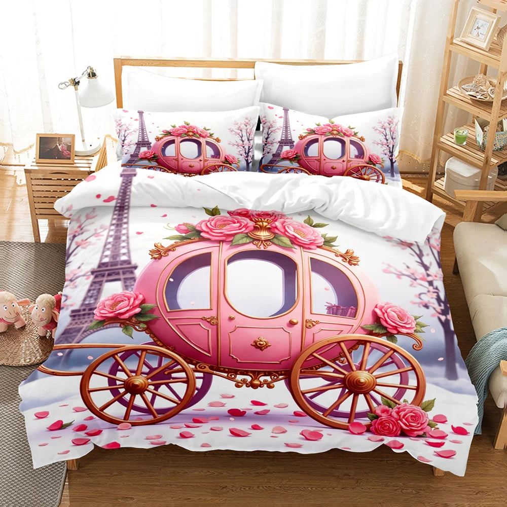 Rose Eiffel Tower Print Pattern Polyester Bedding Set Soft and Comfortable, Home