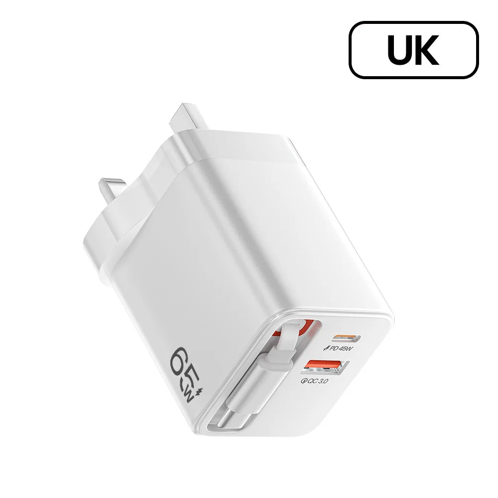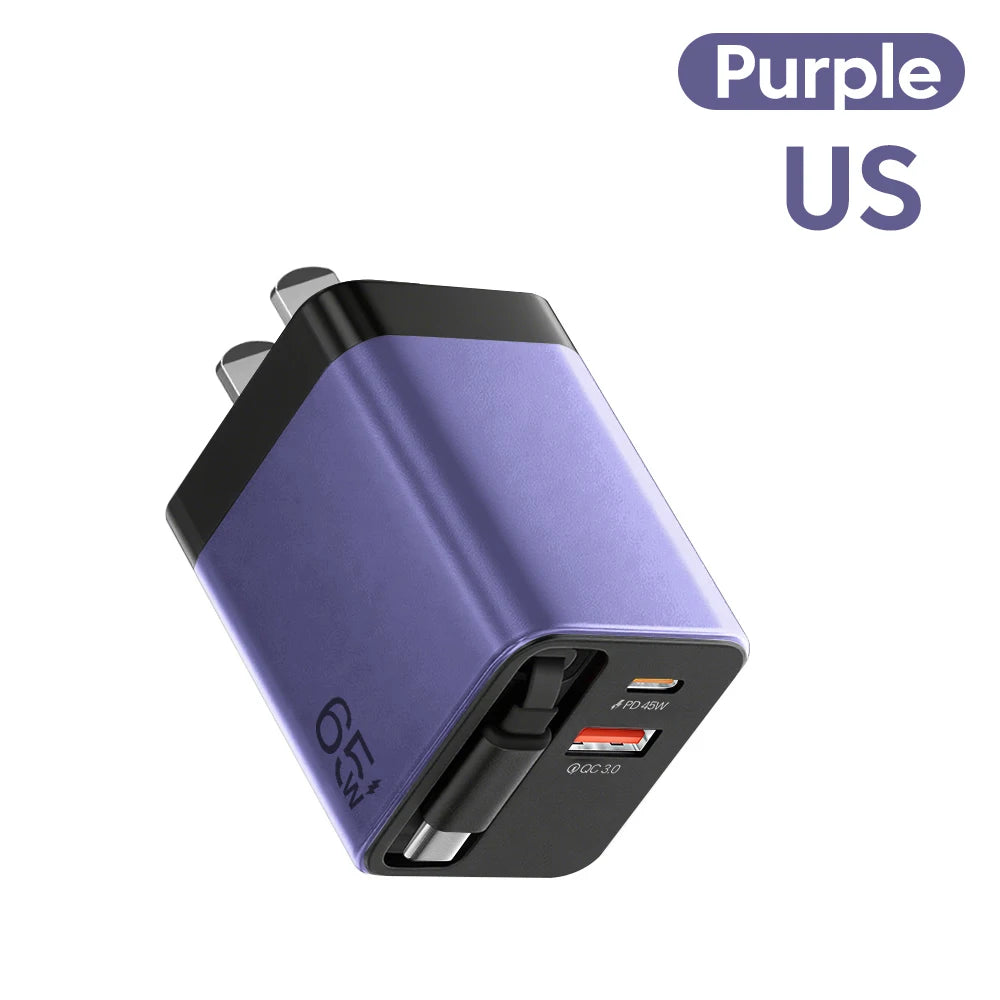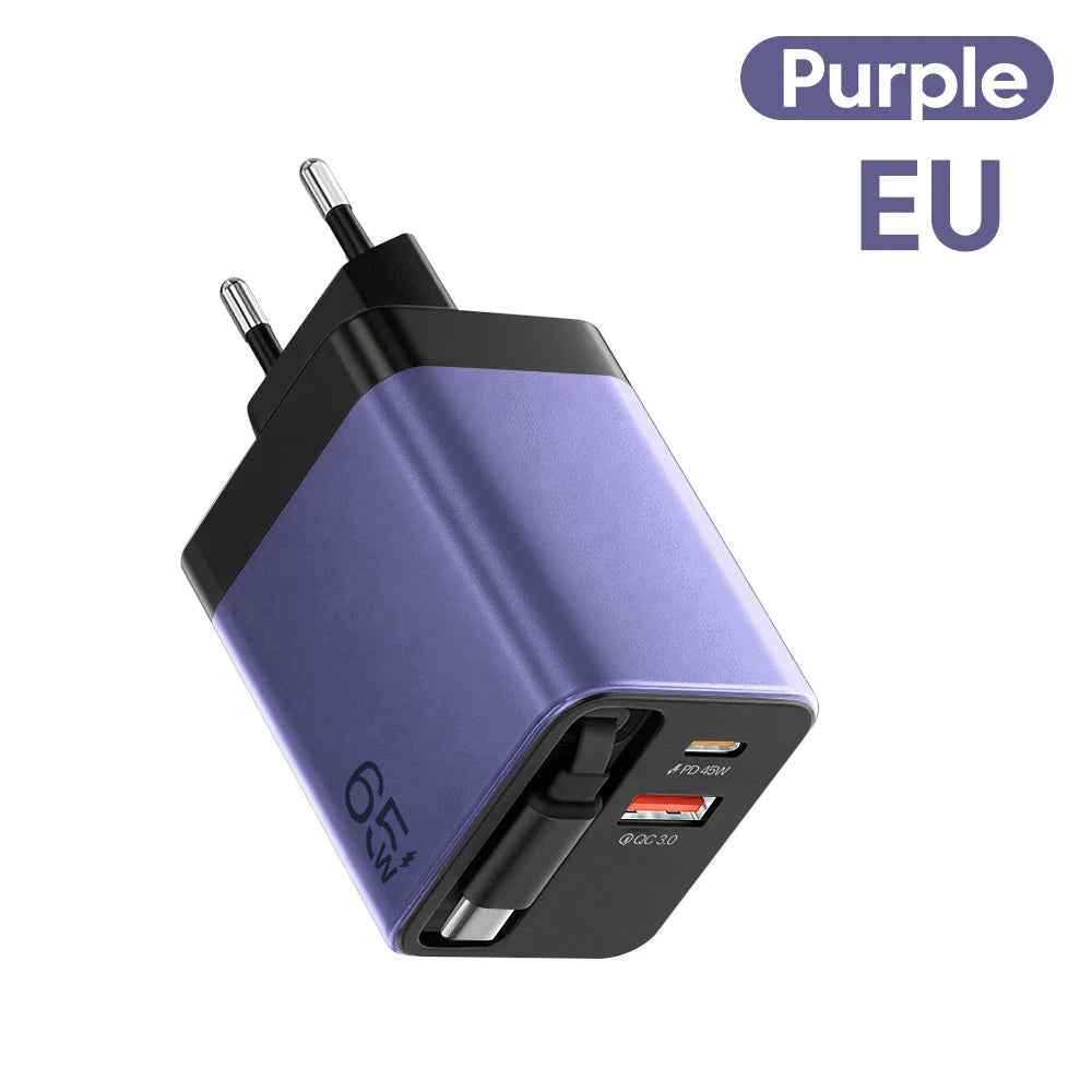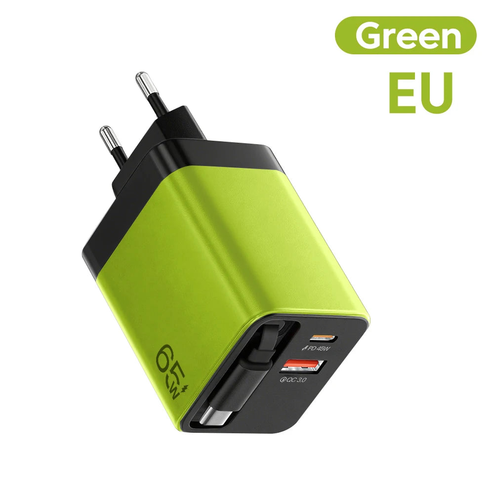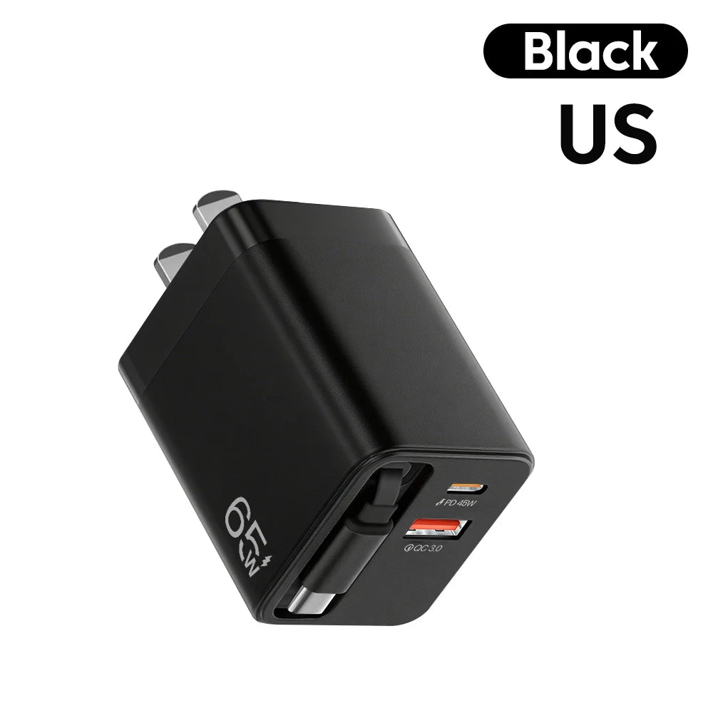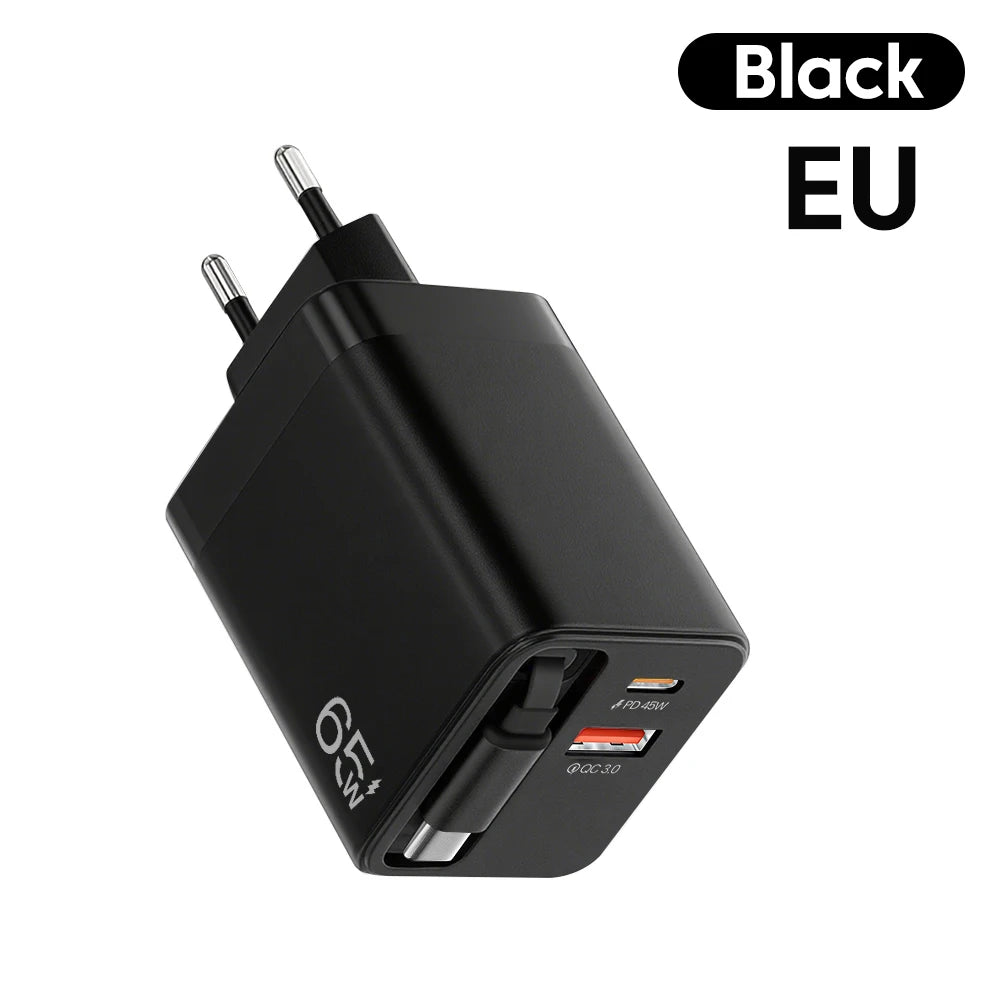 Pd65w USB Pd3.0 Phone Fast Charger with Retractable Cable EU UK Plug Power Po...