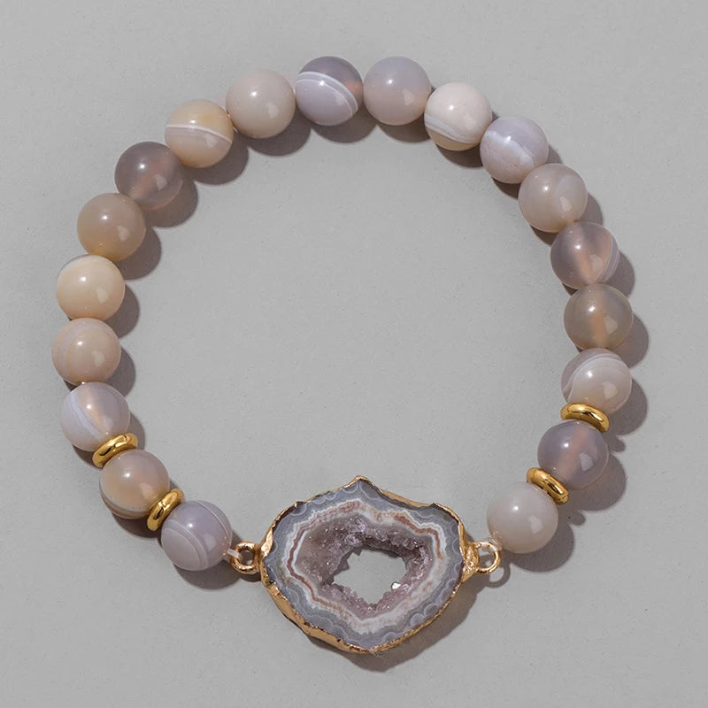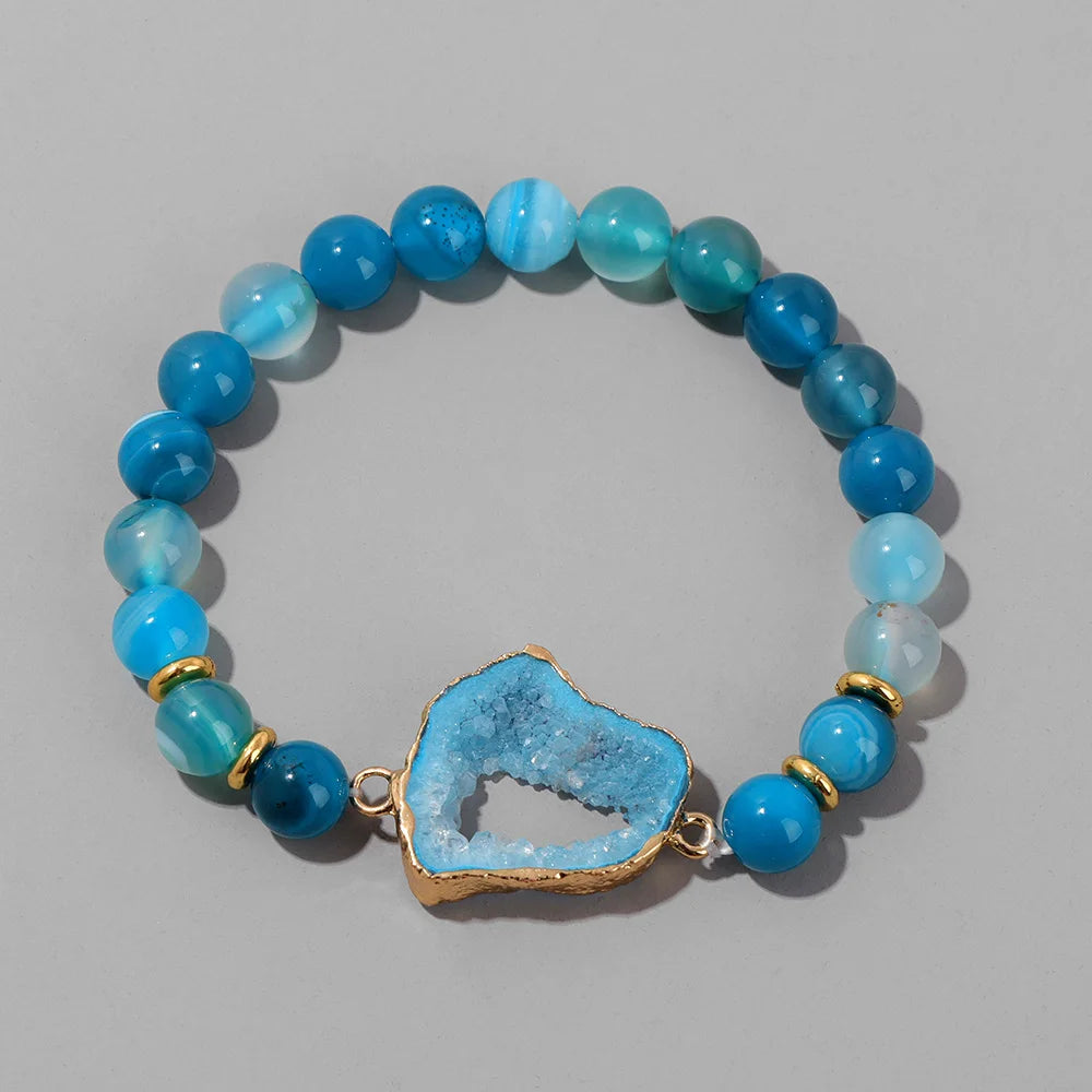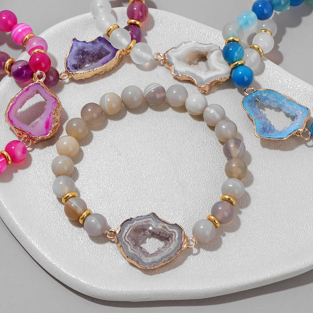 Handmade Natural Druzy Quartz Crystal Charm Bracelet Fashion Stripe Agates Beads Elastic Bracelets for Women Men Couples Jewelry