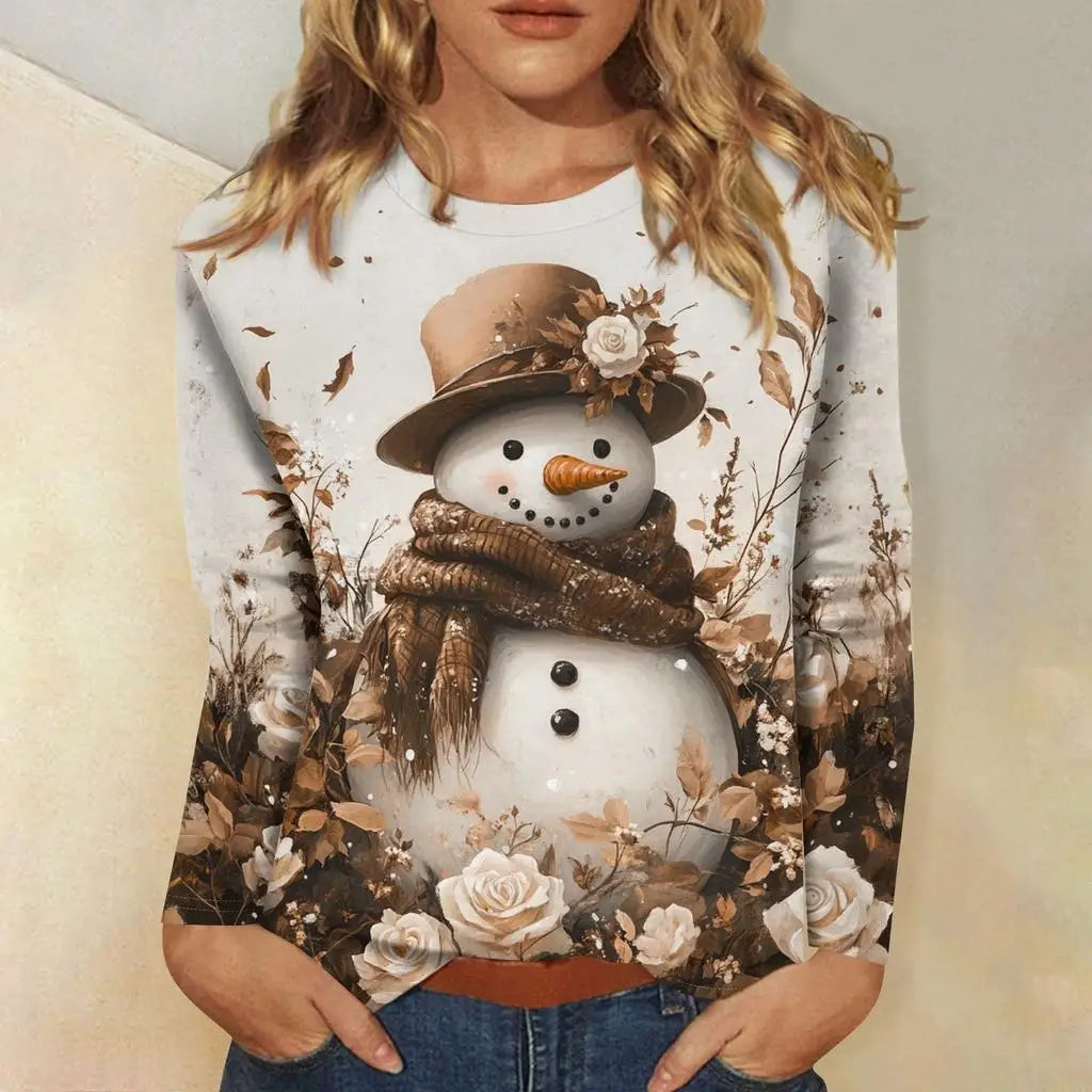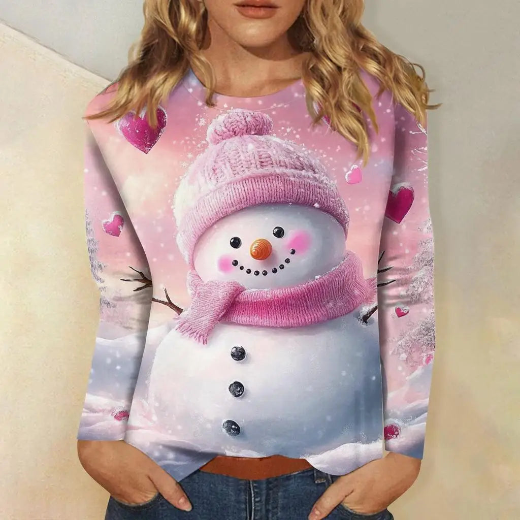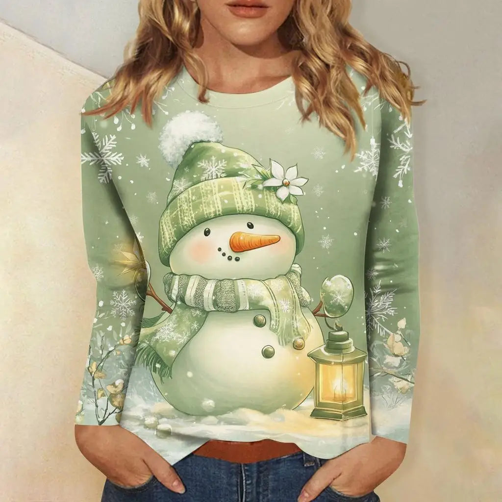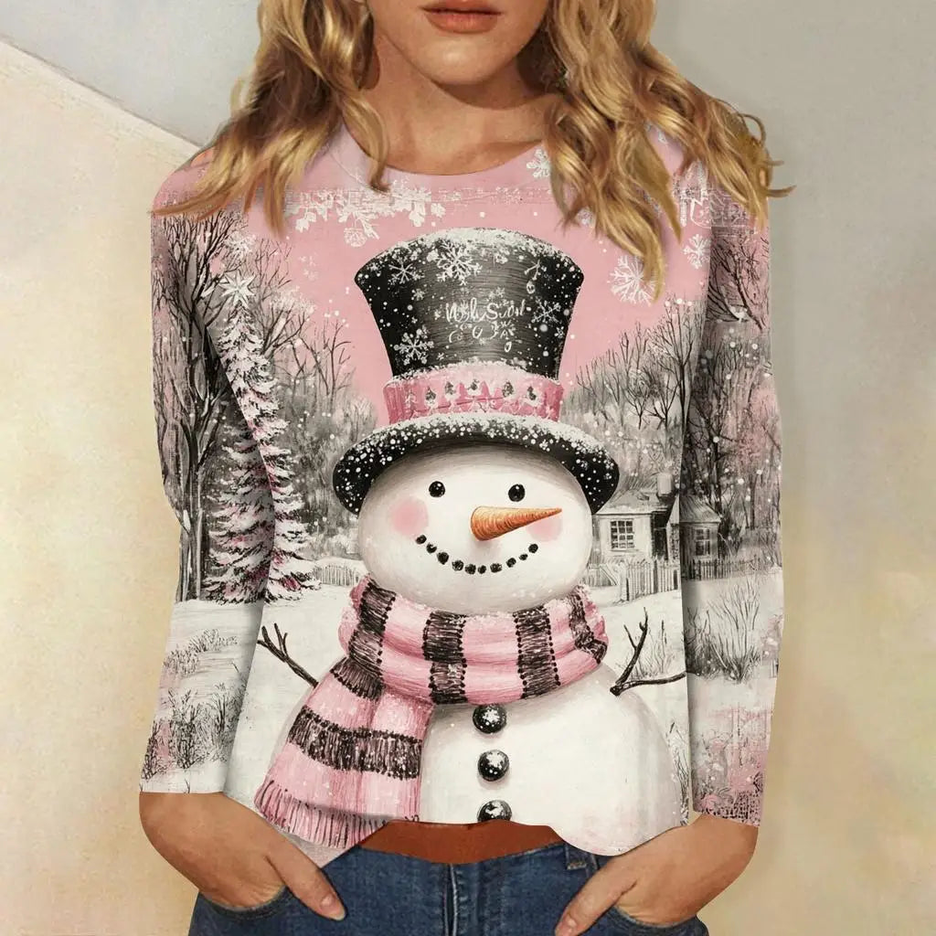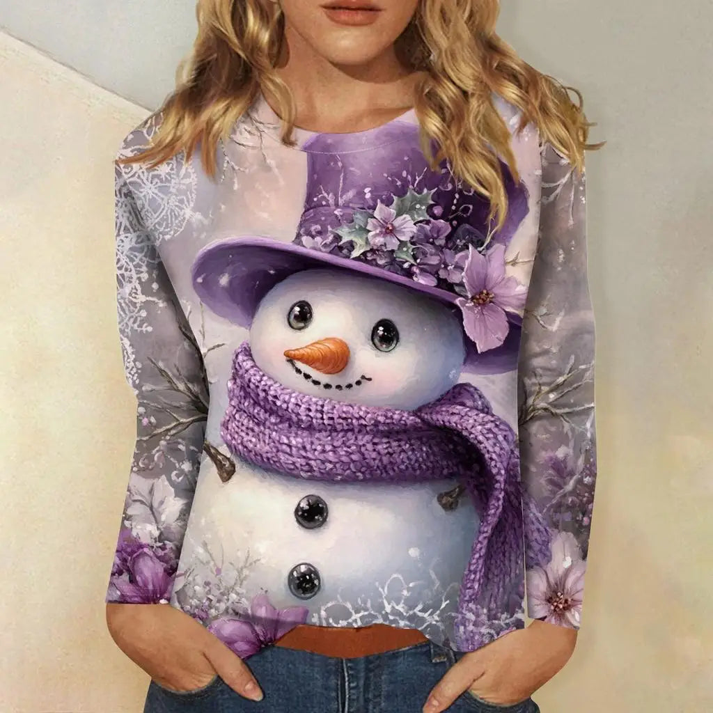 Women s 3D Christmas Snowflake Snowman Printed Round Neck Long Sleeve T shirt...