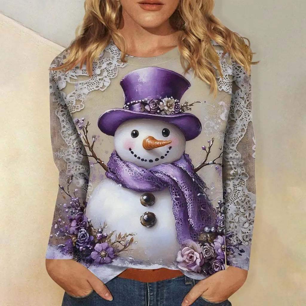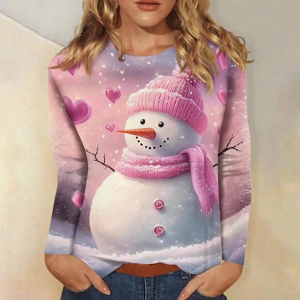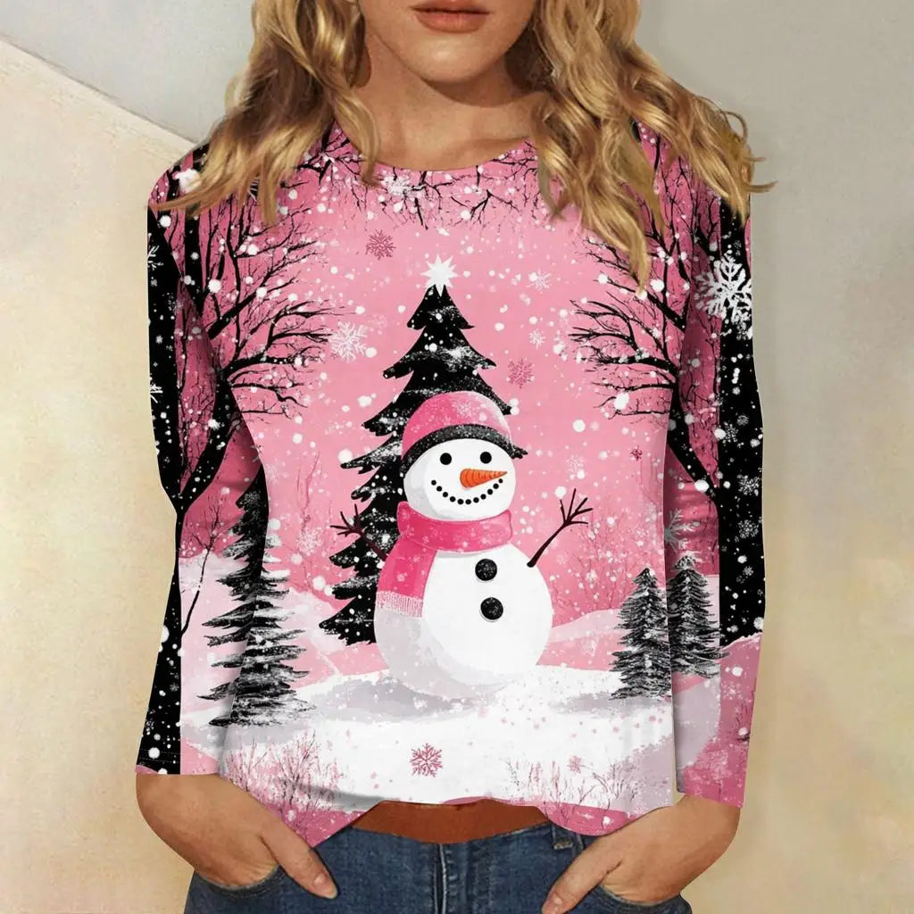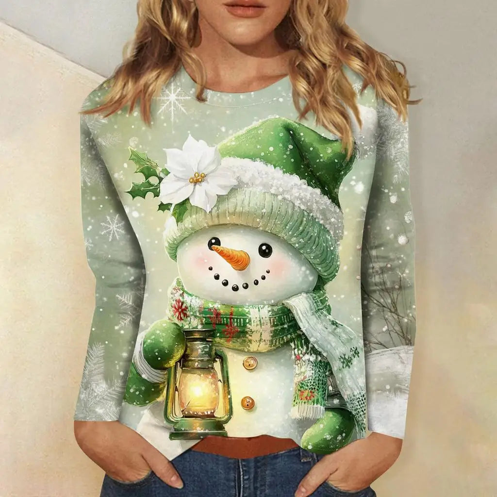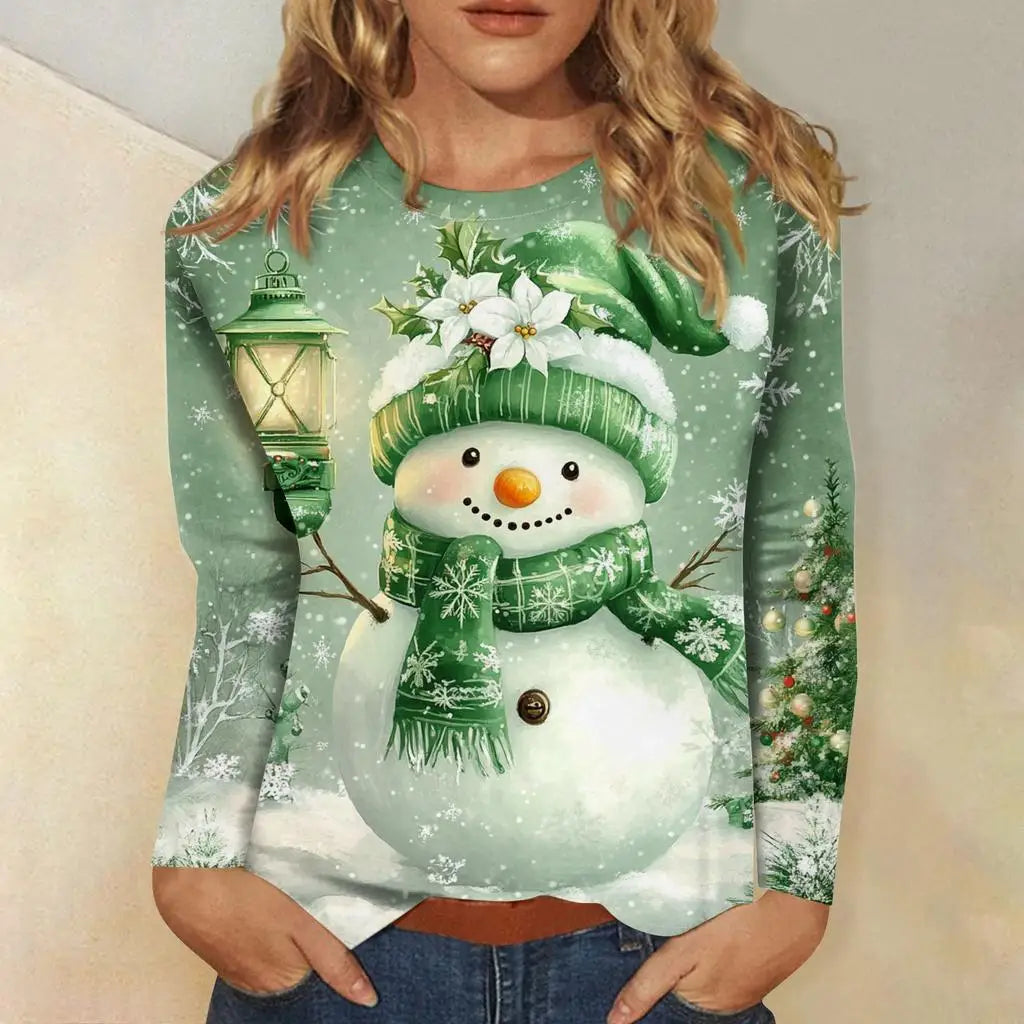 Women s 3D Christmas Snowflake Snowman Printed Round Neck Long Sleeve T shirt...