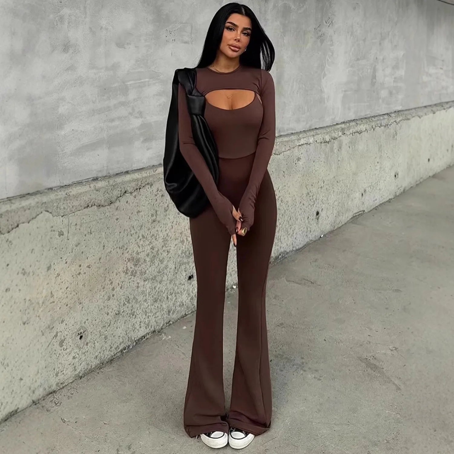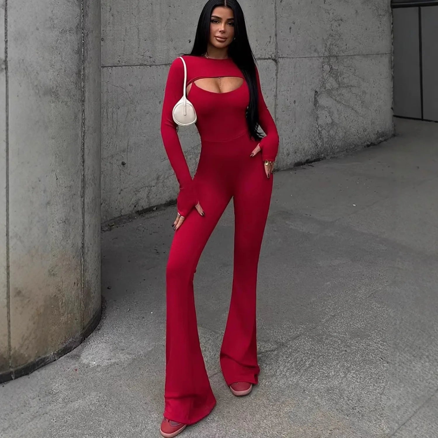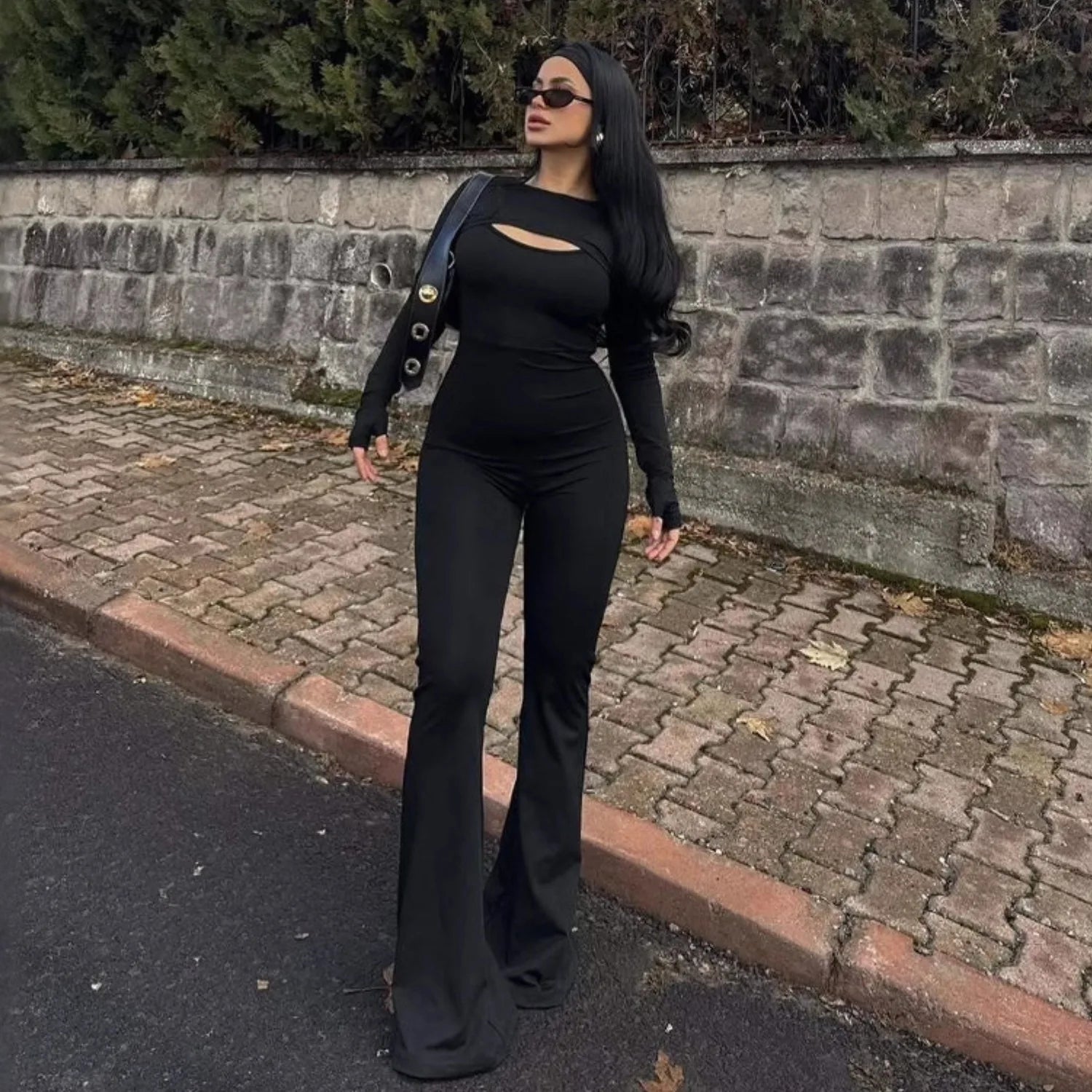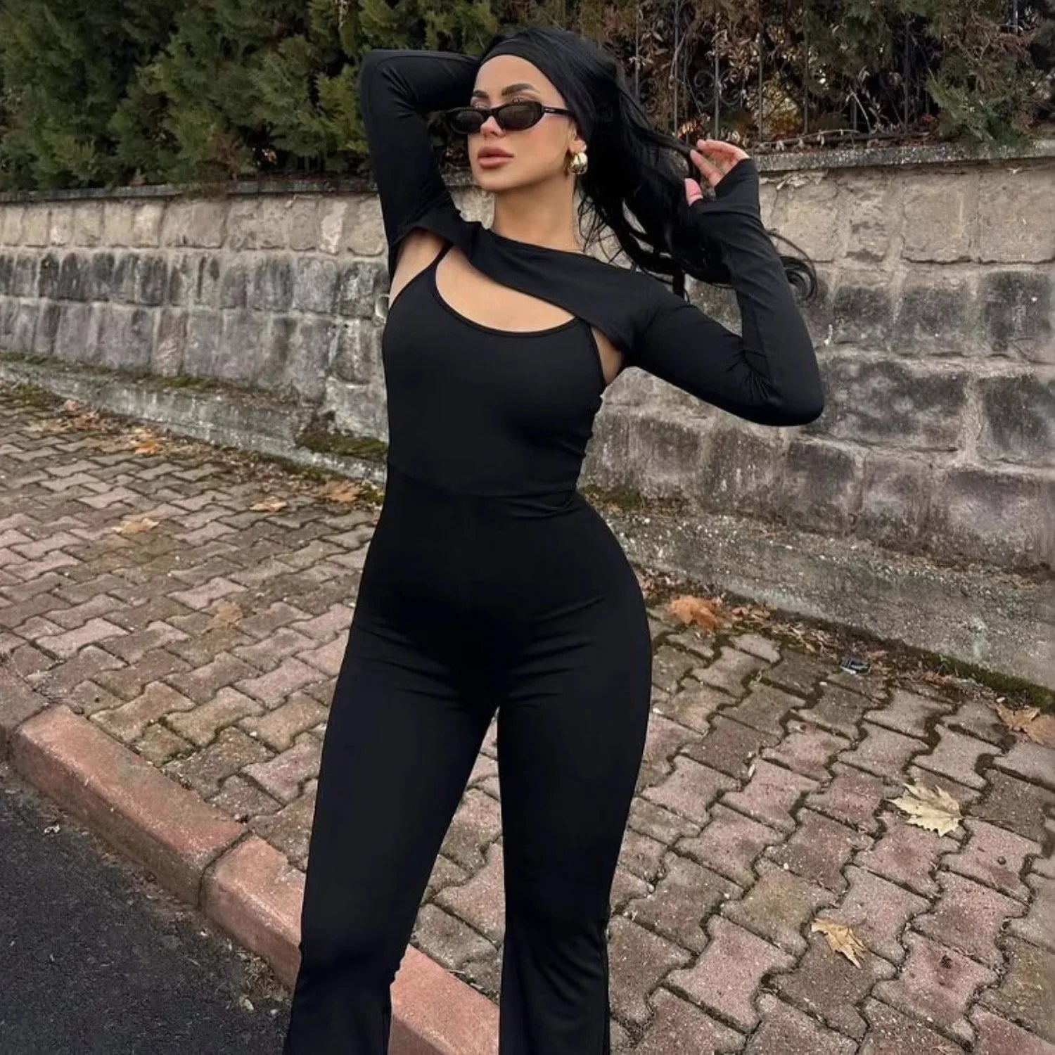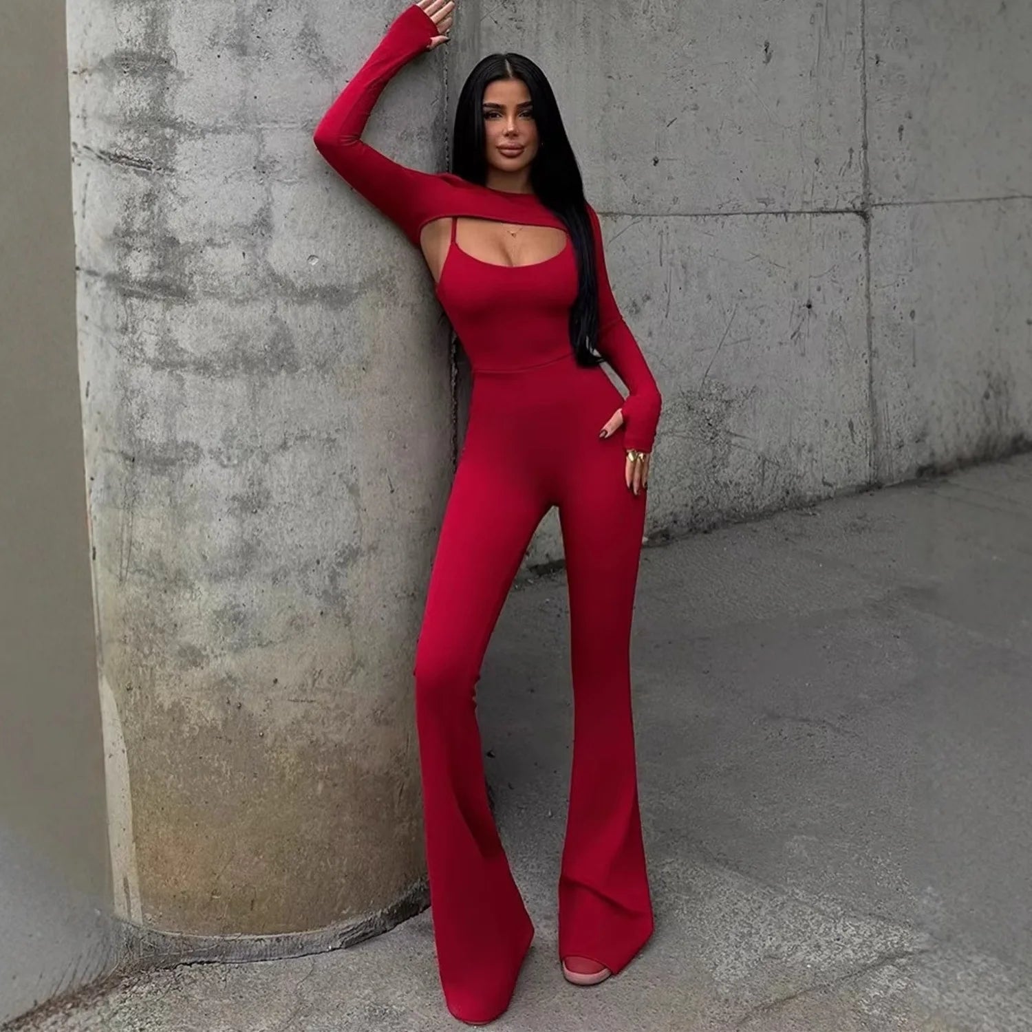 2025 NEW Hollow Out Two Piece Sets Women Jumpsuit Long Sleeve Top Spaghetti Strap Playsuit Winter New Ele...