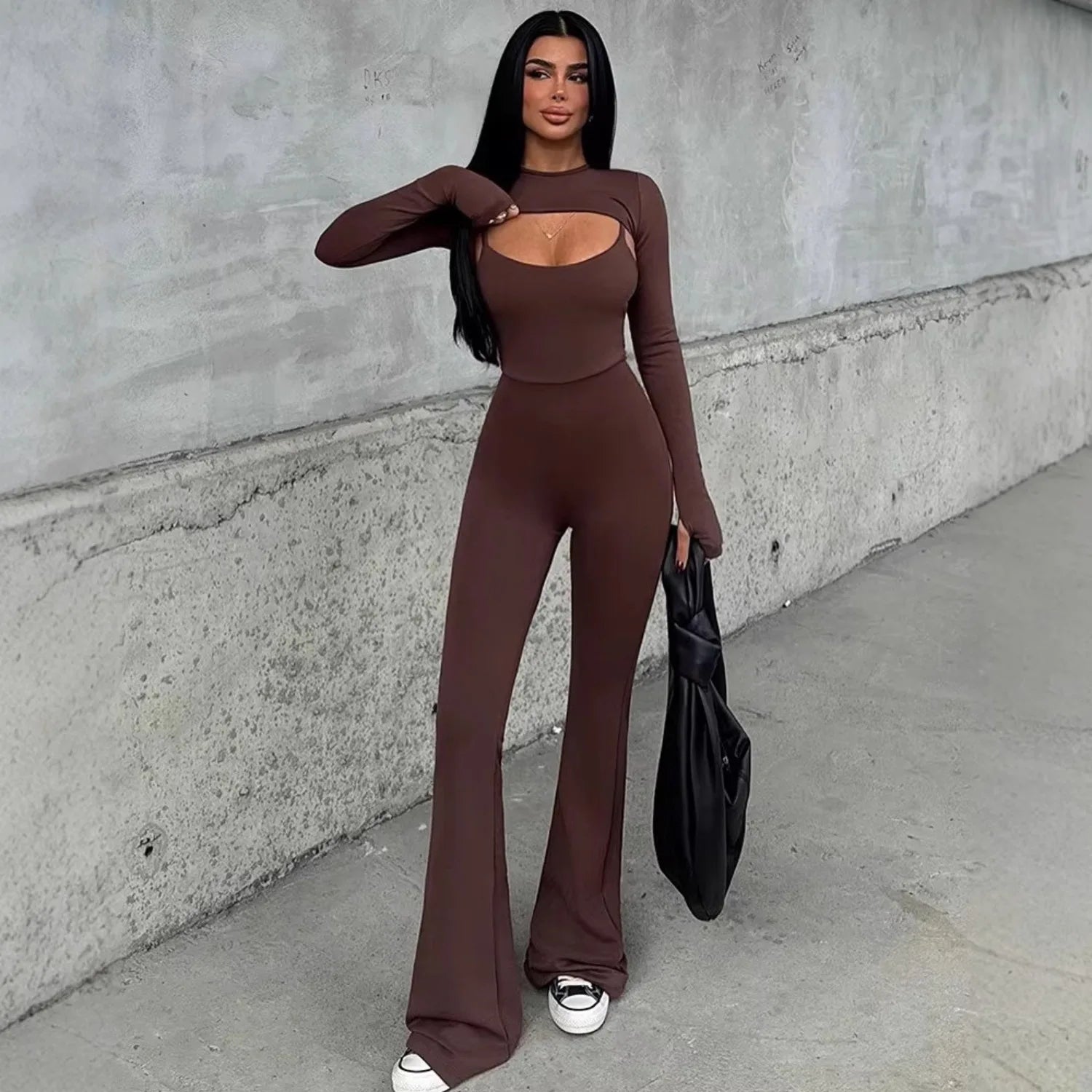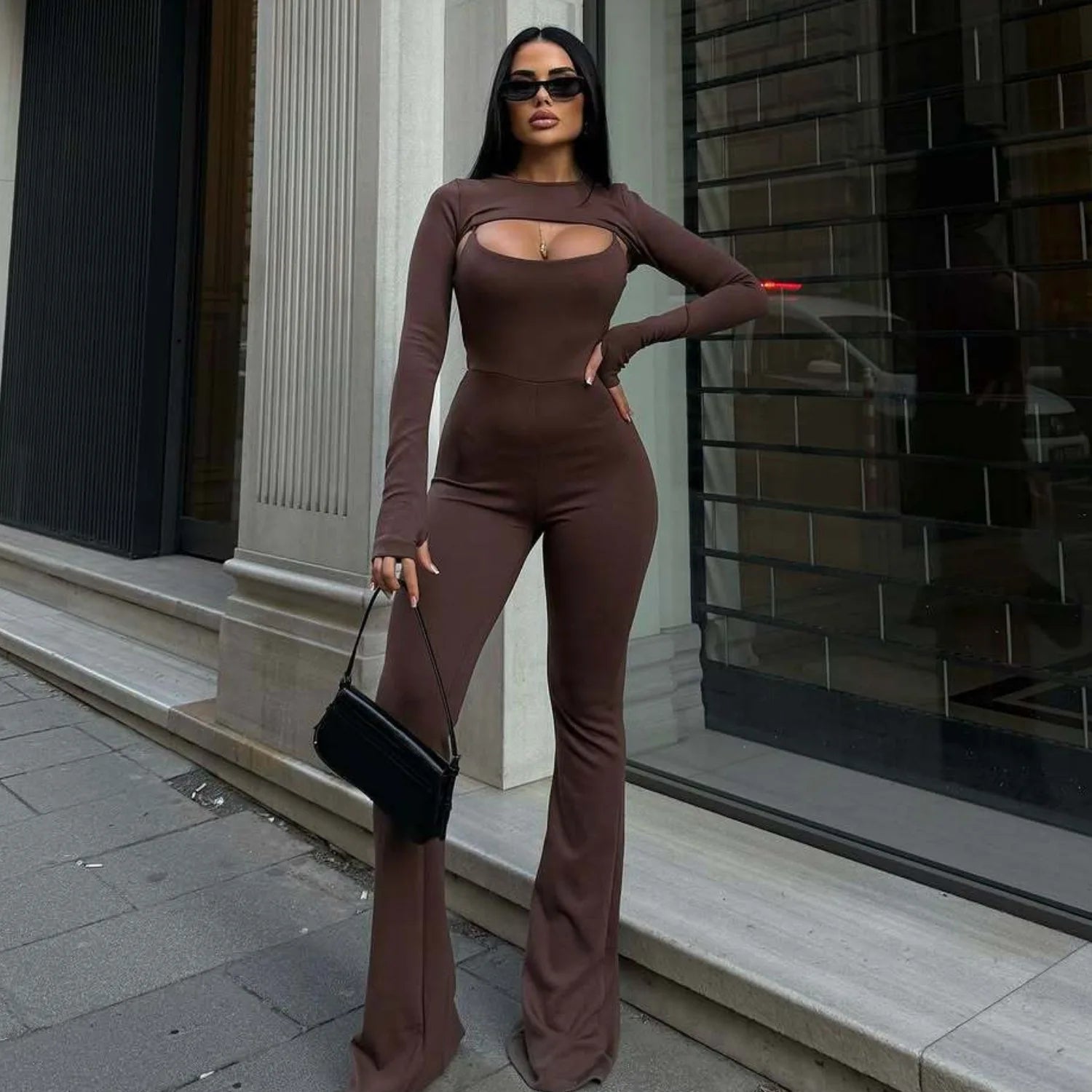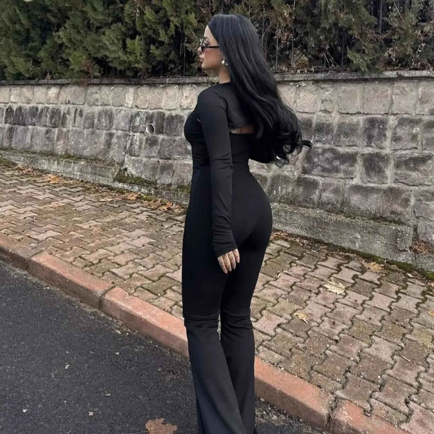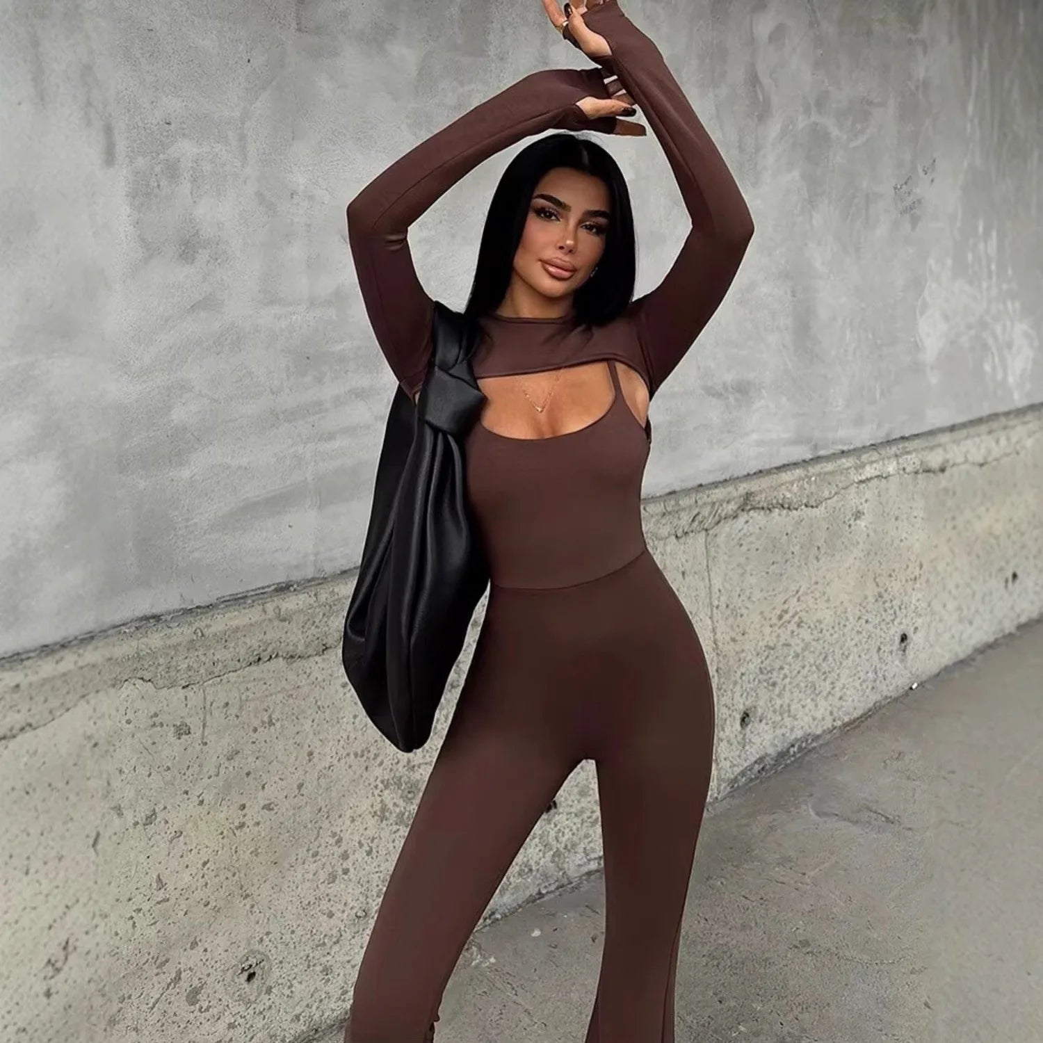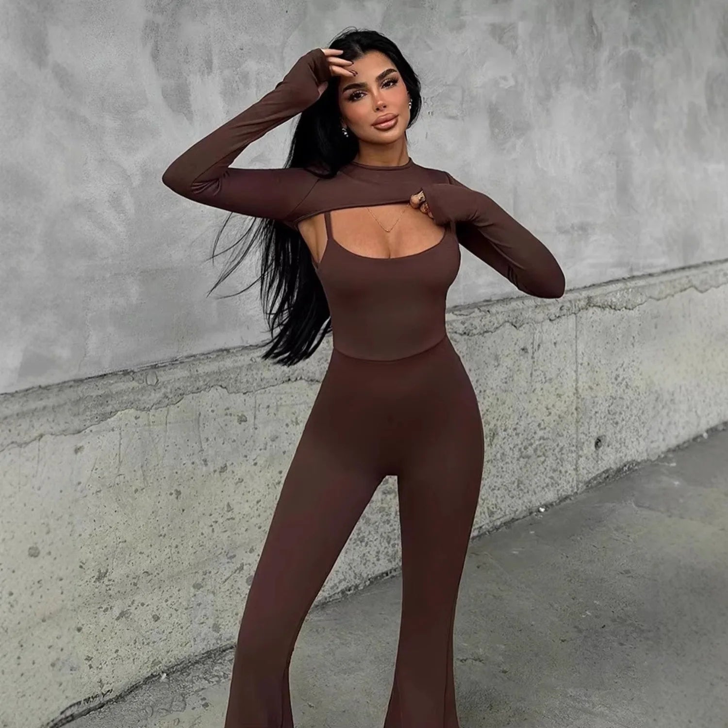 2025 NEW Hollow Out Two Piece Sets Women Jumpsuit Long Sleeve Top Spaghetti Strap Playsuit Winter New Ele...
