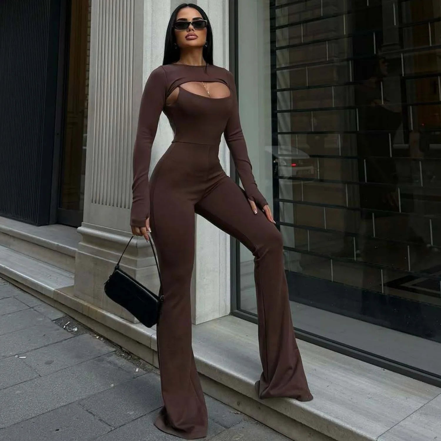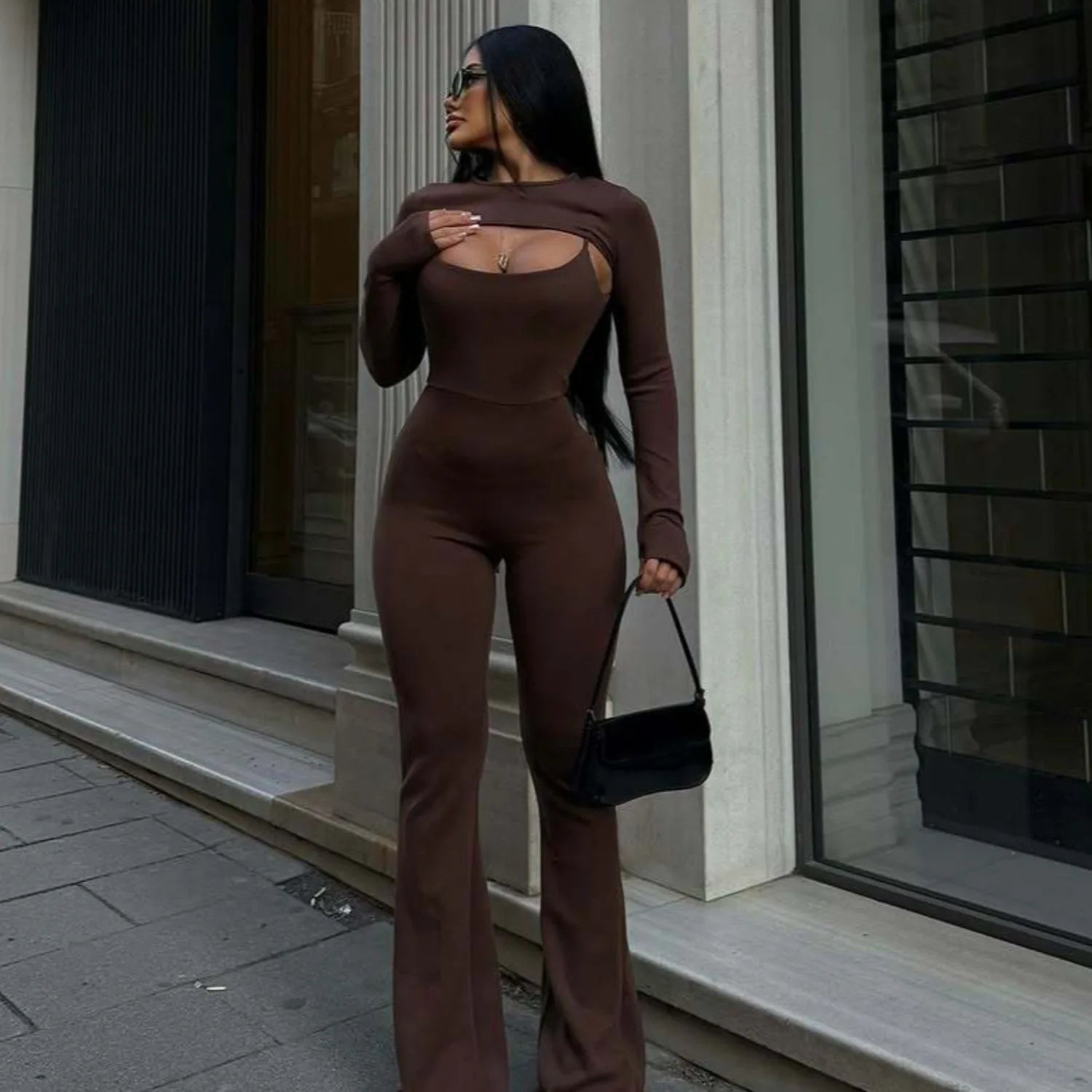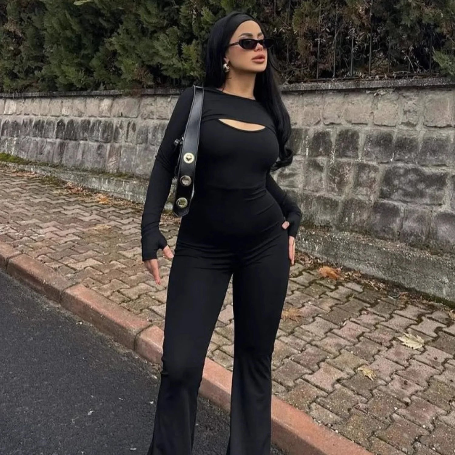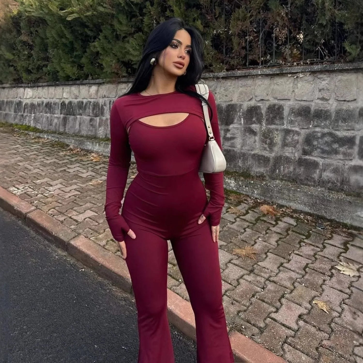 2025 NEW Hollow Out Two Piece Sets Women Jumpsuit Long Sleeve Top Spaghetti Strap Playsuit Winter New Ele...