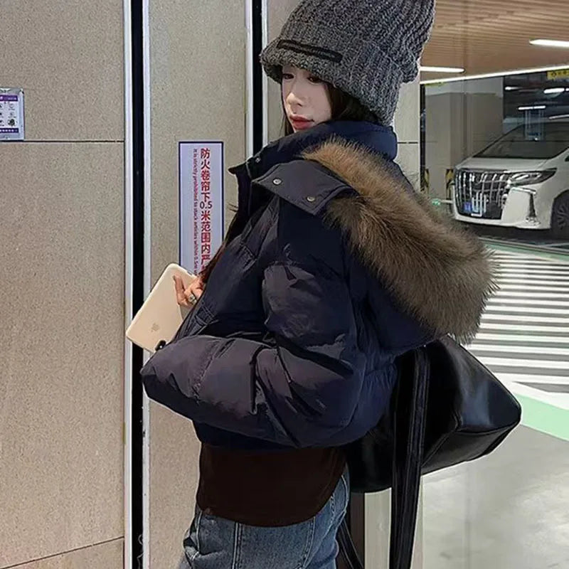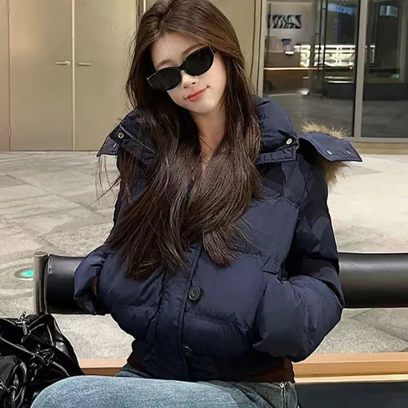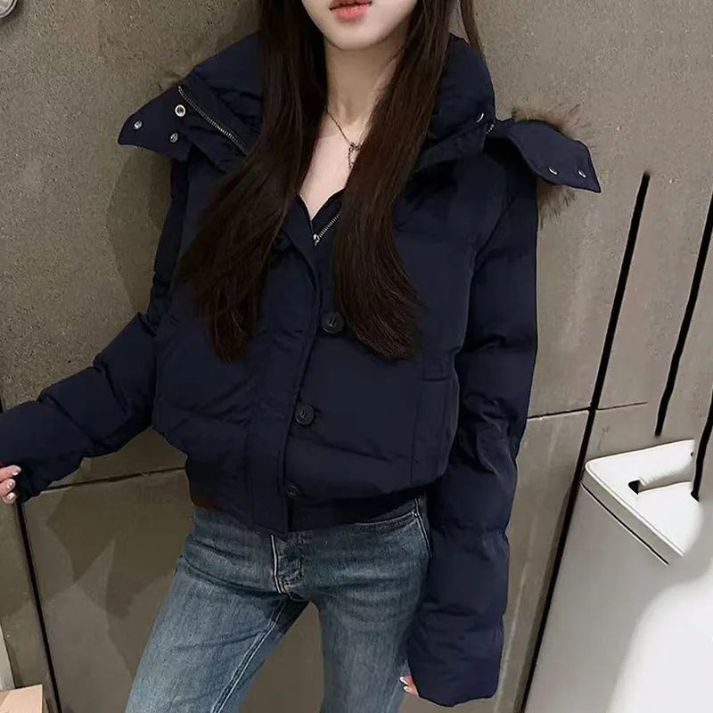 Korean Fur Collar Hooded Parkas Ladies Fashion Design Cropped Cotton Padded Winter Jacket Female Blue Cas...