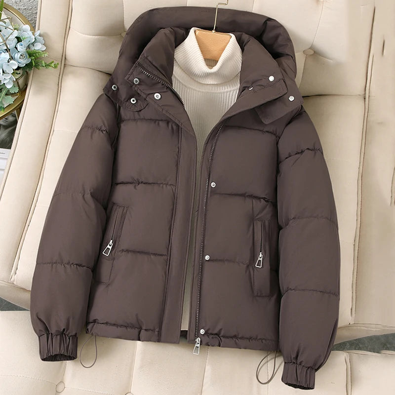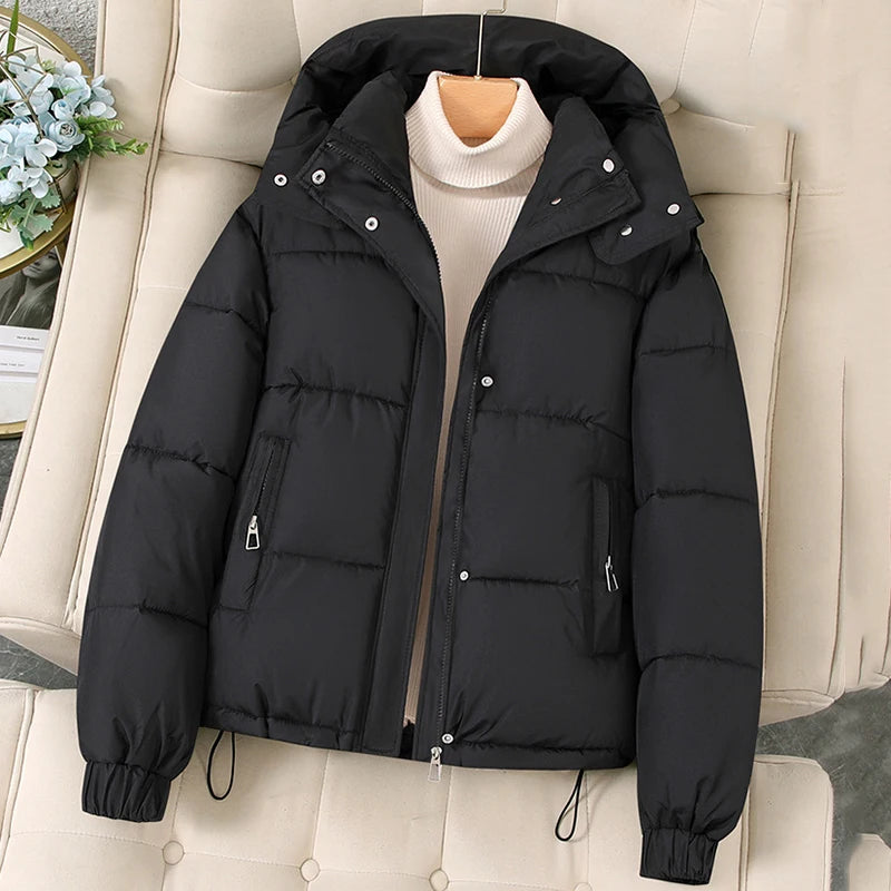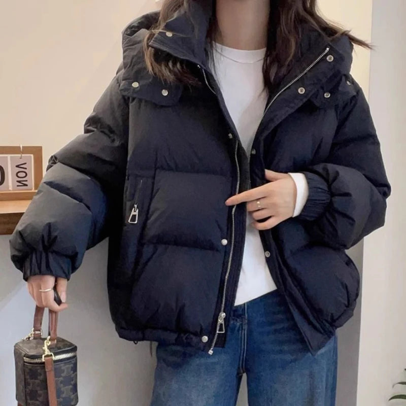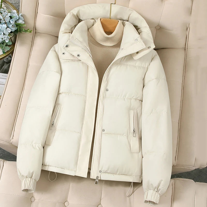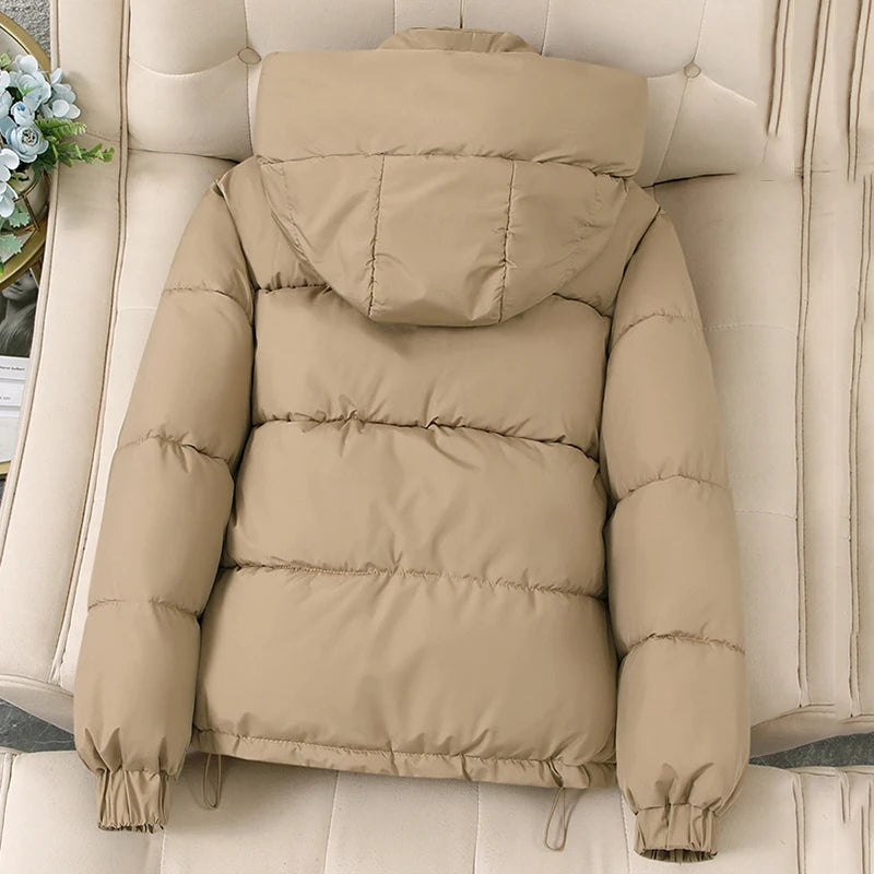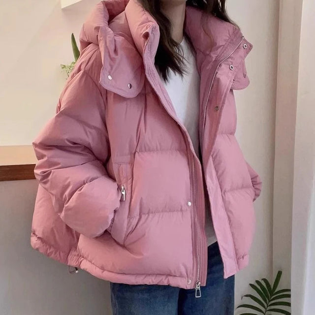 Pink Hooded Down Cotton Jackets for Women Korean Stand Colar Thicken Warm Parka Jacket Woman Zip Up Long Sleeve Winter Overcoat