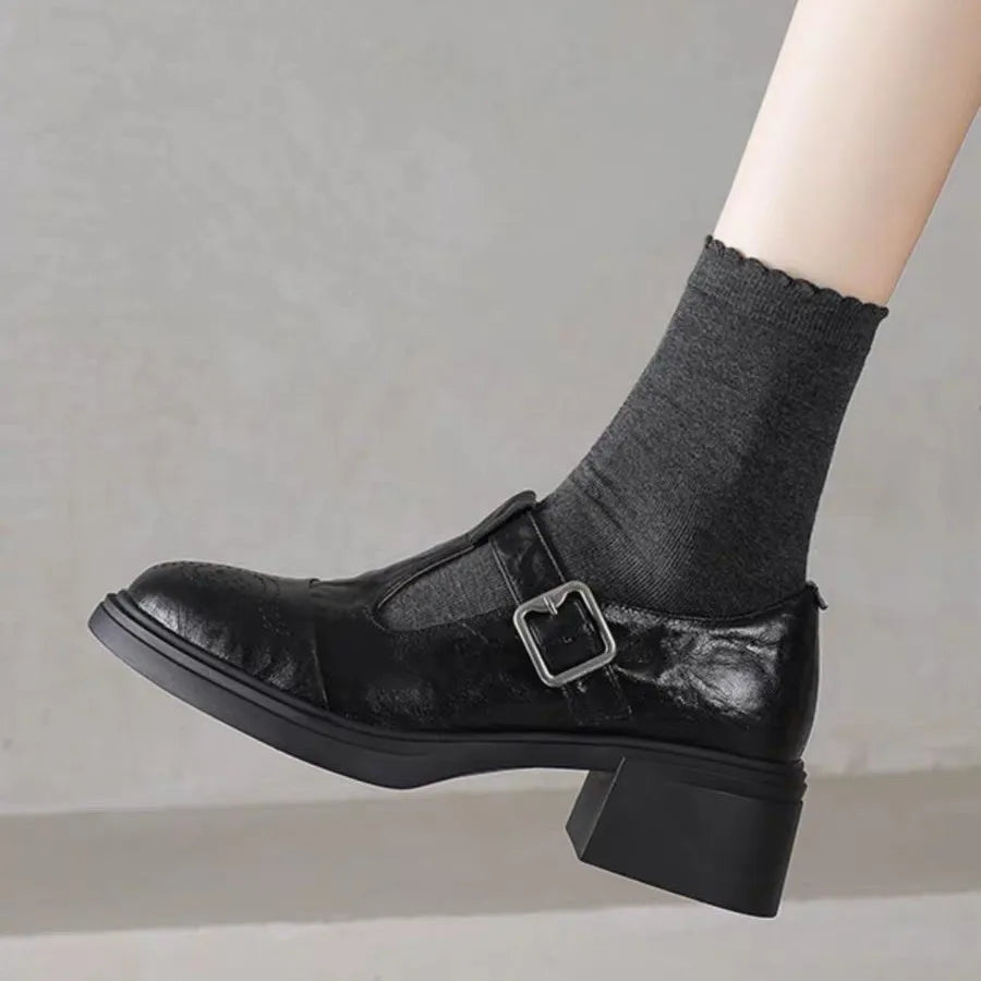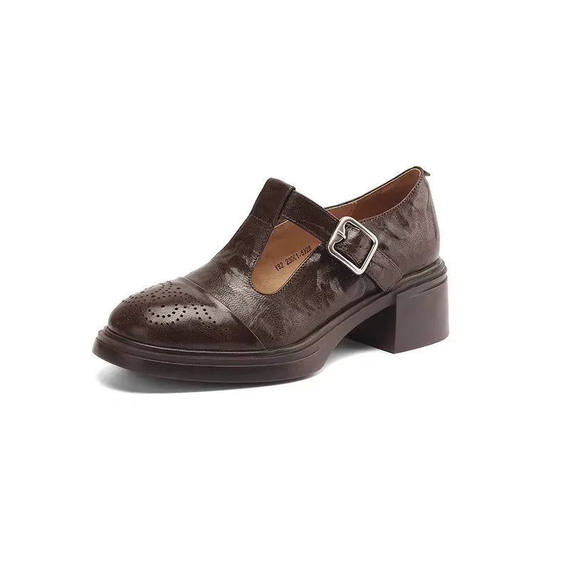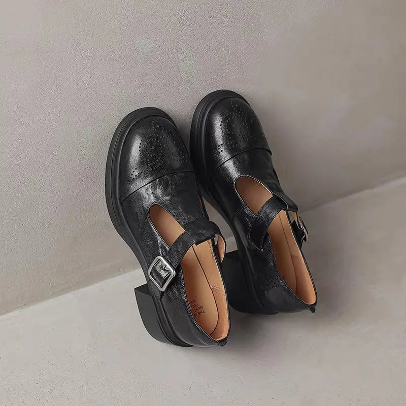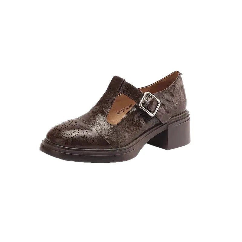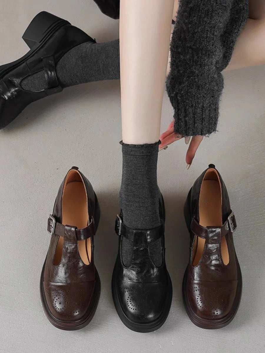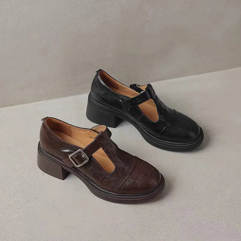Sheepskin Carved and Hollowed out Mary Jane Thick soled Mid heel Round toed L...