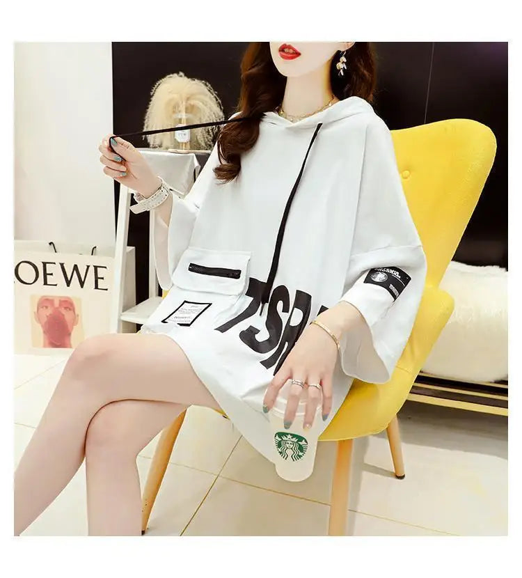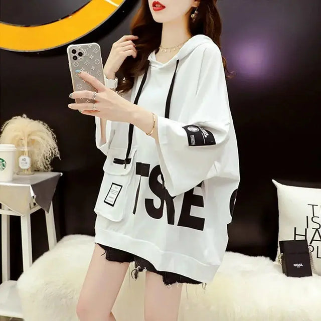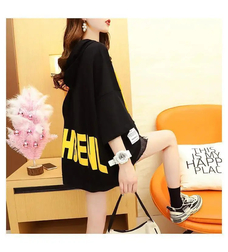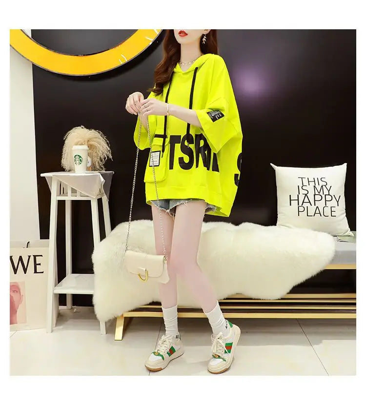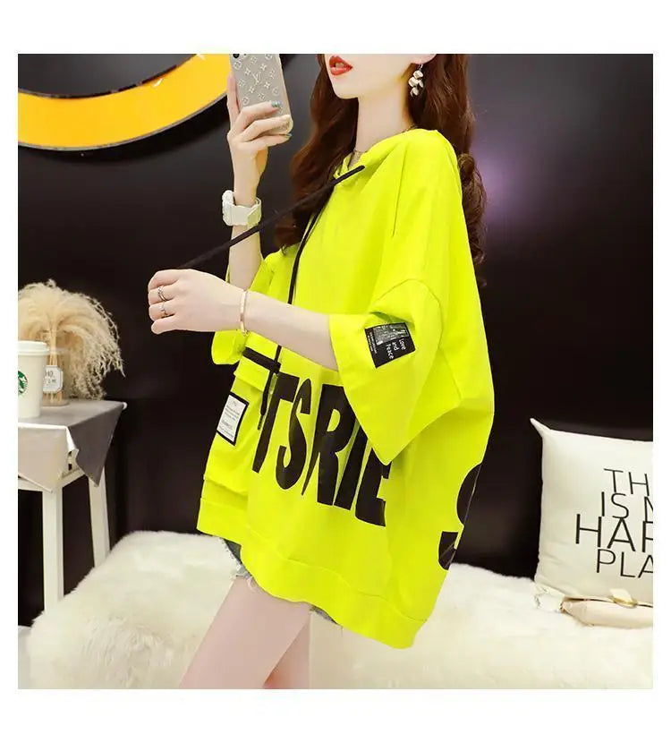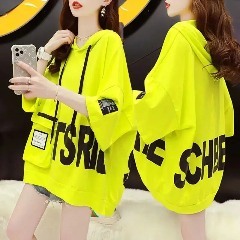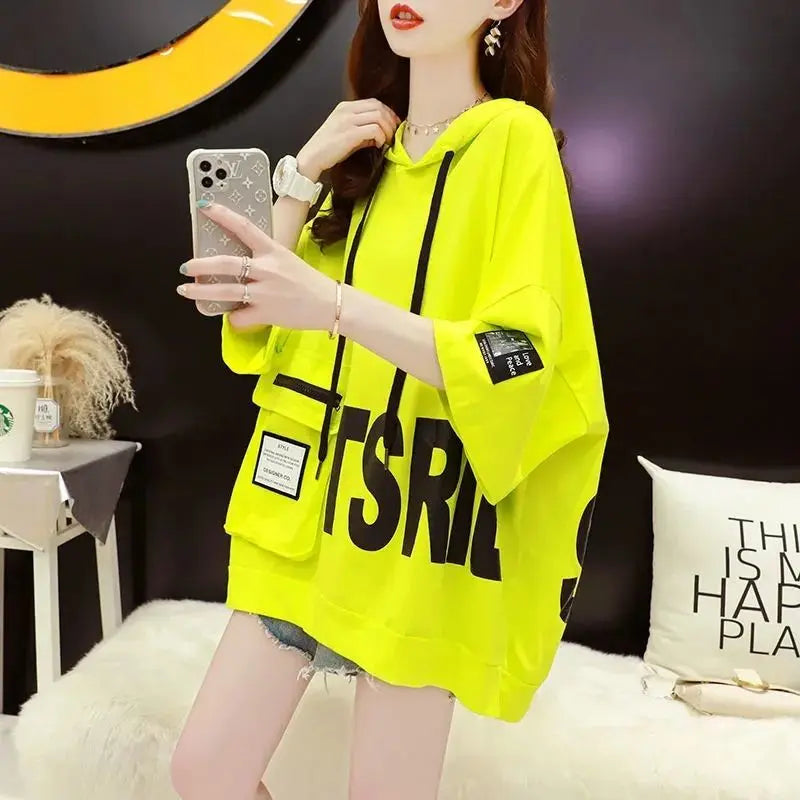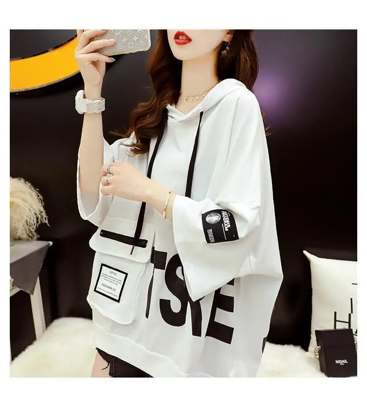 Summer New Hooded Fashion Half Sleeve T-shirt Women High Street Casual Loose Pullovers Pocket Patchwork P...