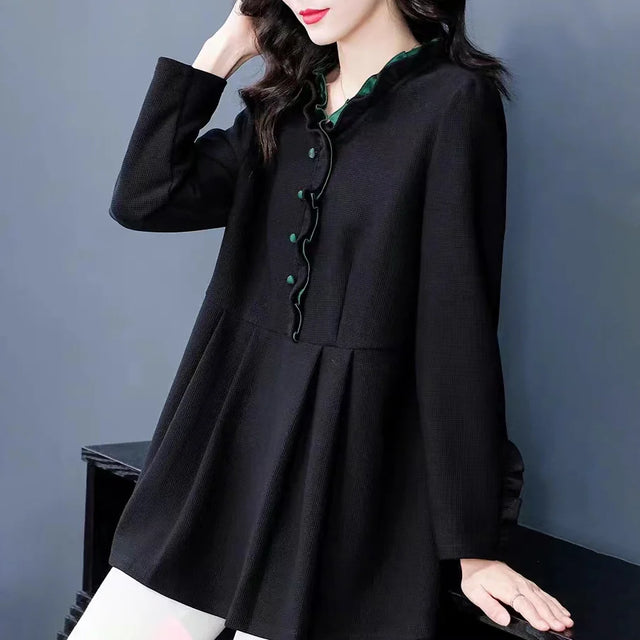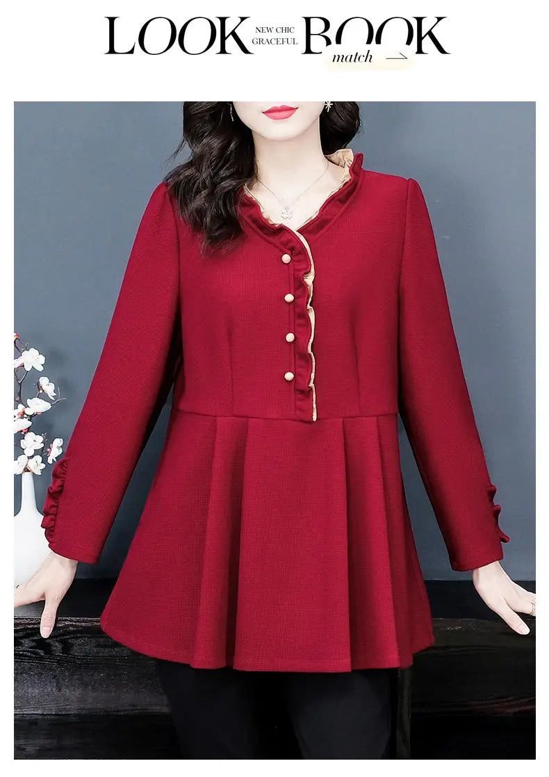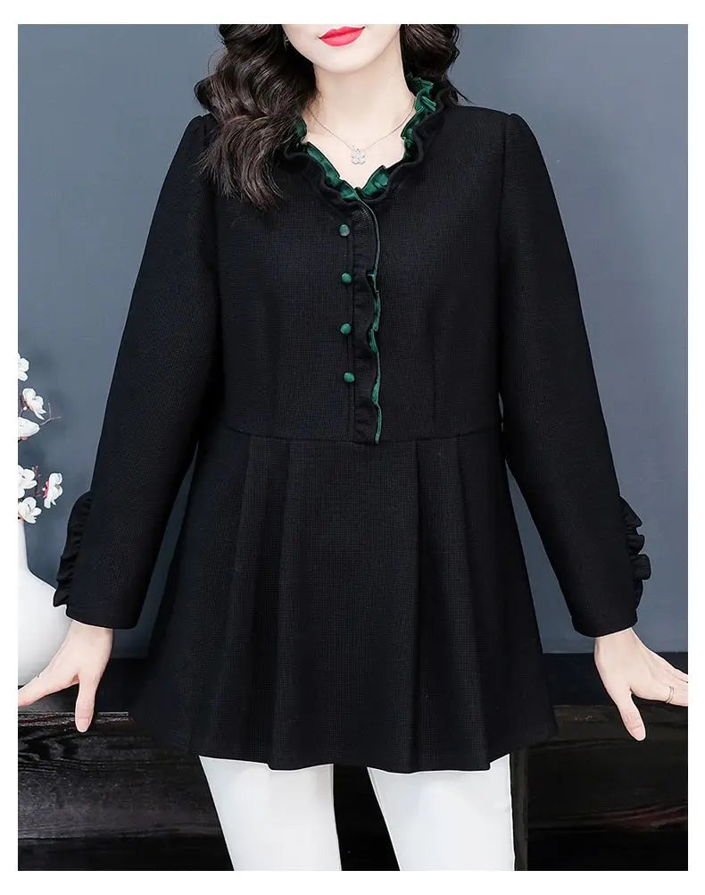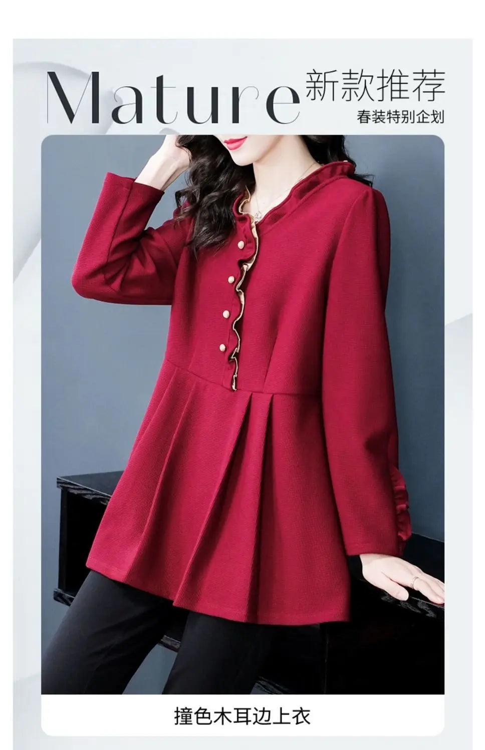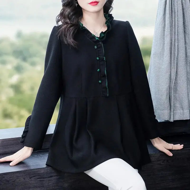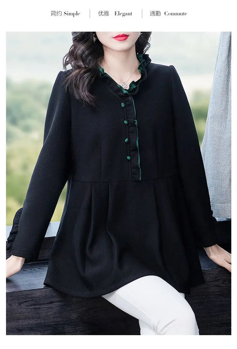 Women's V-Neck Spring New Arrival Shirt with Ruffle and Color-Blocking Slimming
