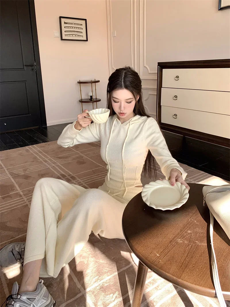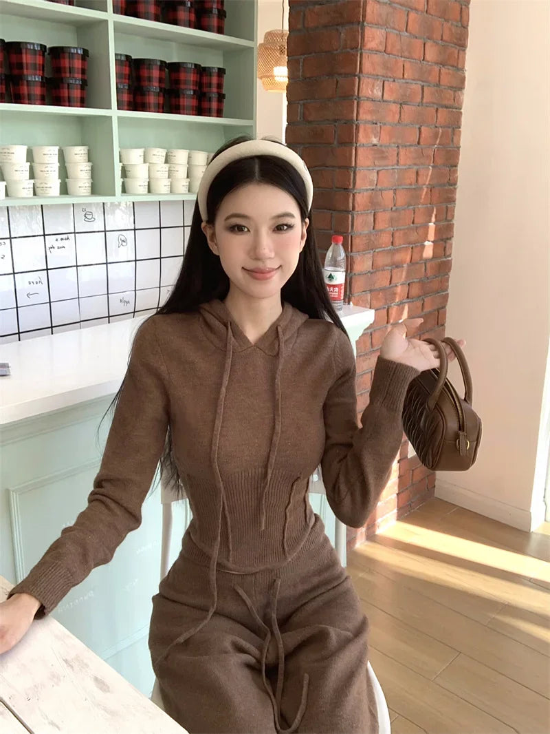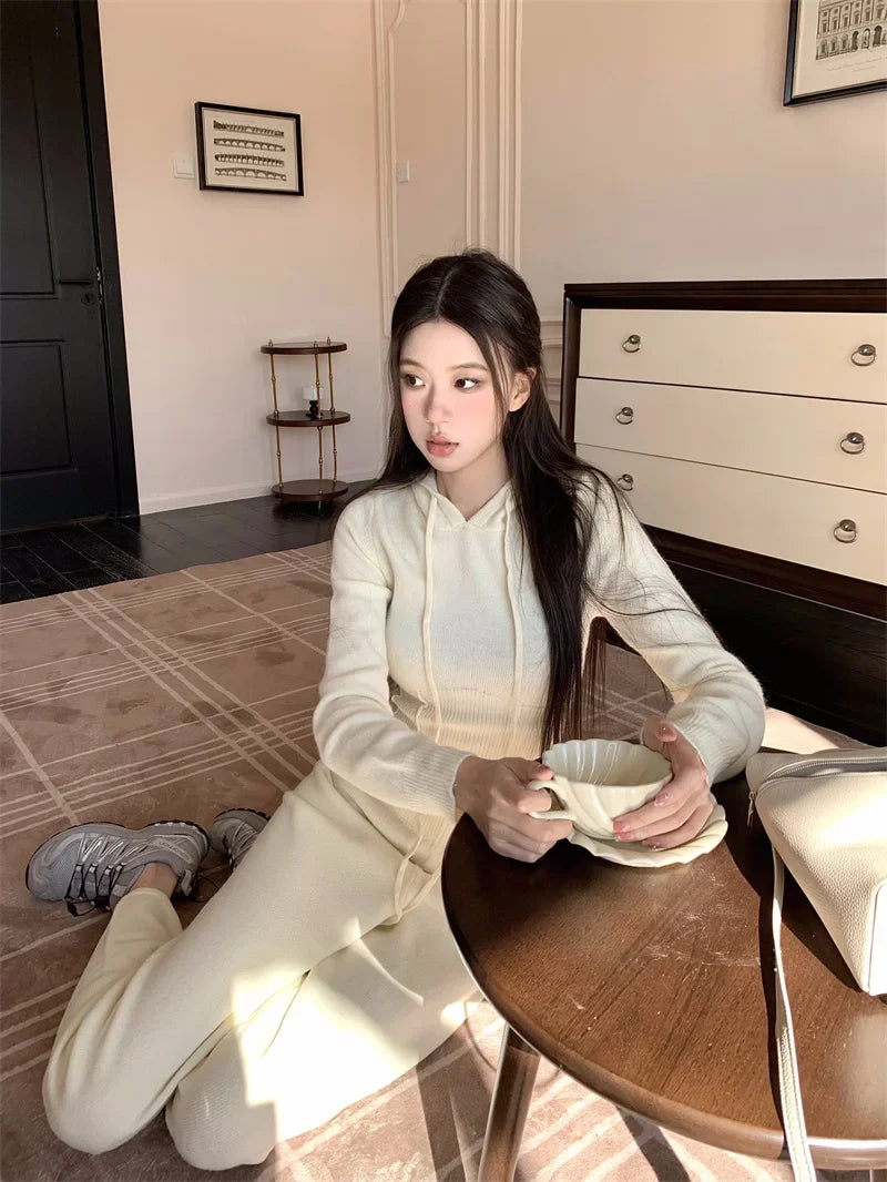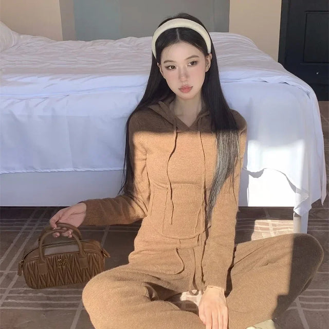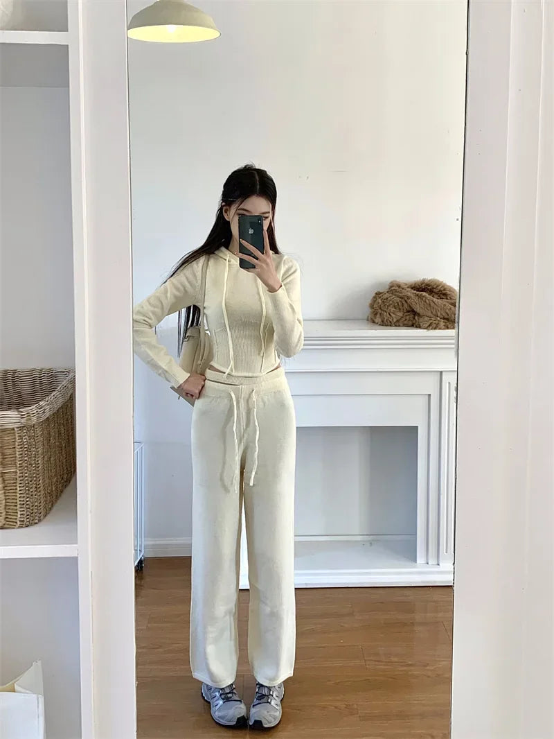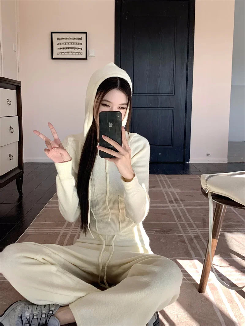 Wool Suit Woman Hooded Pullover Autumn Winter Knitted Two-pieces High Waist Trousers Fashion Solid Color Sweater Pants Female