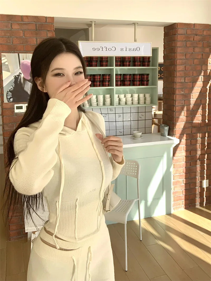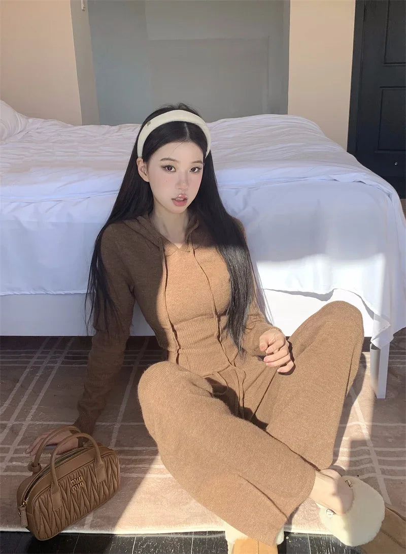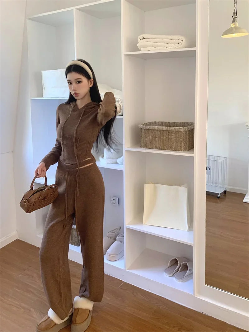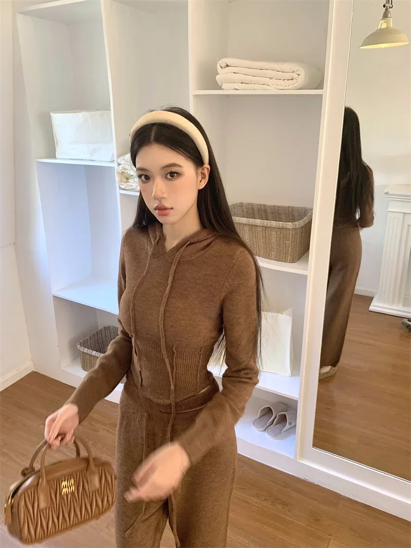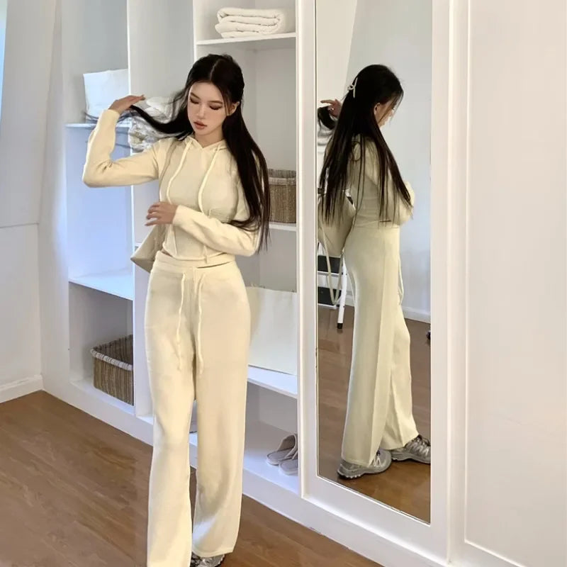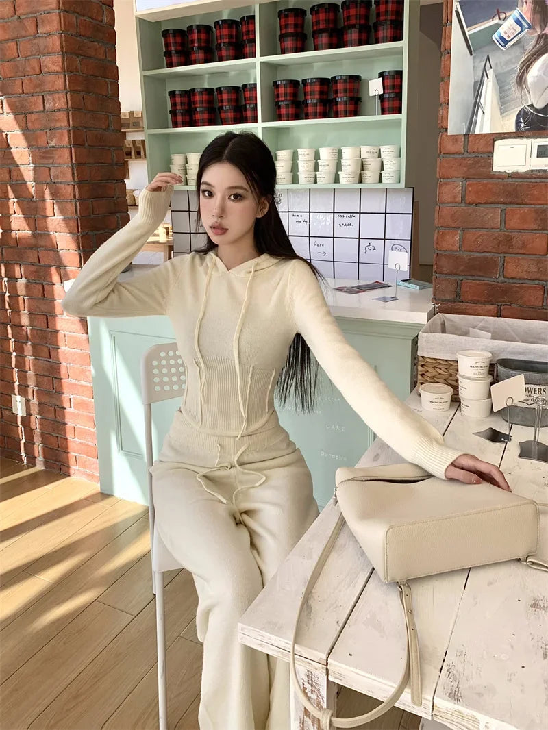 Wool Suit Woman Hooded Pullover Autumn Winter Knitted Two-pieces High Waist Trousers Fashion Solid Color Sweater Pants Female
