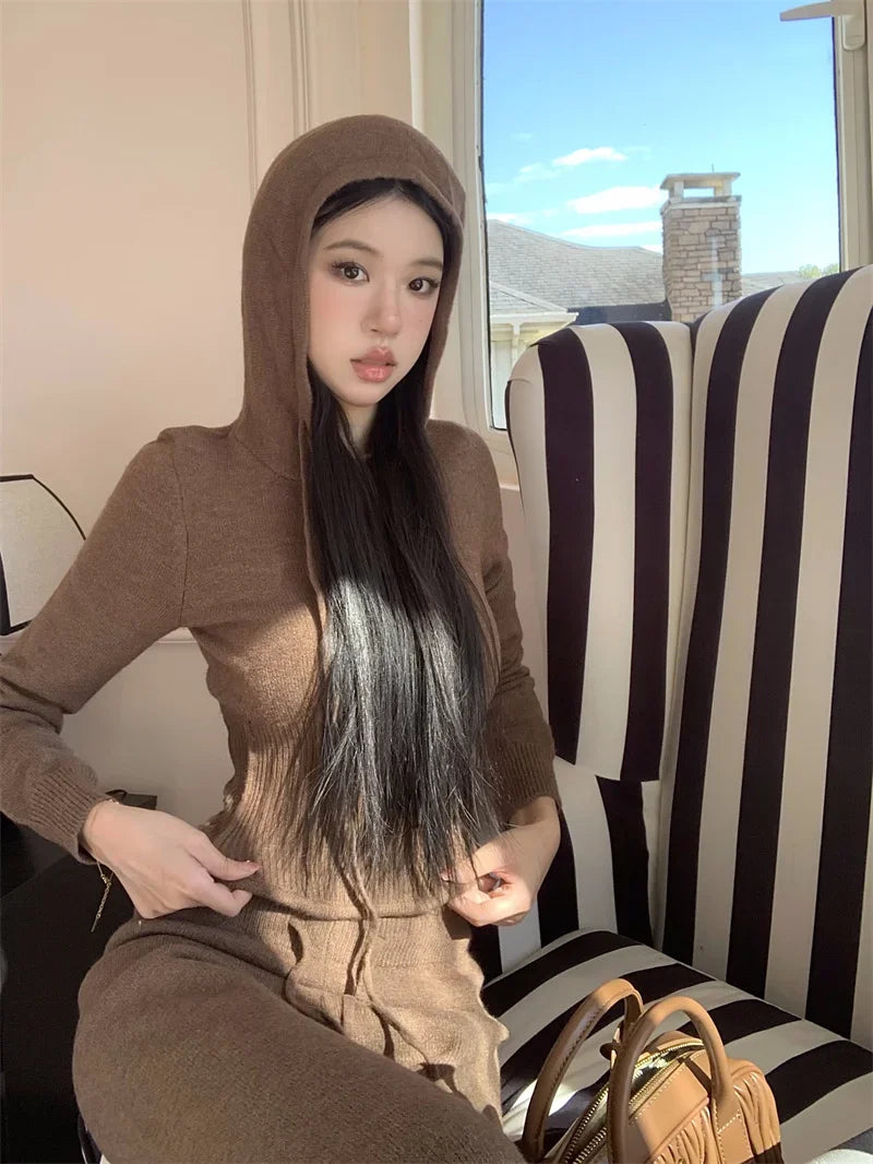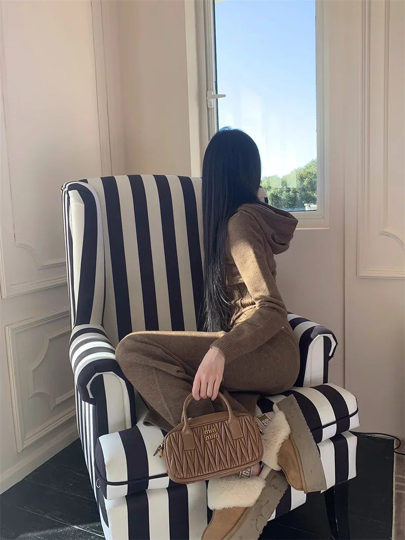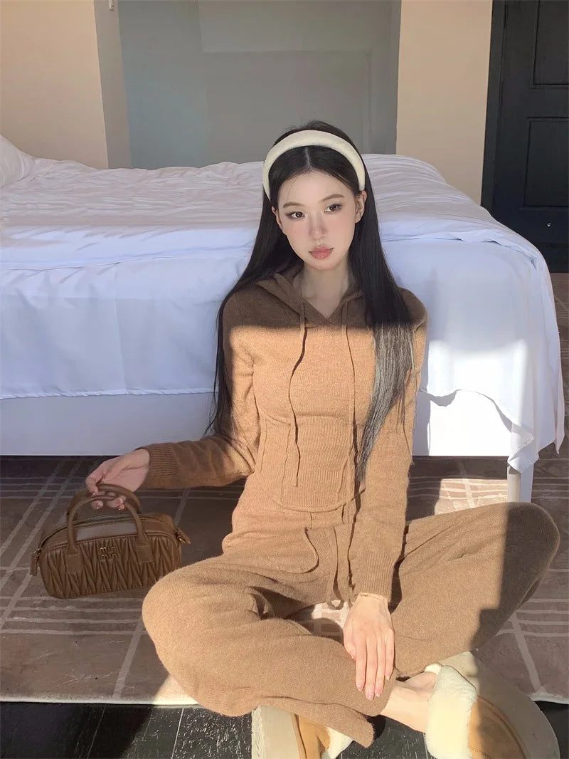 Wool Suit Woman Hooded Pullover Autumn Winter Knitted Two-pieces High Waist Trousers Fashion Solid Color ...