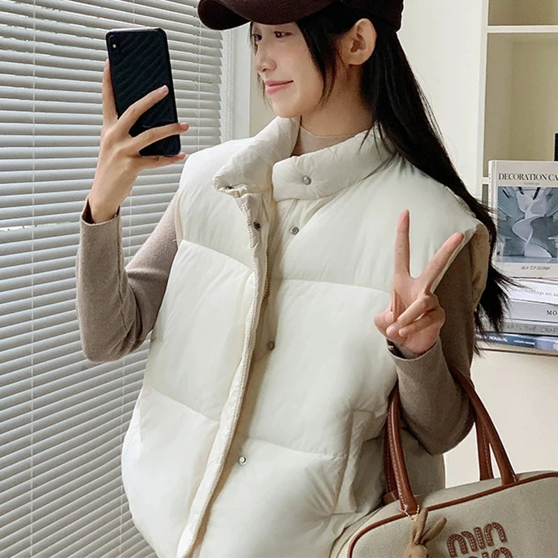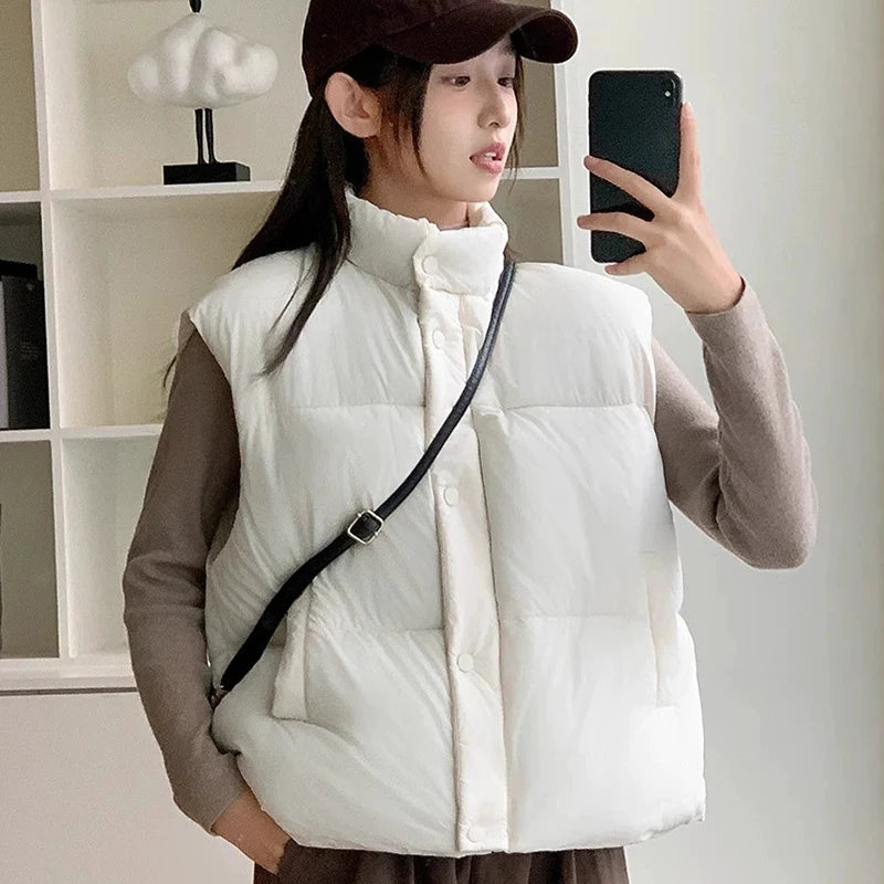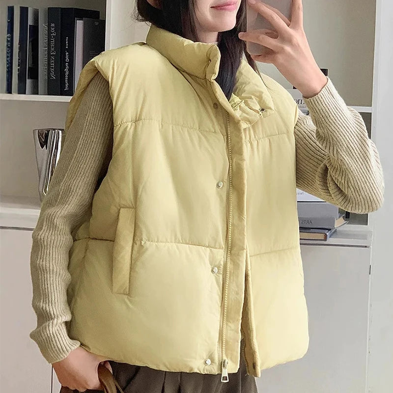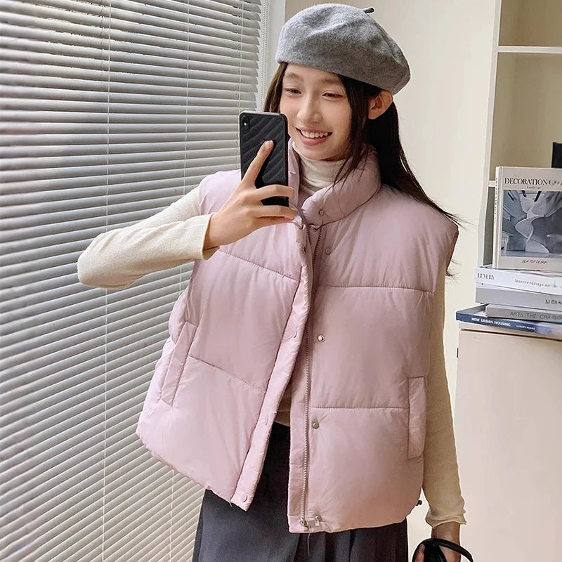 Zipper Up Sleeveless Cotton Vest Women Winter Korean Turn Down Collar Parkas