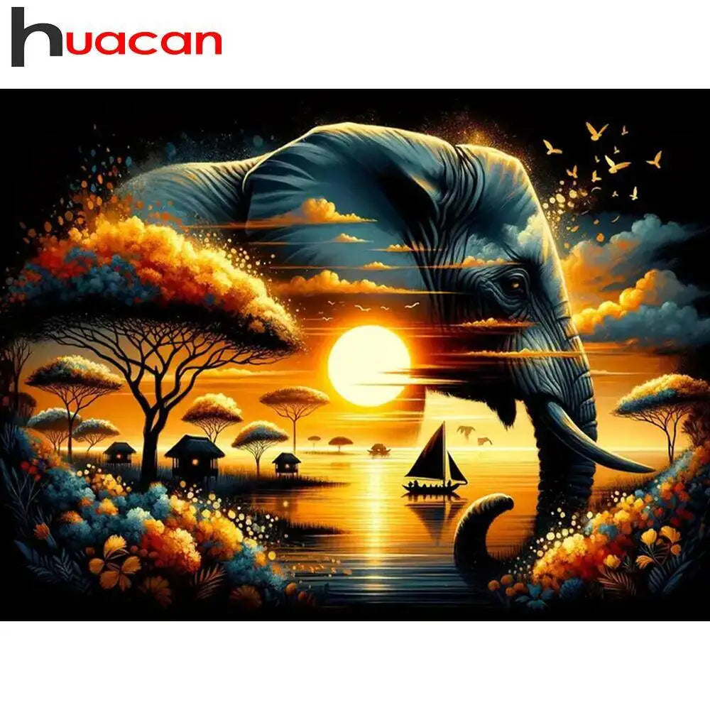 Huacan Diamond Mosaic Elephant Animal Tree Sunset Landscape Full Round Square