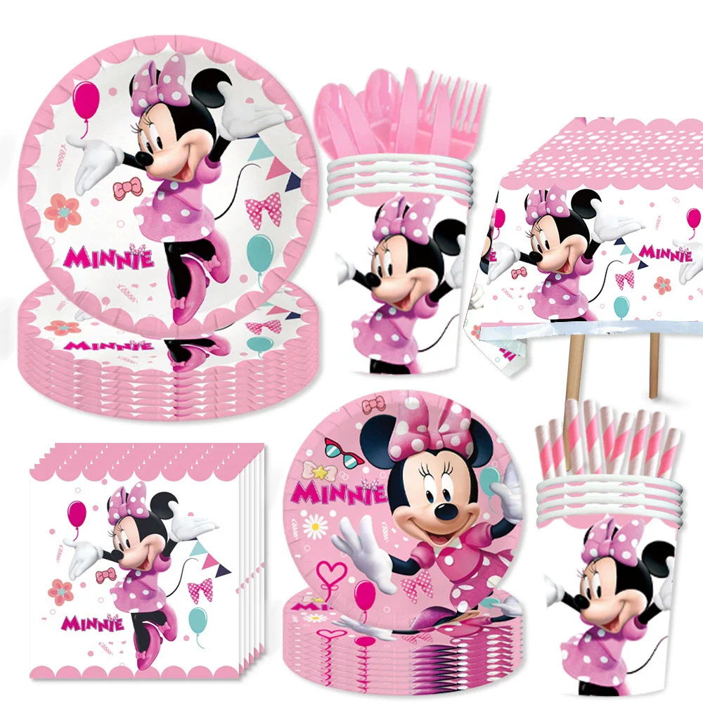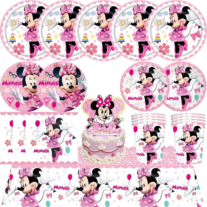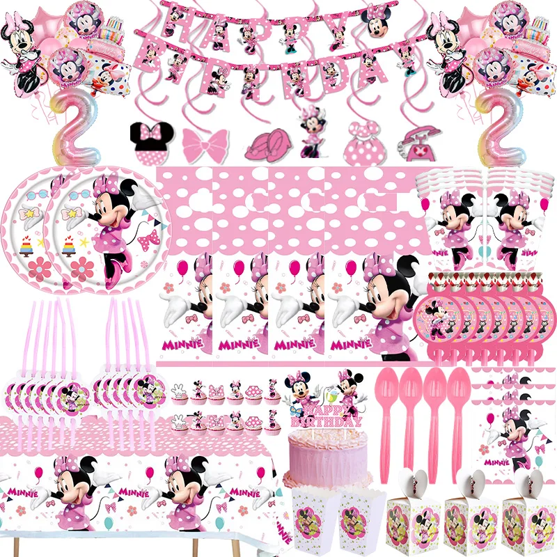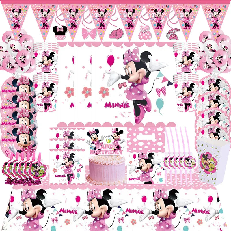 Girl Minnie Mouse Birthday Decpration Party Set Pink Minnie Balloon Gift Bag Tablecloth Tableware Plate Minine Party Supplies