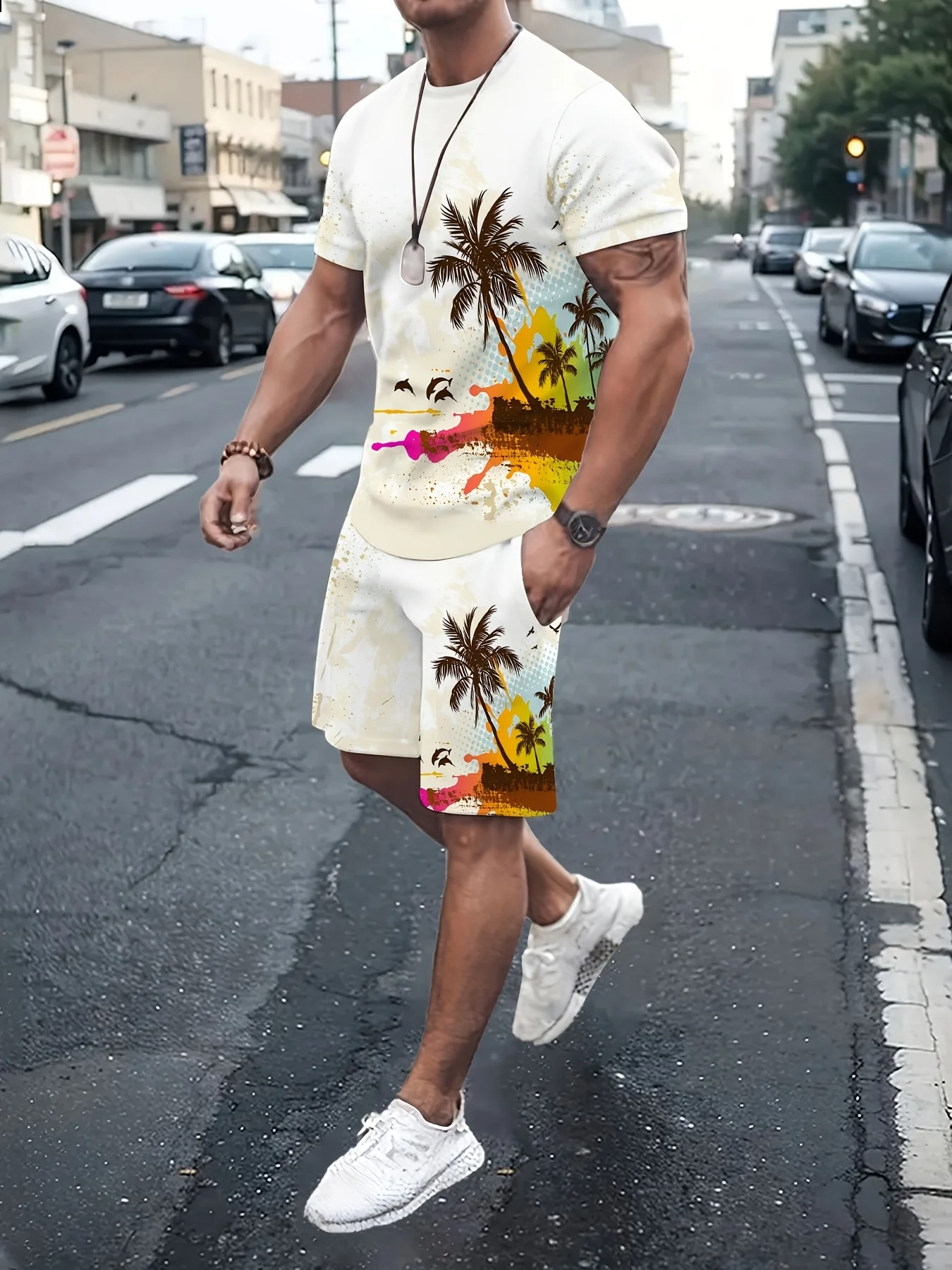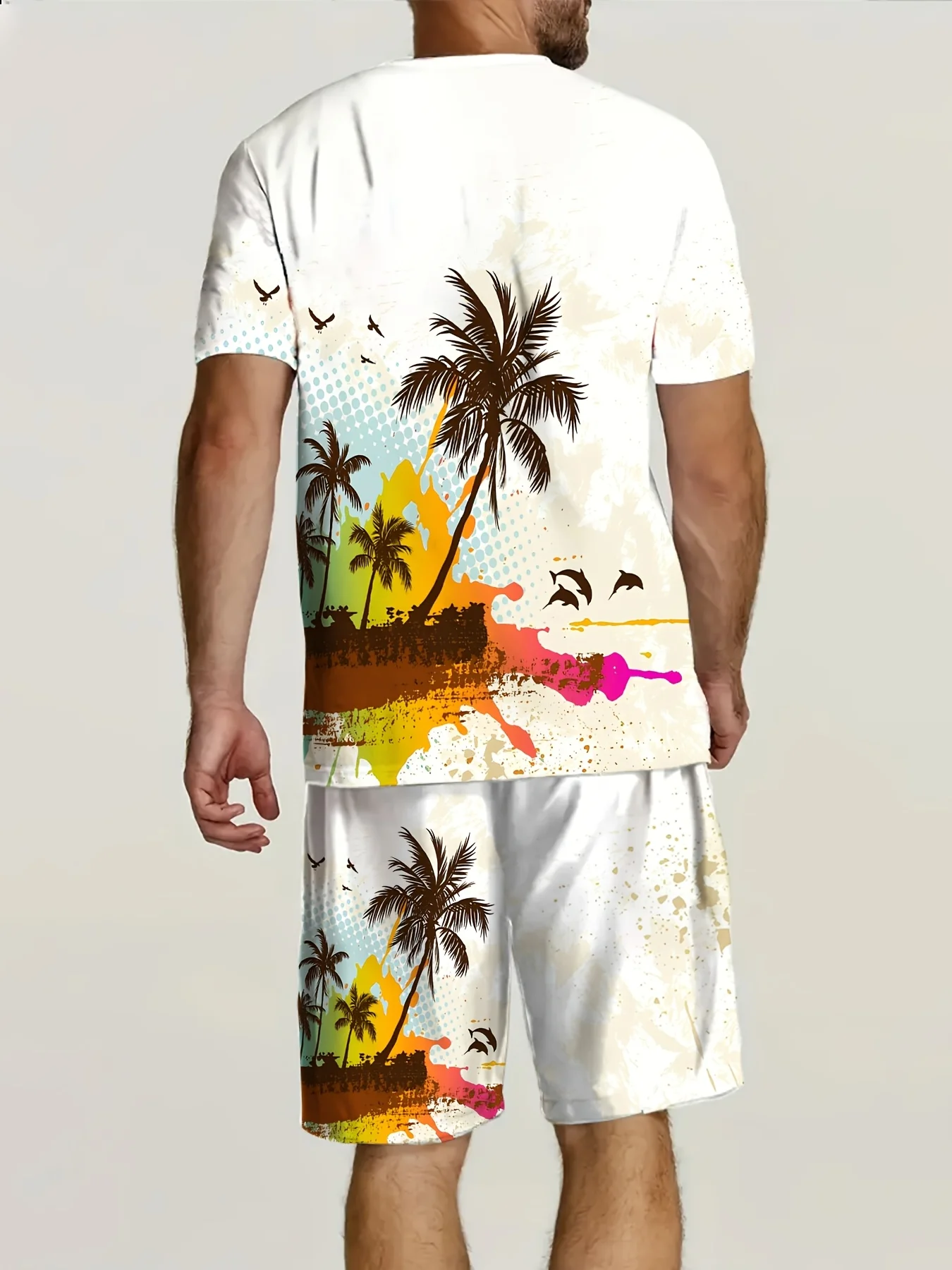 Summer 2025 new men's casual short-sleeved suit with coconut tree sailboat print, casual and fashionable ...