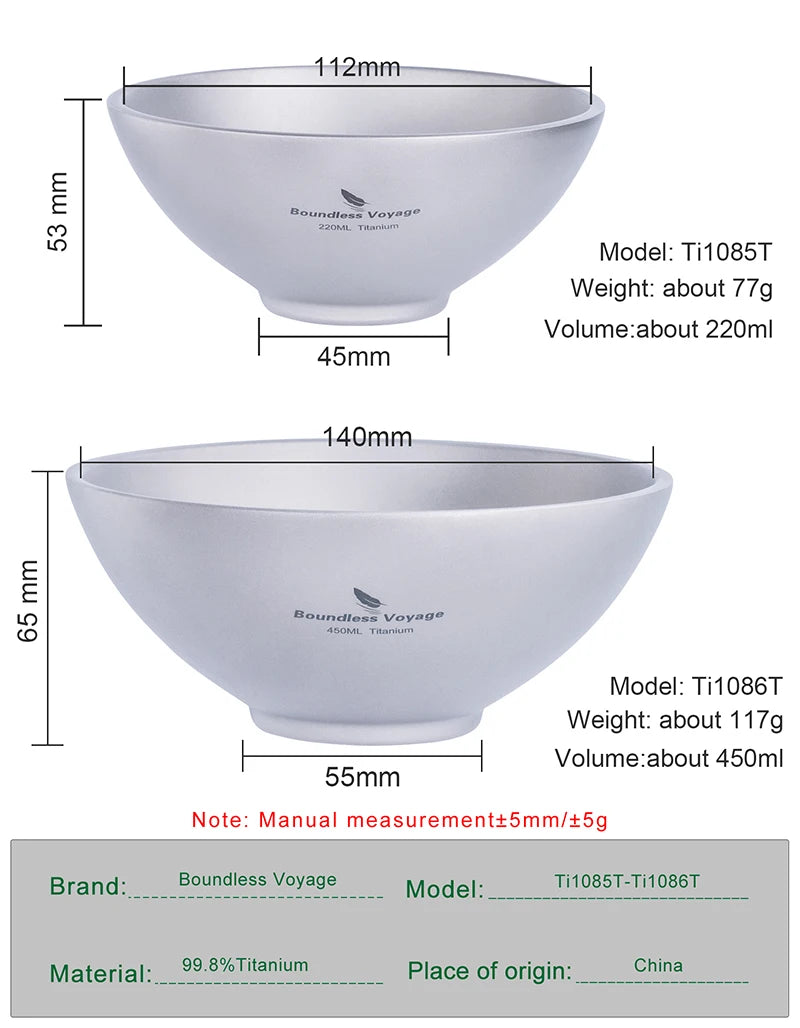 Boundless Voyage Titanium Bowl 220ml 450ml Double Wall Camping Cup Ultralight