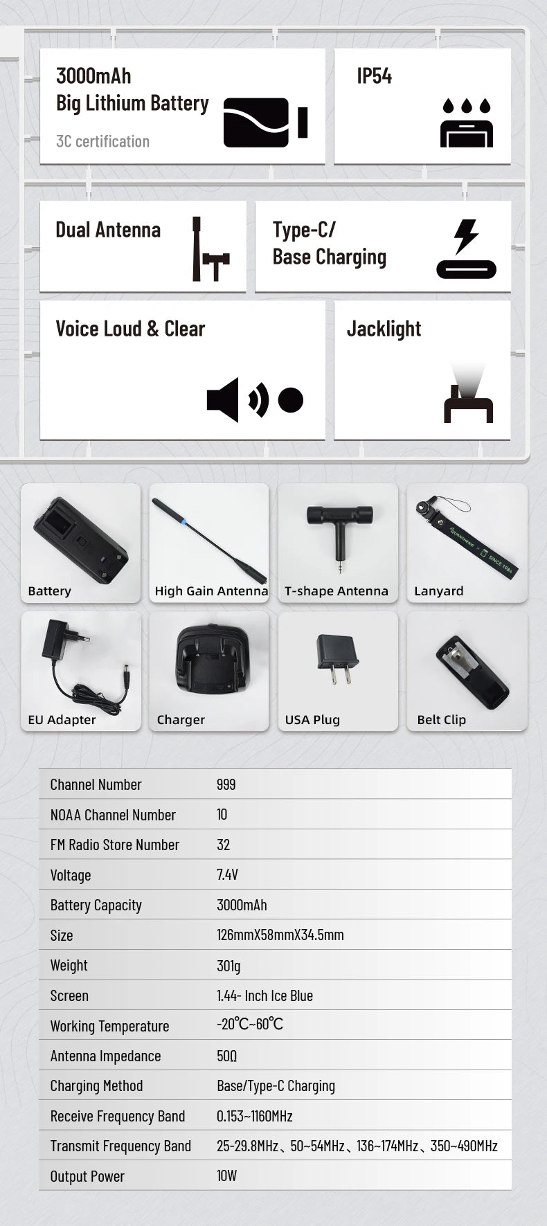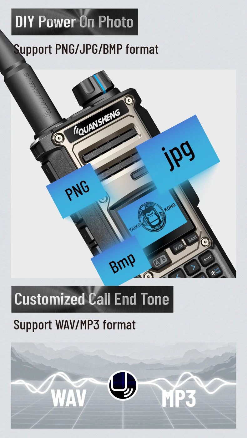 🎛️ Exclusive Bonus Functions✔ DIY Power-On Photo (Supports PNG/JPG/BMP) – Personalize your device!✔ Custom Call End Tones (Supports WAV/MP3) – Make it uniquely yours.✔ Telegraph & AM/SSB Receiving – Perfect for amateur radio enthusiasts.✔ Field Strength Meter & 5-Tone Select Call – Enhanced communication control.✔ 999 Channels & PC Programmable – Store and manage frequencies effortlessly.✔ CTCSS/DCS, VOX, DTMF ANI – Advanced signaling and hands-free operation.