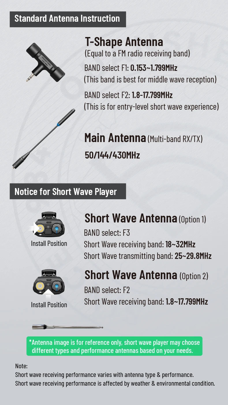 High-Gain Antenna (50/144/430MHz) + T-Shape Antenna (0.153–18MHz)