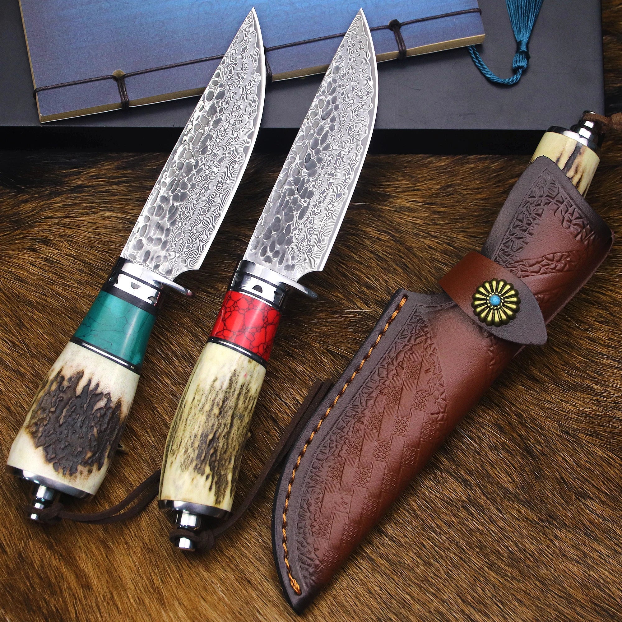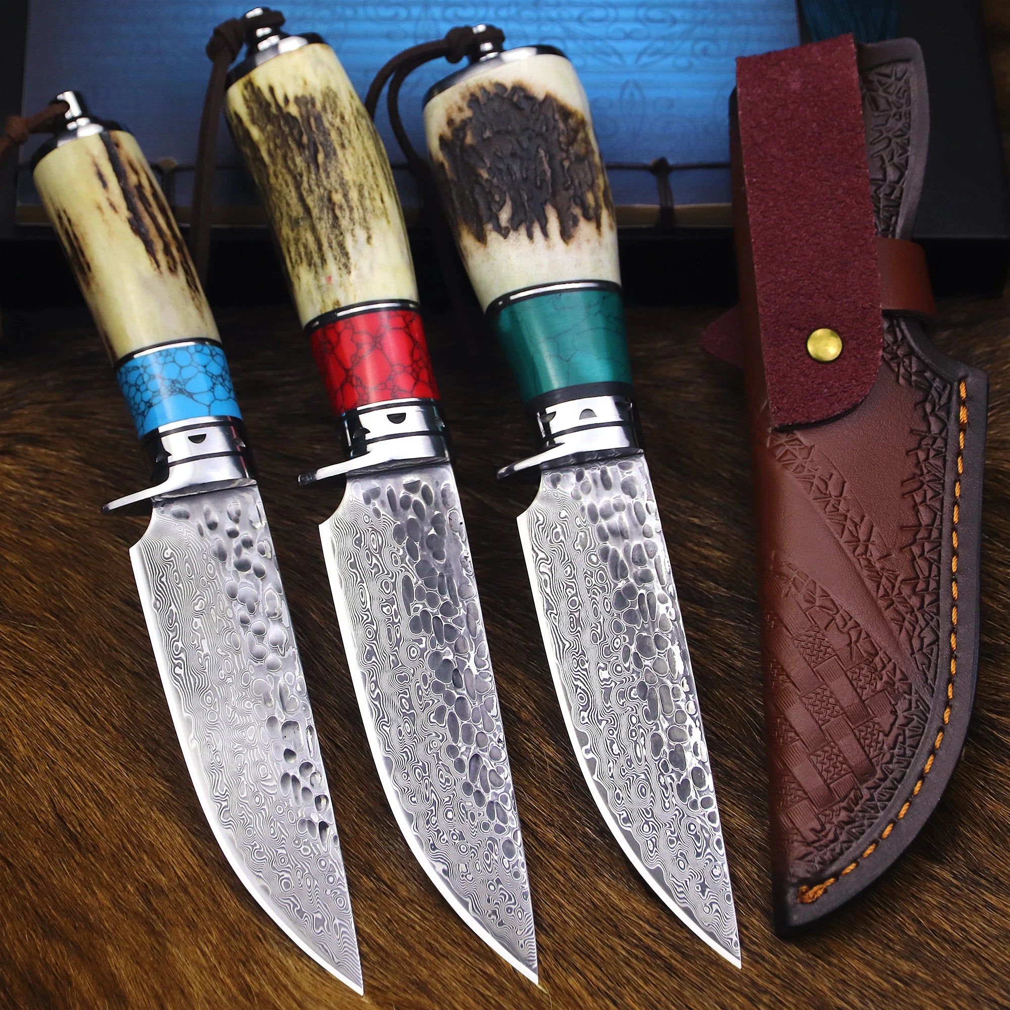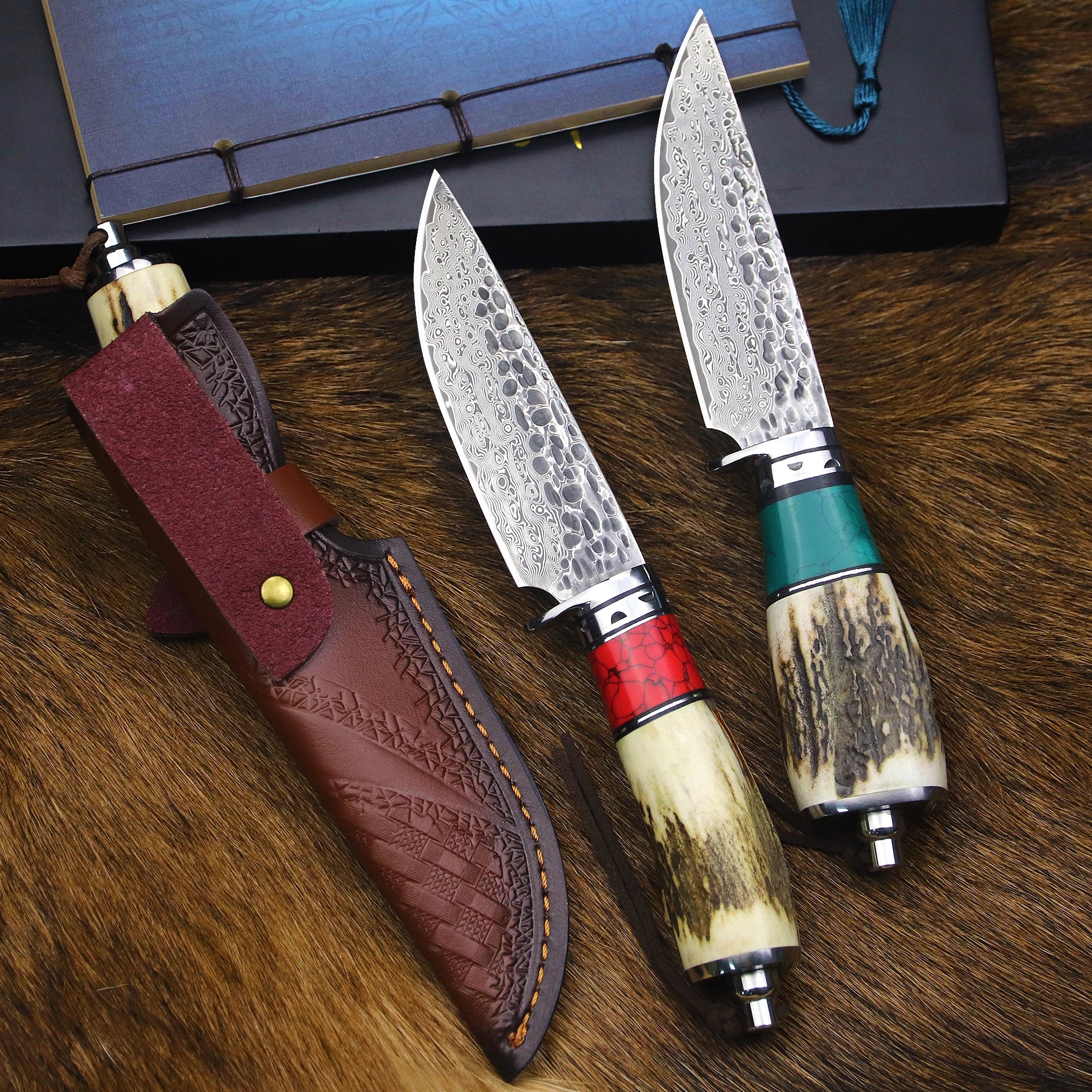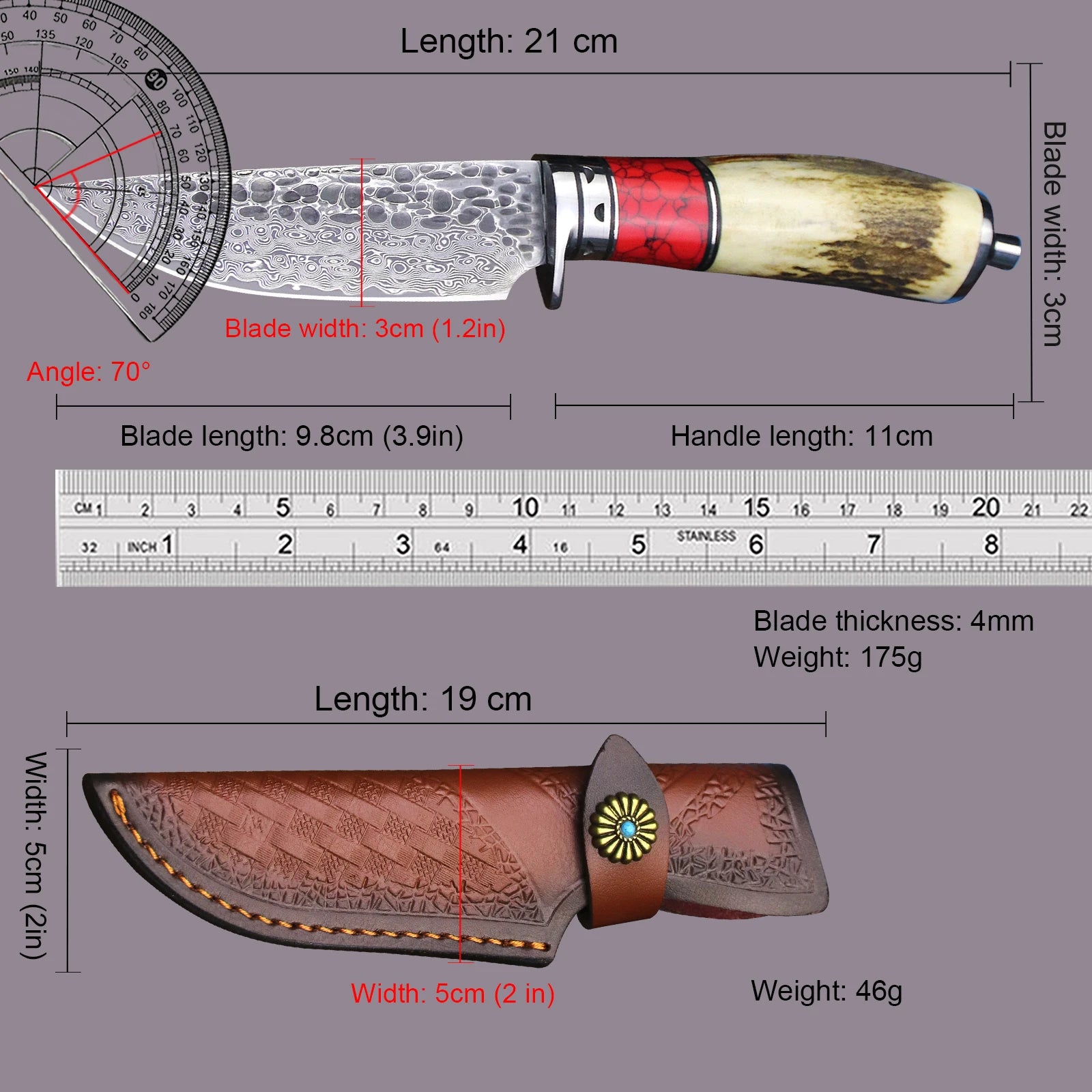 Wpkopya Japanese Damascus Steel G10 Steel Core Hunting Knife with Leather
