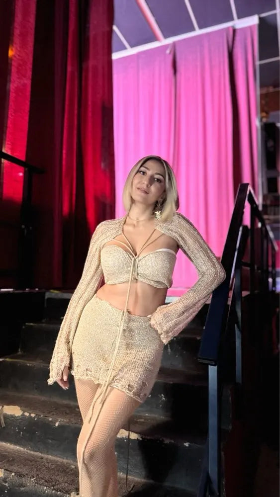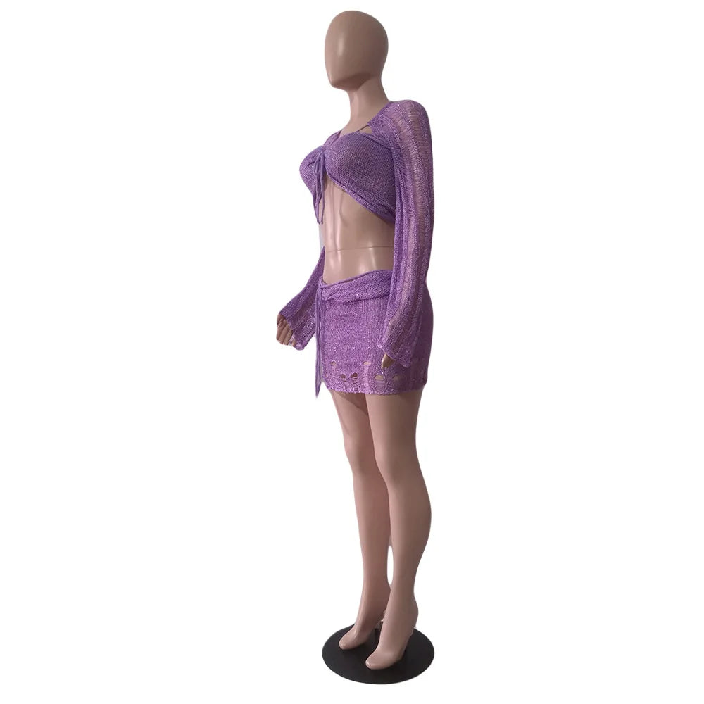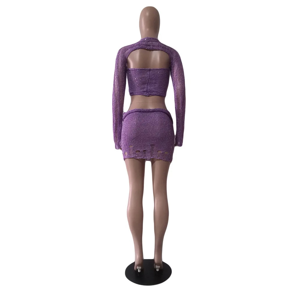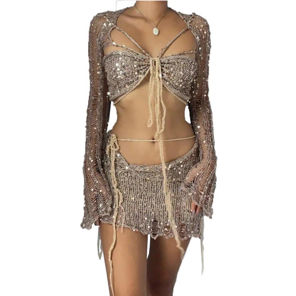 Three Pieces Sweater Dresses Sets For Women Party Sequins Hollow Out Knitted Dress Long Sleeve Crop Top and Bra and Skirts