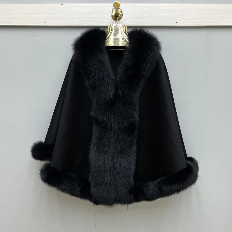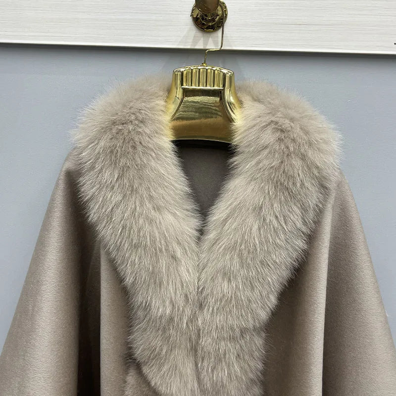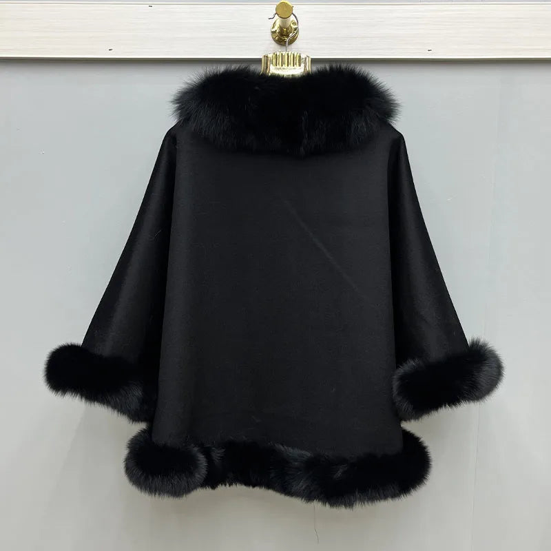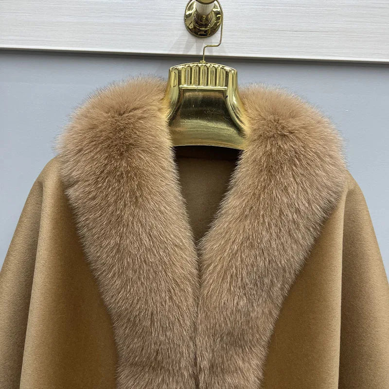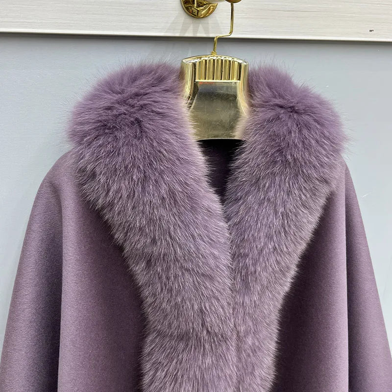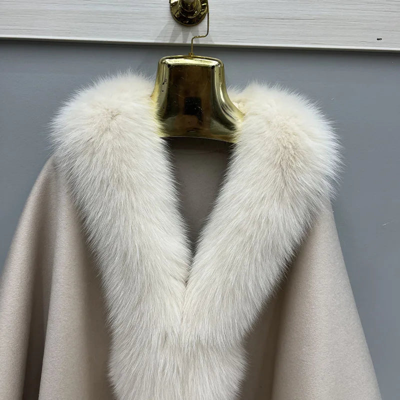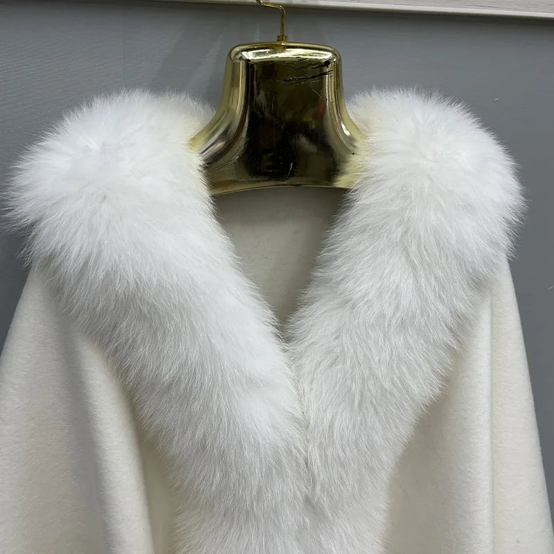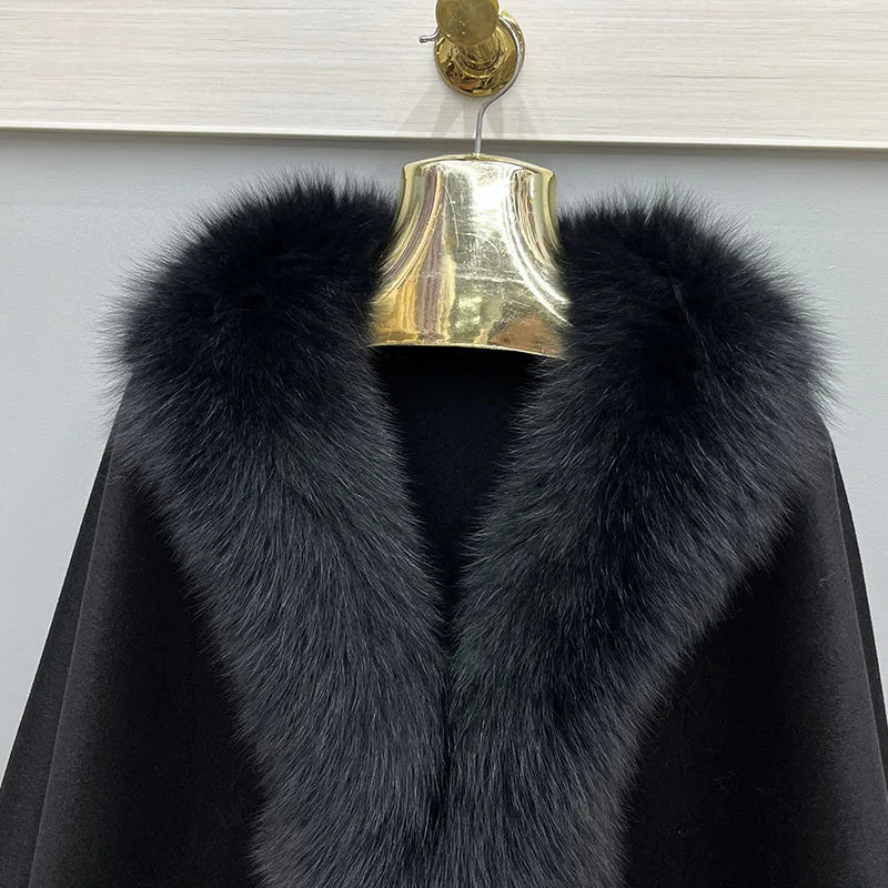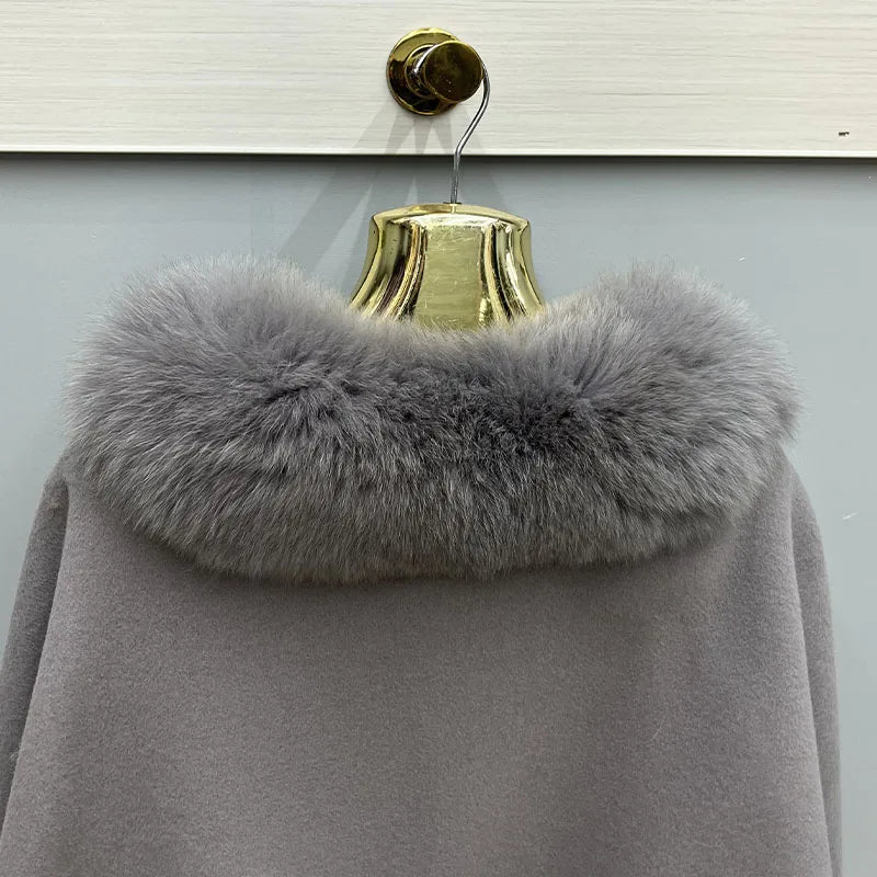 2023 Autumn Winter Women 100% Wool Warm Cardigan Shawl Jacket With Real Fox Fur Collar Ponchos Cloak Outw...