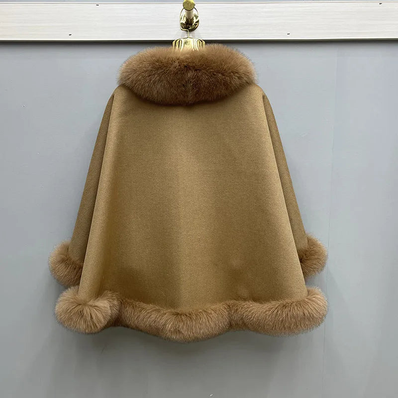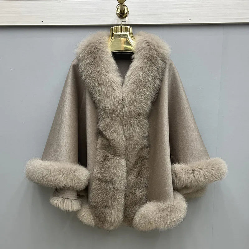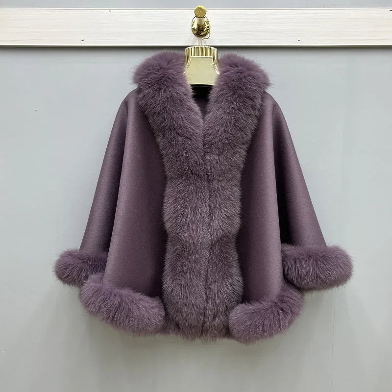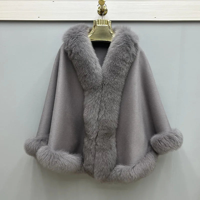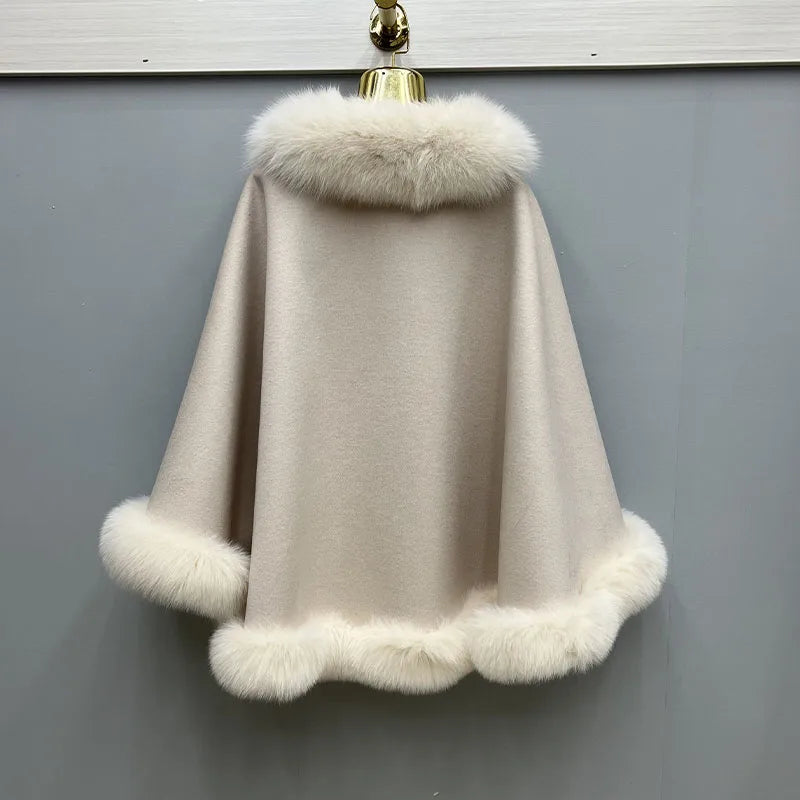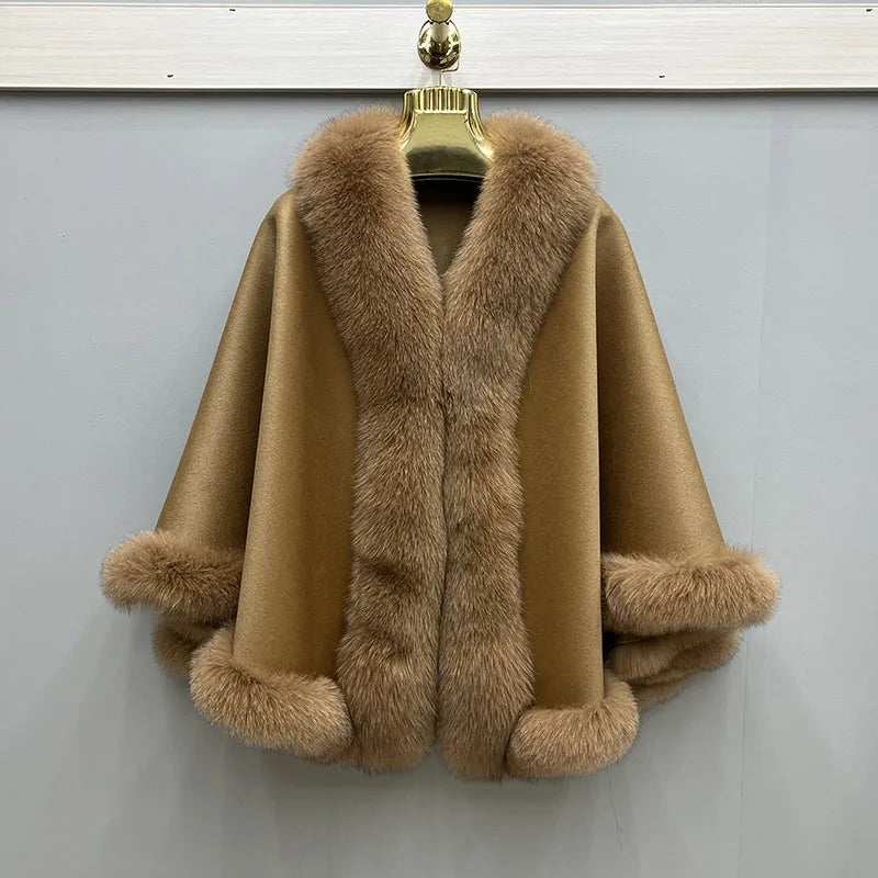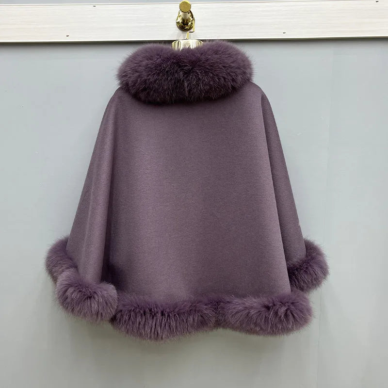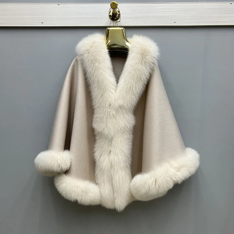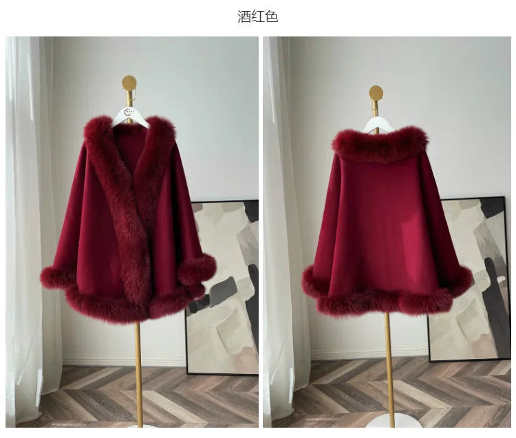 2023 Autumn Winter Women 100% Wool Warm Cardigan Shawl Jacket With Real Fox Fur Collar Ponchos Cloak Outw...