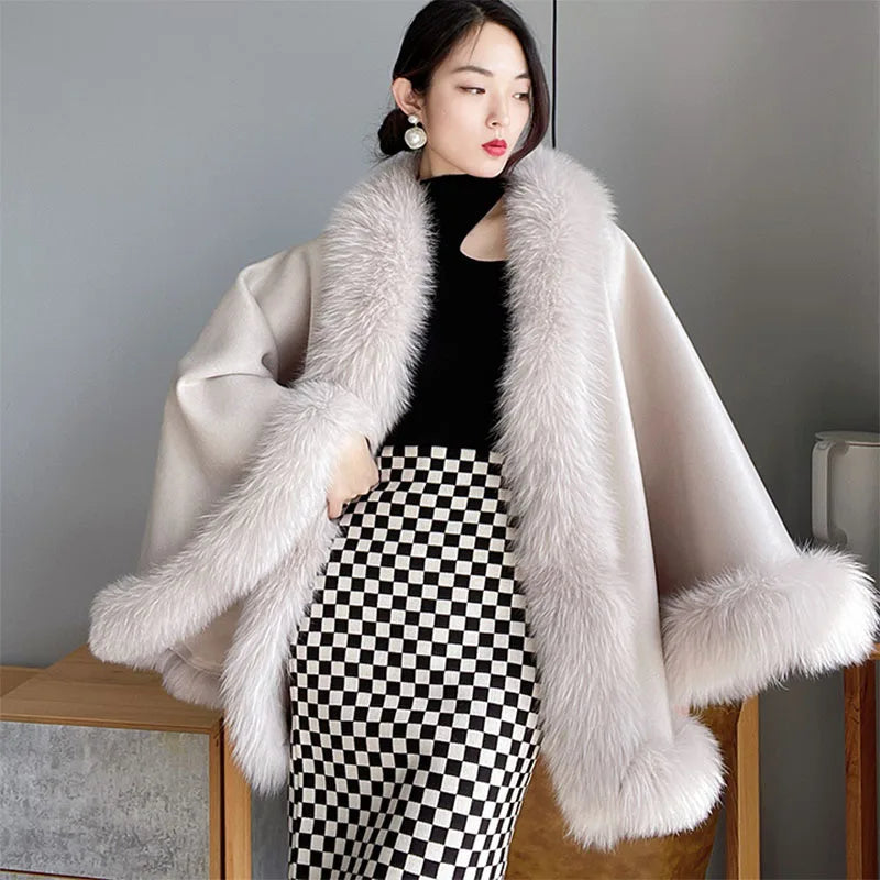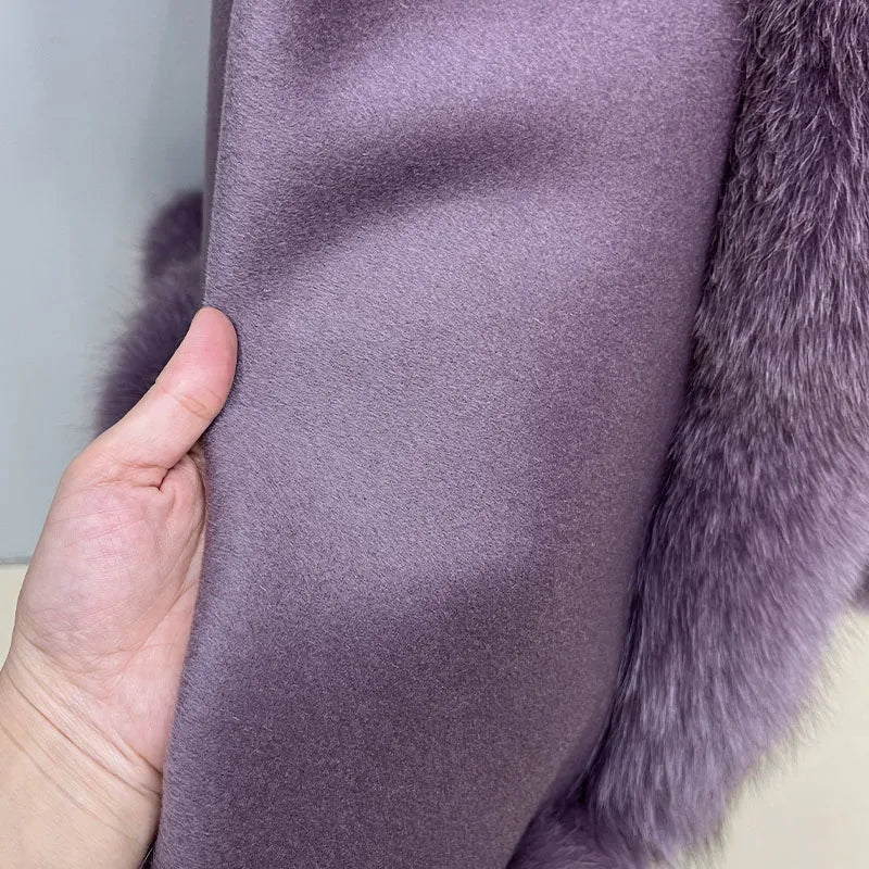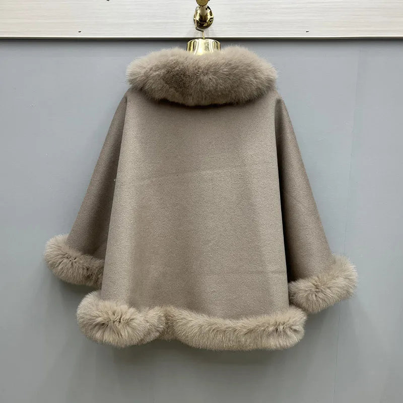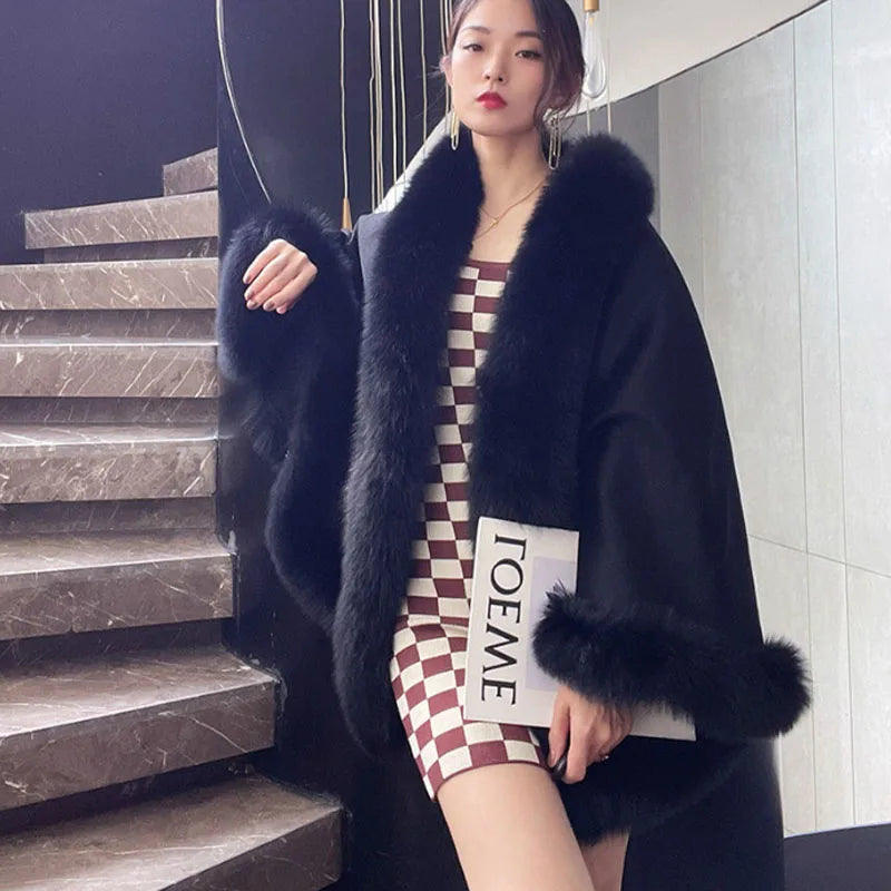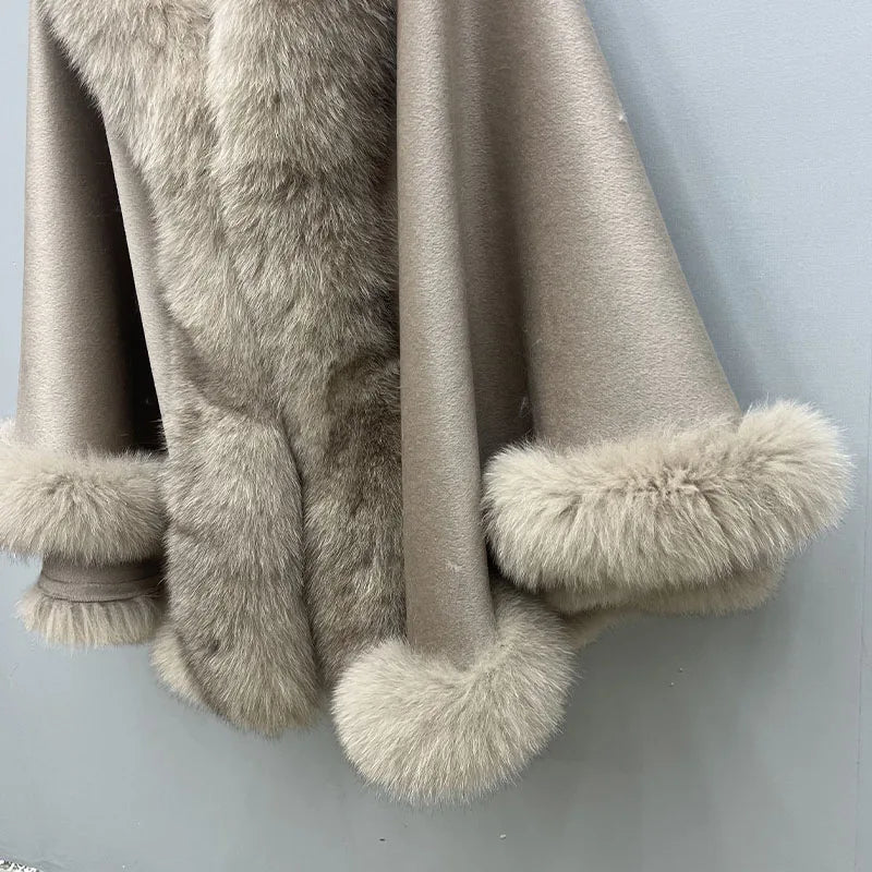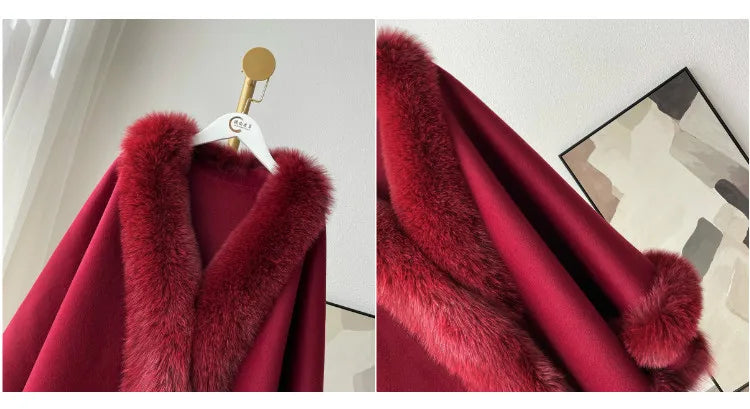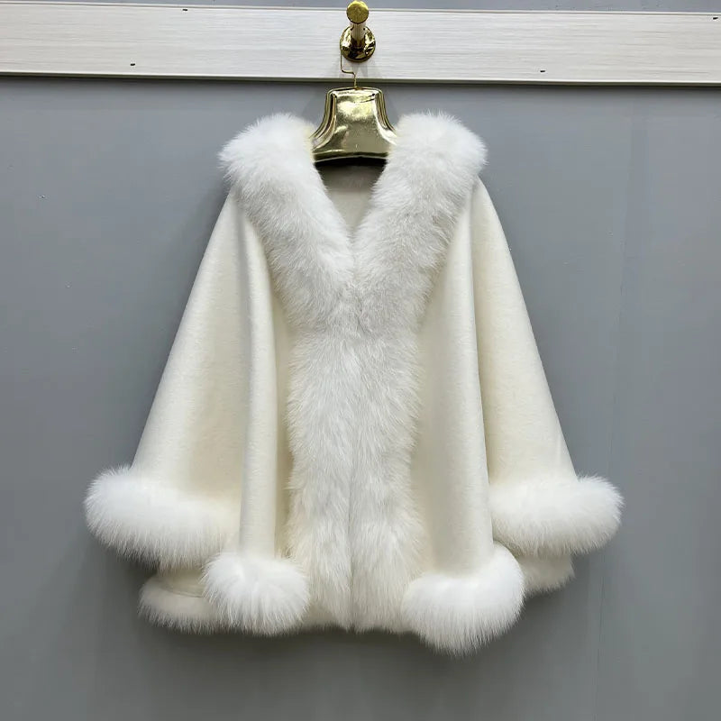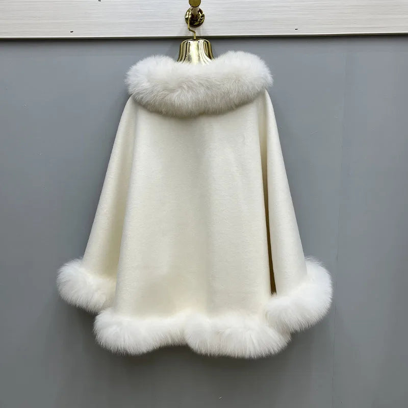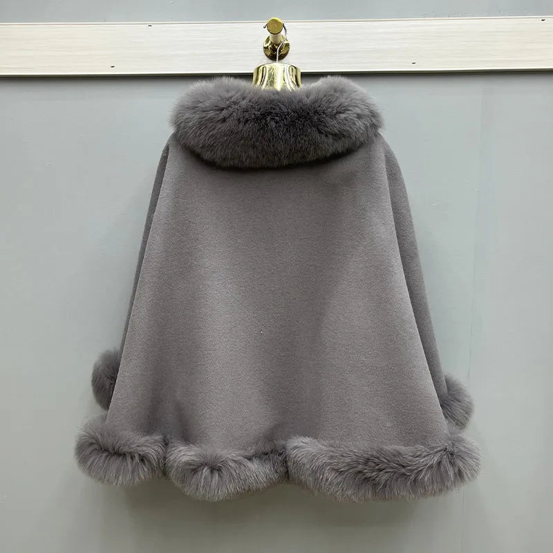 2023 Autumn Winter Women 100% Wool Warm Cardigan Shawl Jacket With Real Fox Fur Collar Ponchos Cloak Outw...