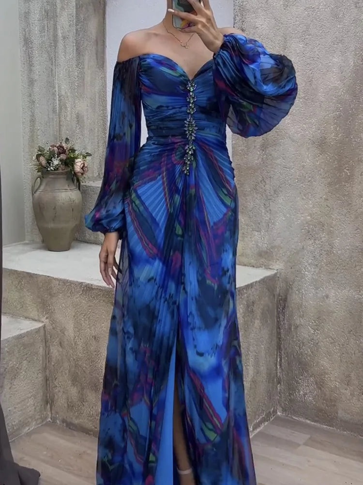 2023 V-Neck Sexy Split Maxi Dress, Spring Autumn Loungewear Fashion Party Dress, Long Sleeve Folds Printi...