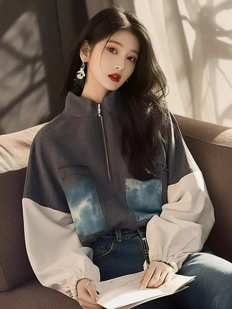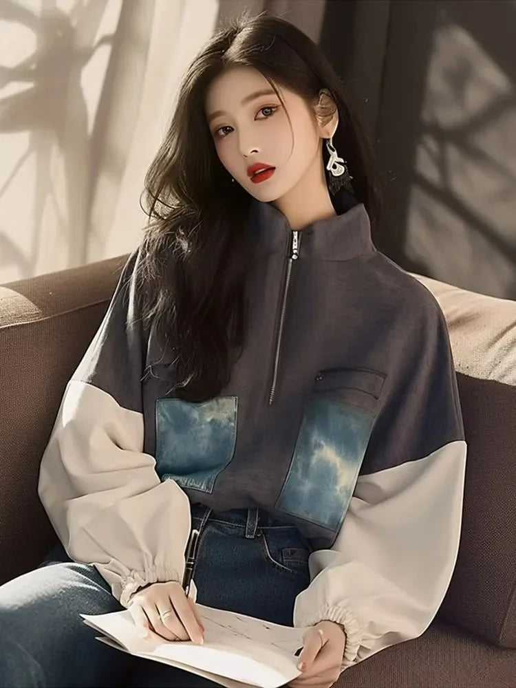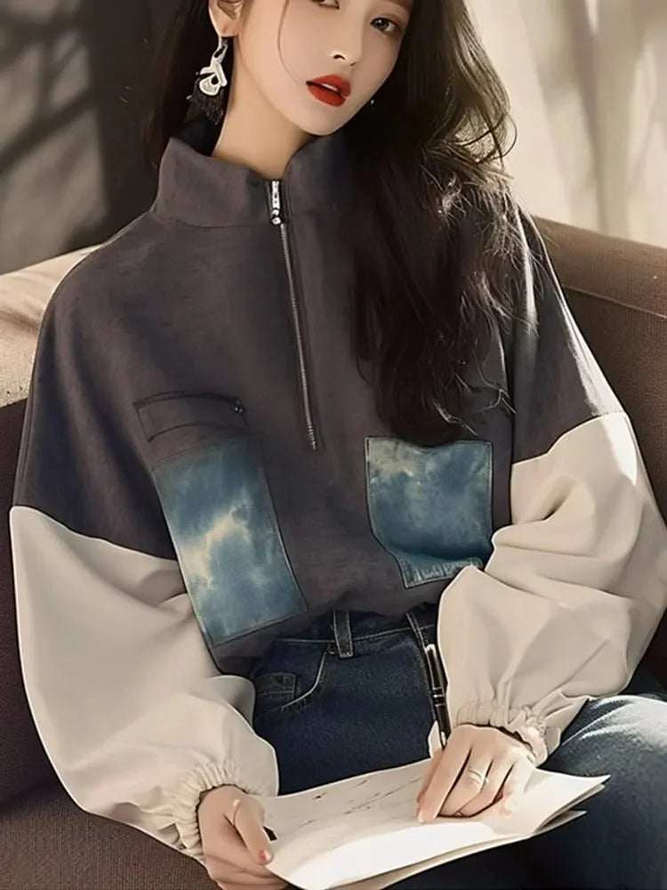 Style Fashion American Chic Loose Gray Printed Stand up Collar Long sleeved S...