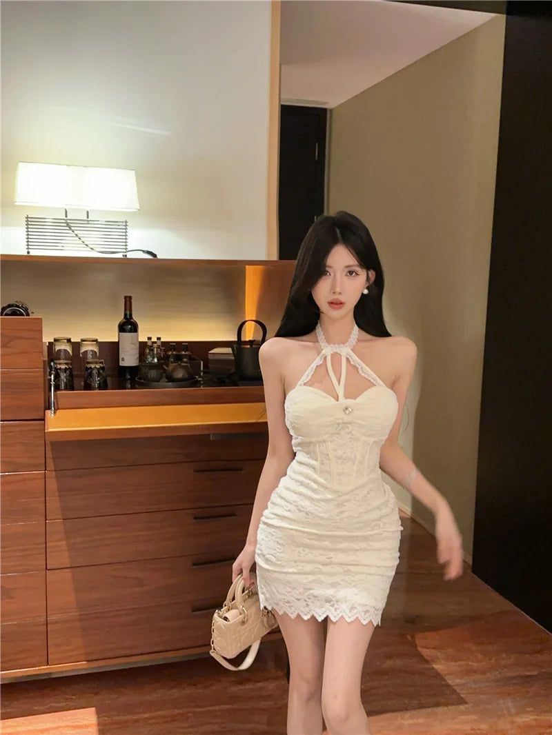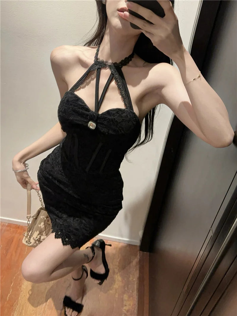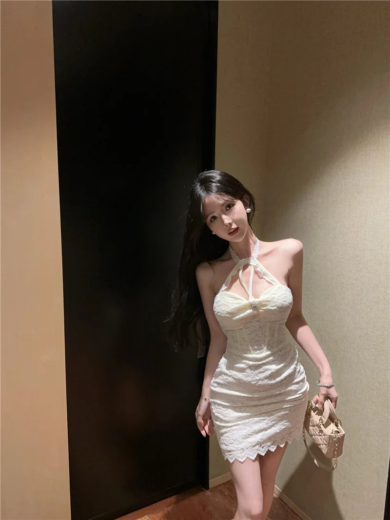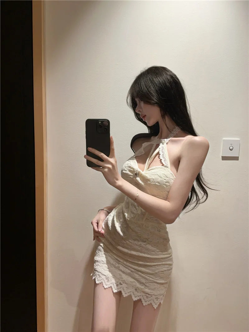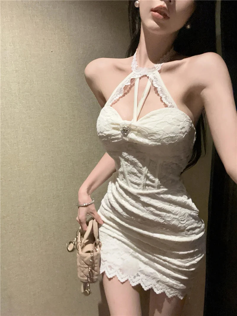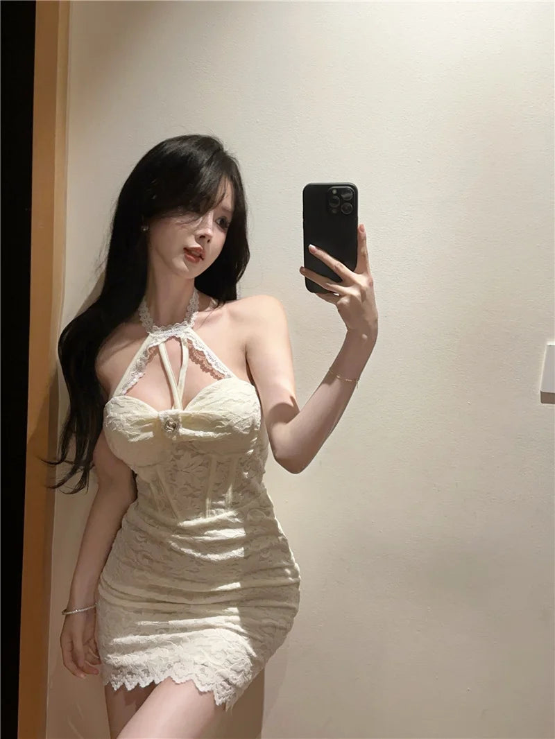 Woman Dress Sexy Elegant Lace Patchwork Hollow Out Sleeveless Slim Bandage