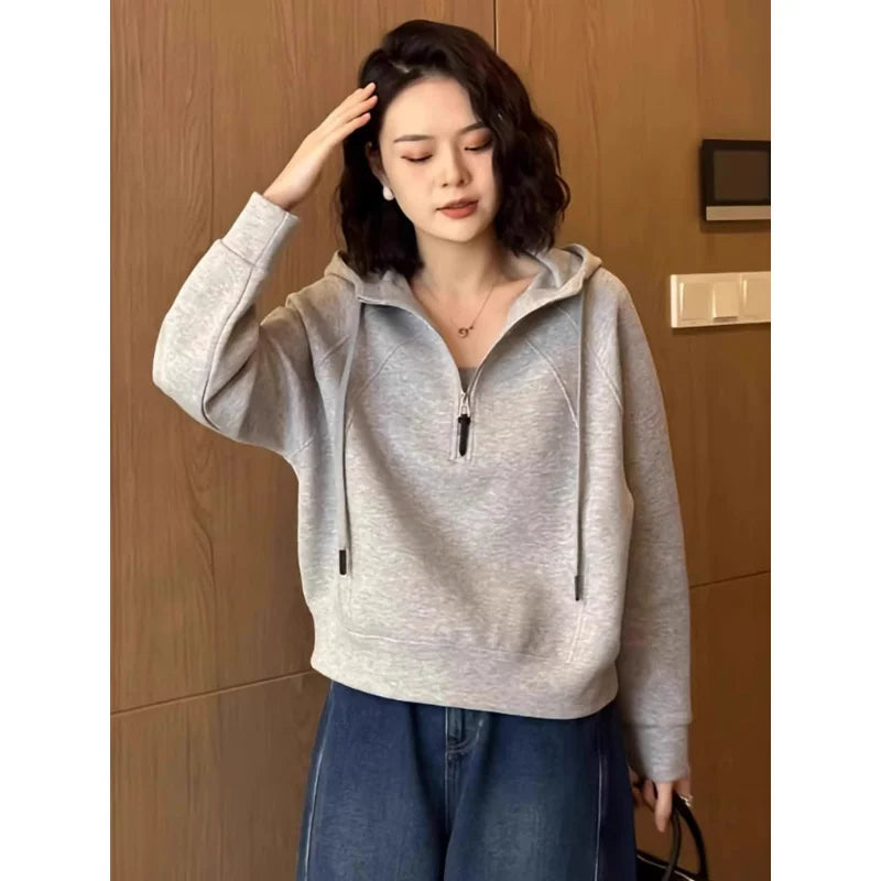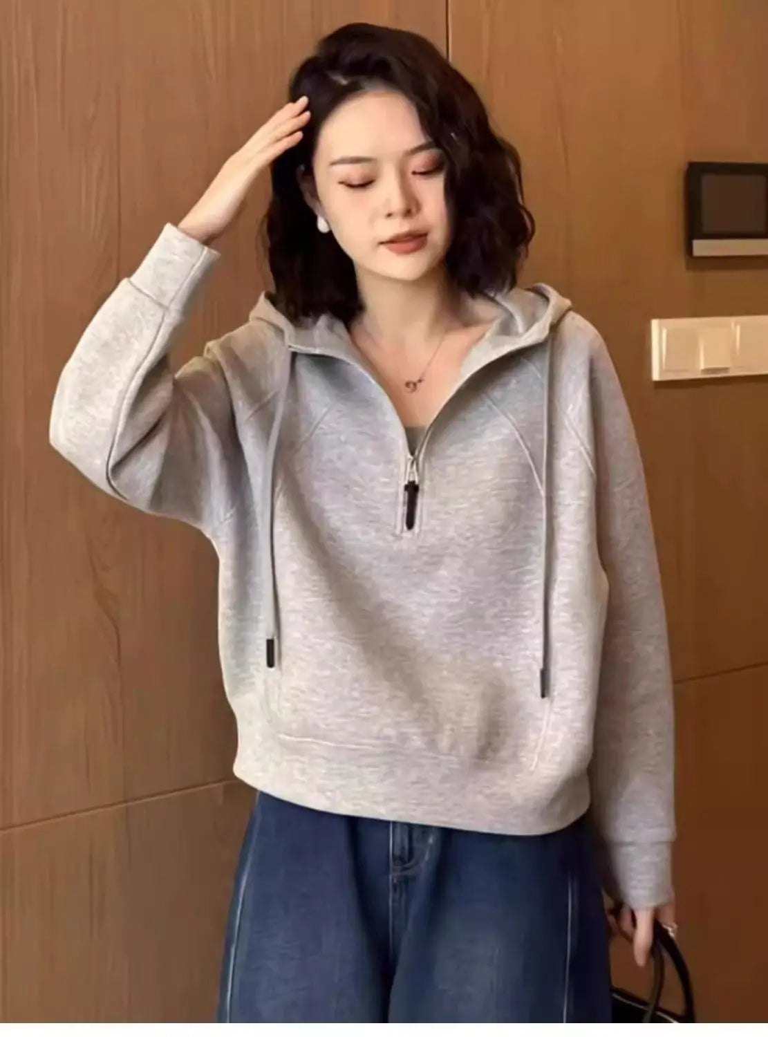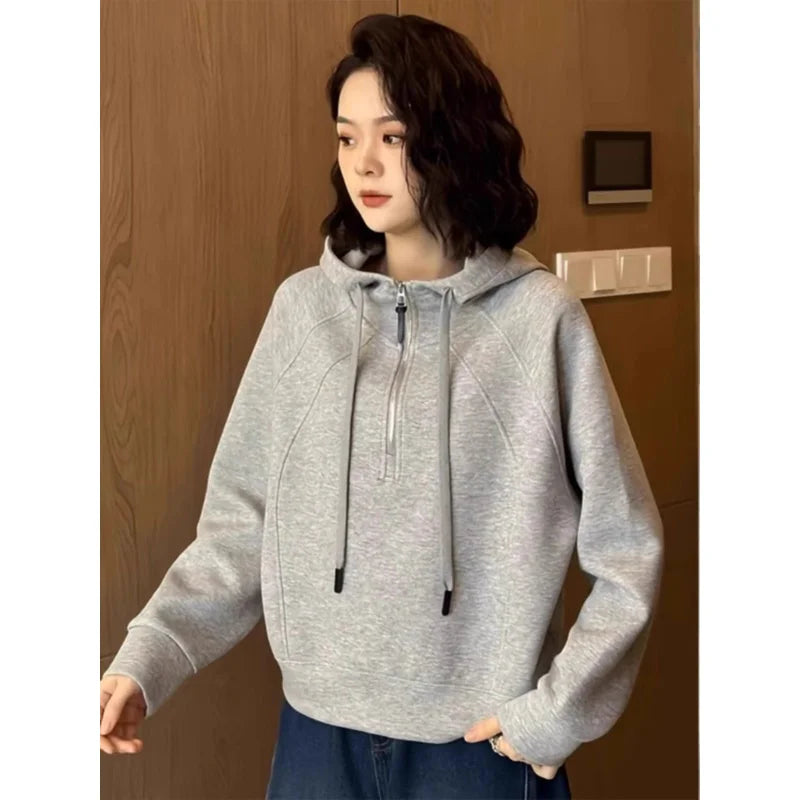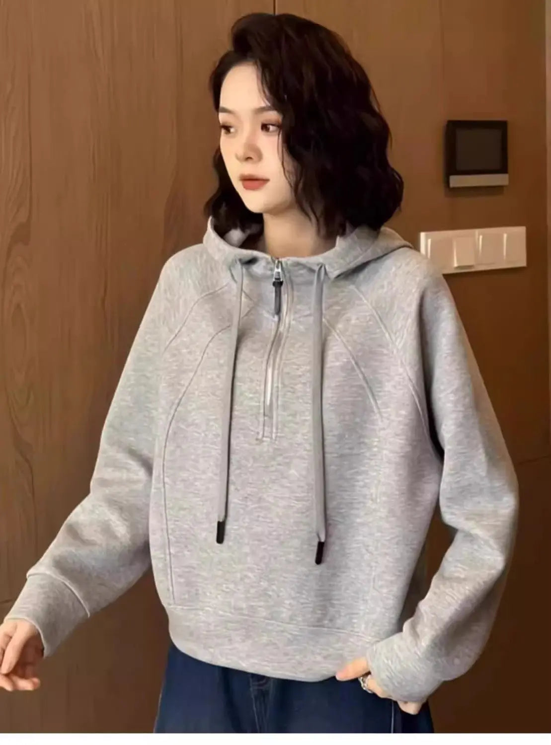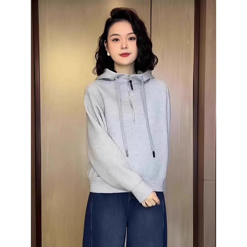 American Grey Half Zipper Hooded Sweatshirt Women in Spring and Autumn Thin L...