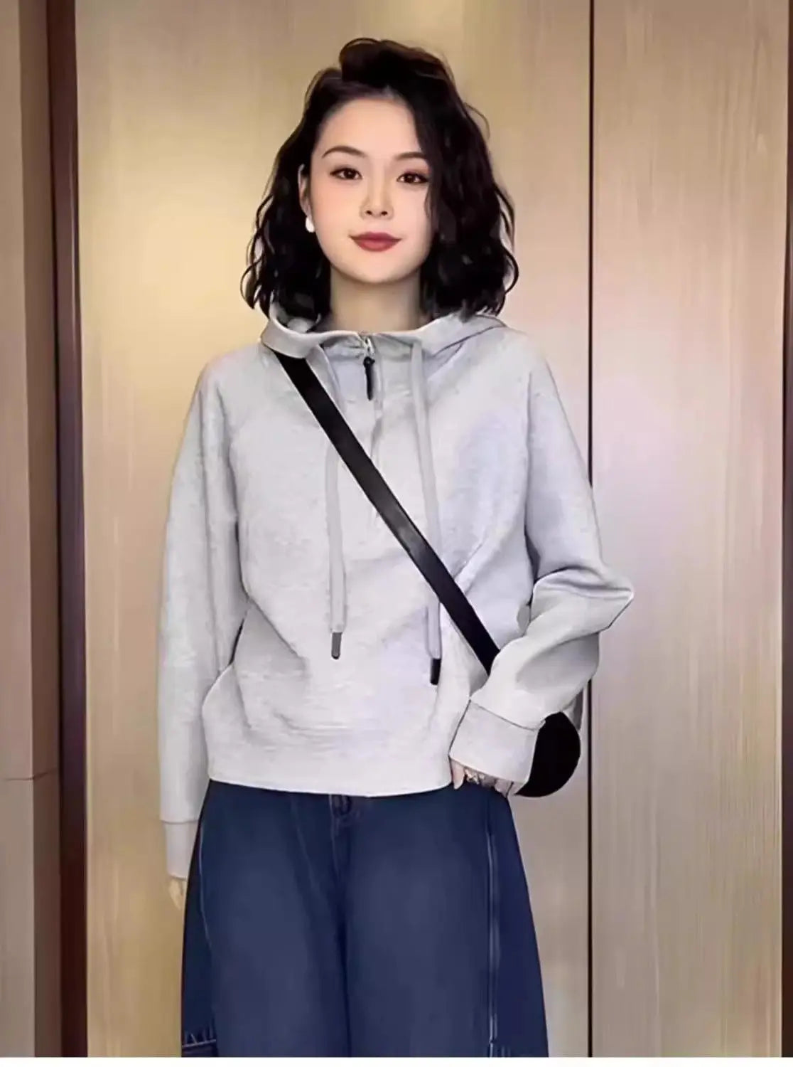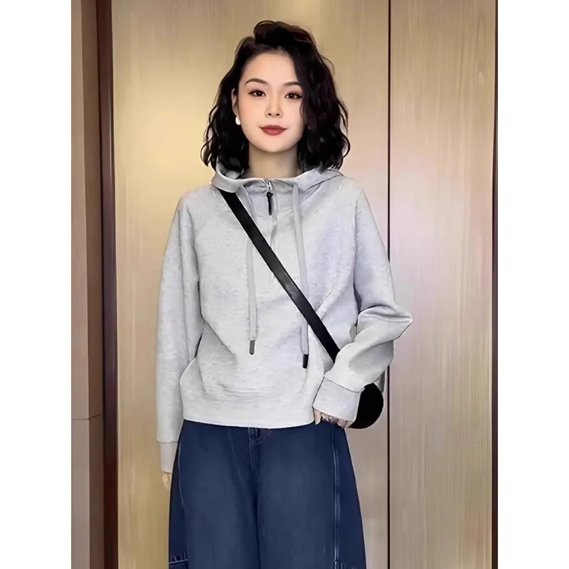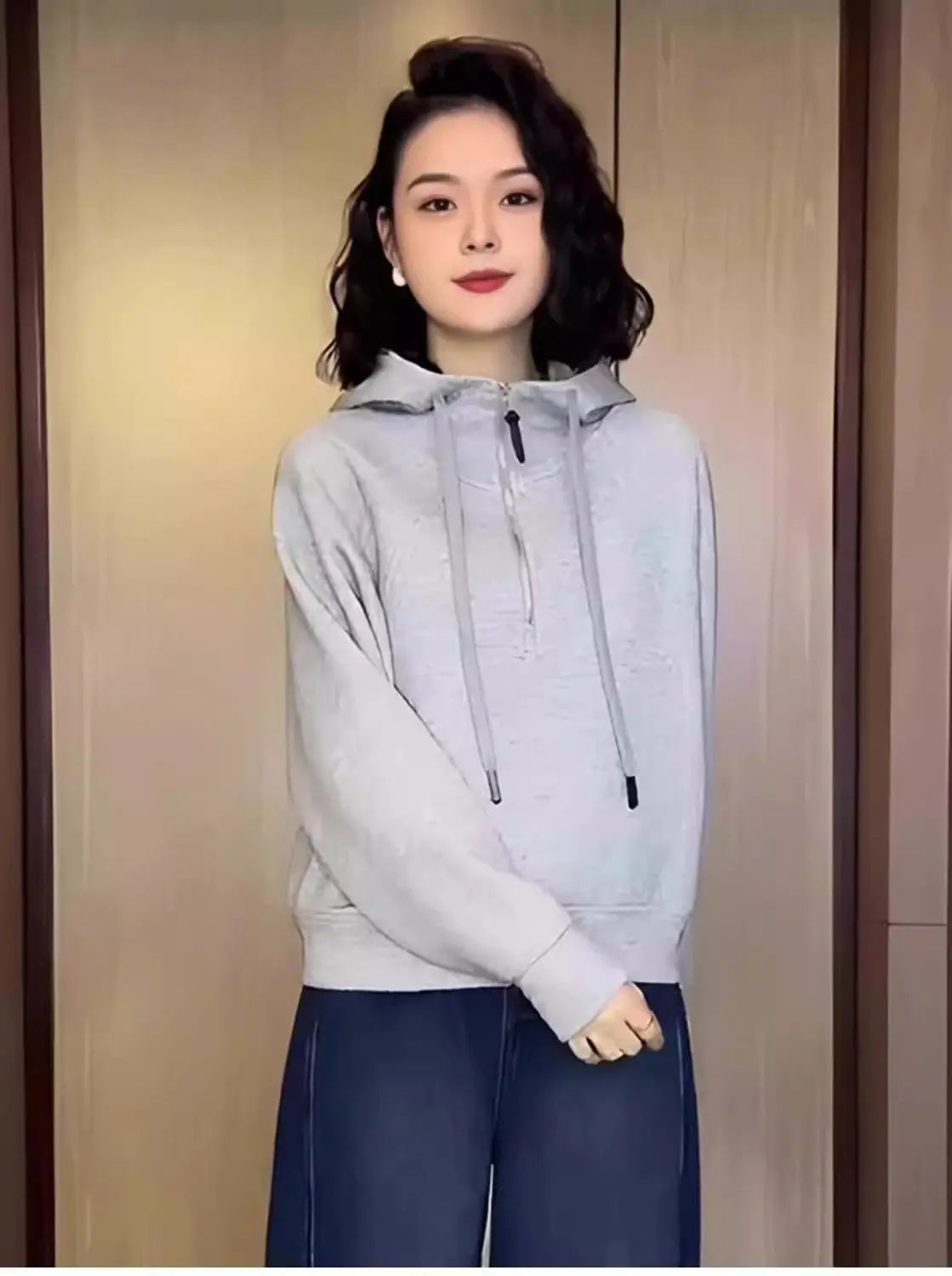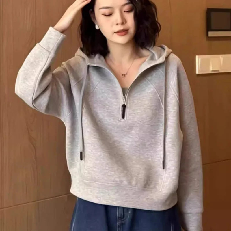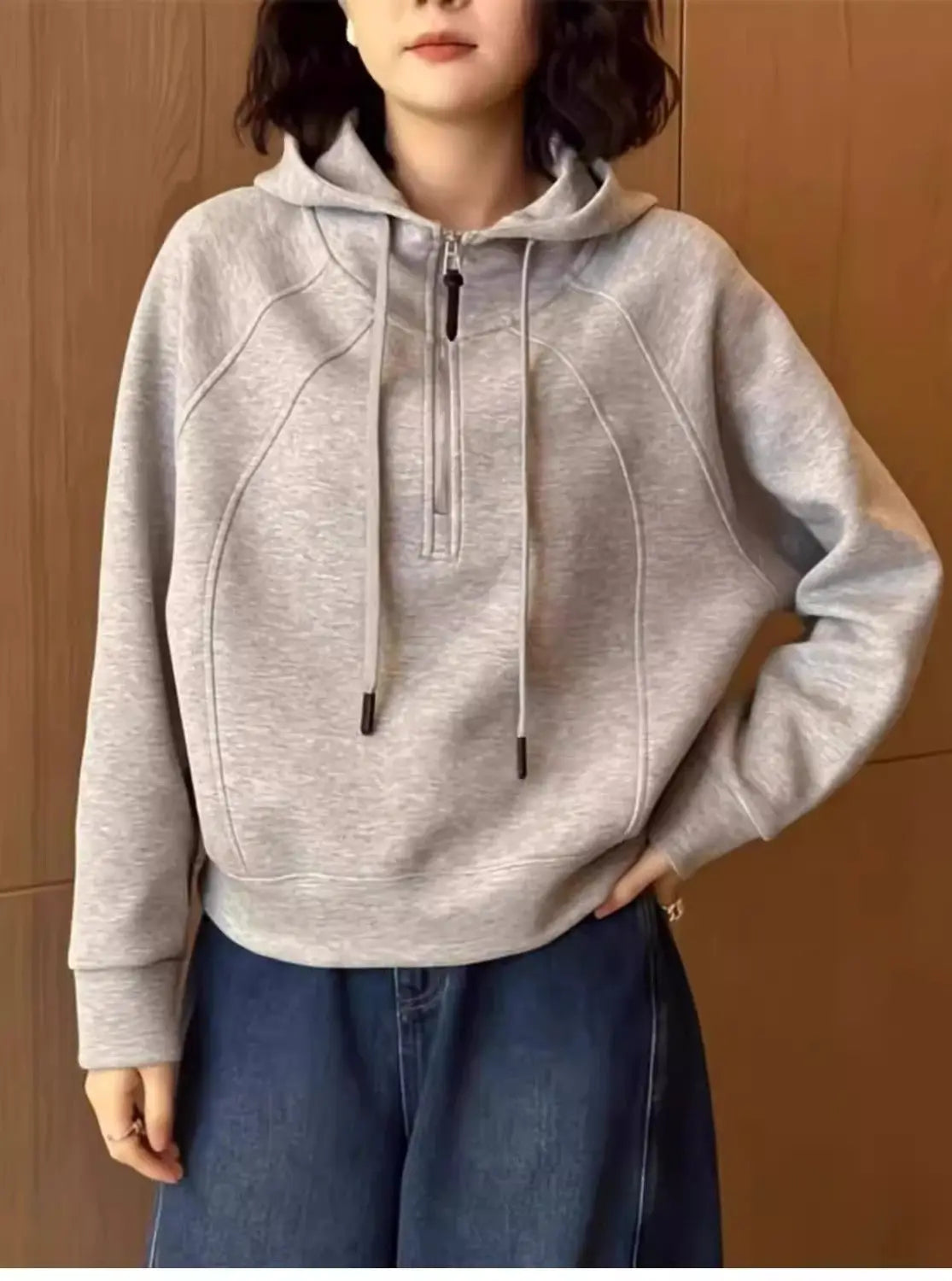 American Grey Half Zipper Hooded Sweatshirt Women in Spring and Autumn Thin L...