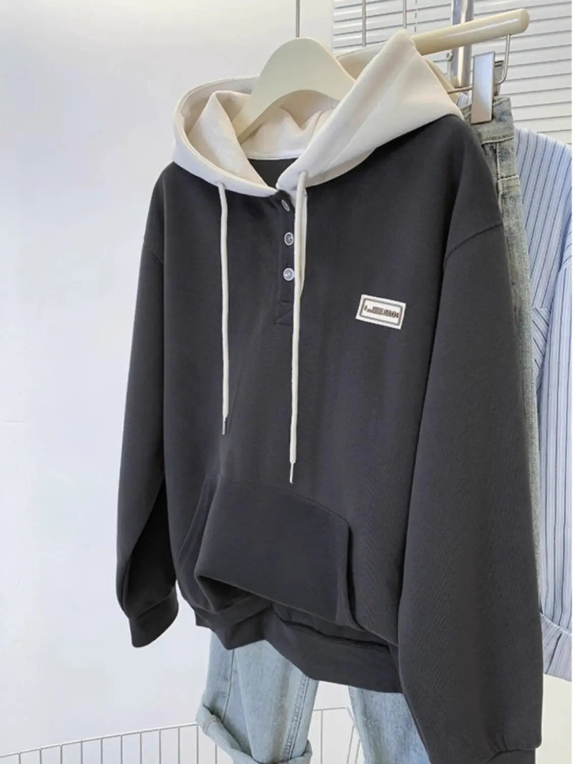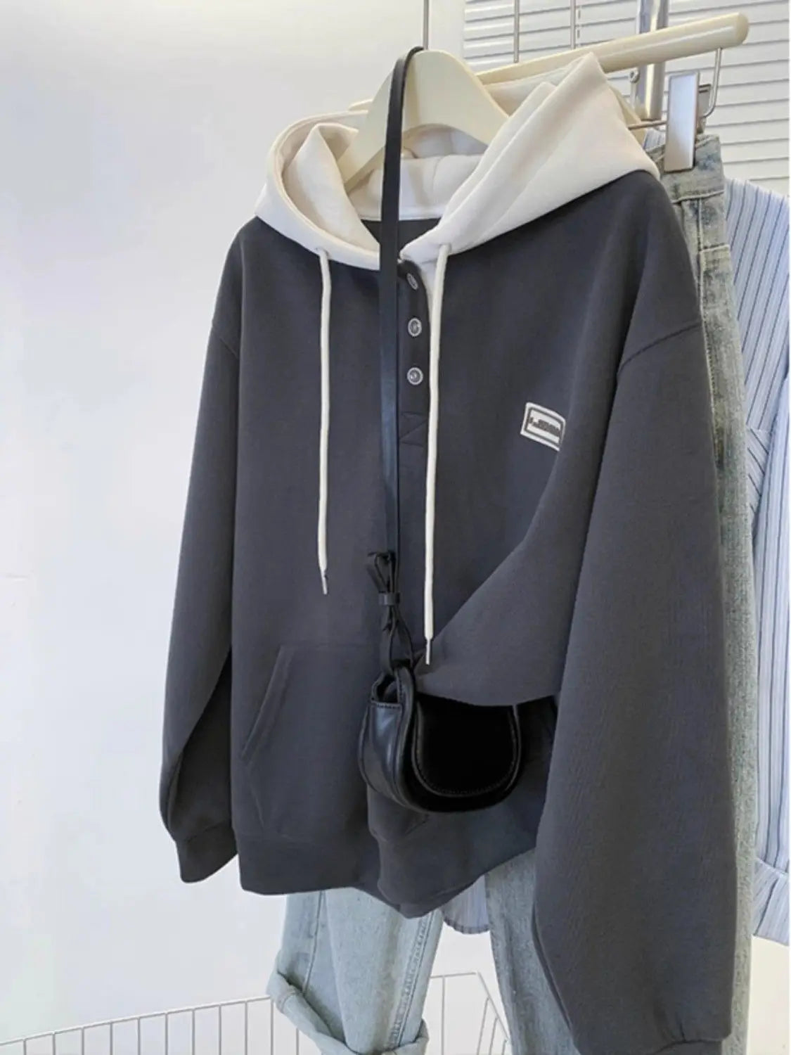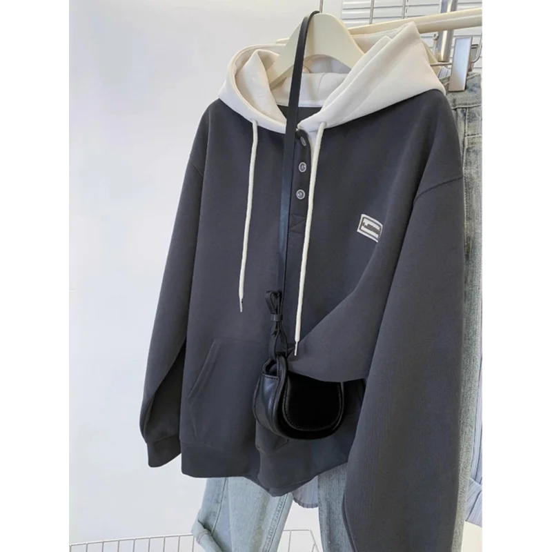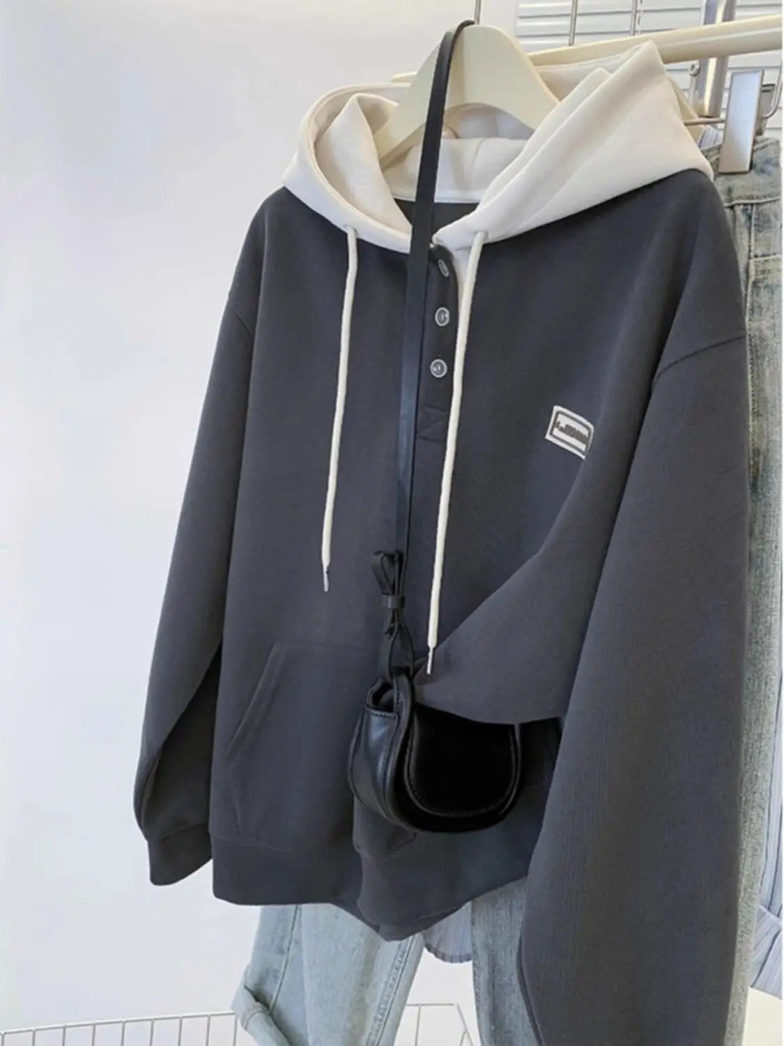 American Retro Splicing Contrasting Versatile Hooded Sweatshirt Women in Autu...
