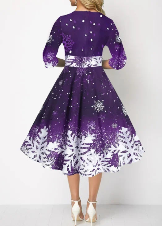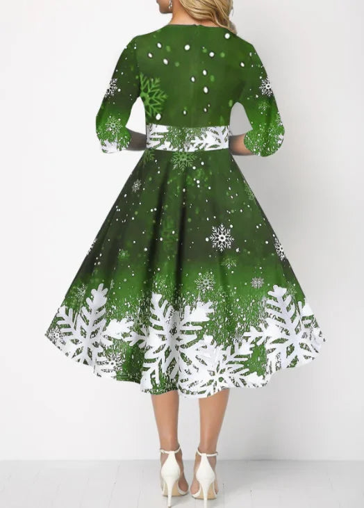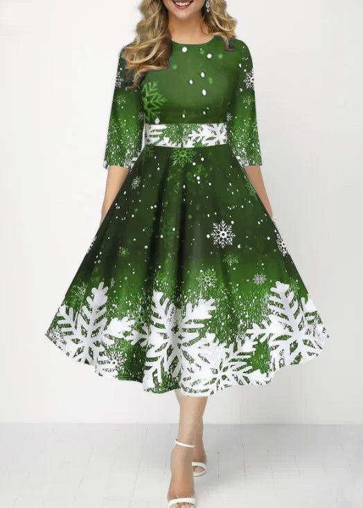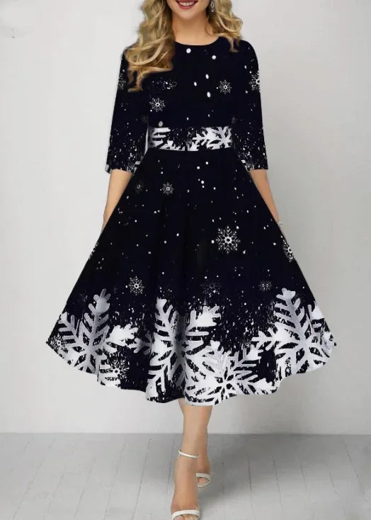 Autumn Winter New Snowflake Digital Print Women's 3/4sleeves Christmas Dress Fashion Waist Elegant Female...