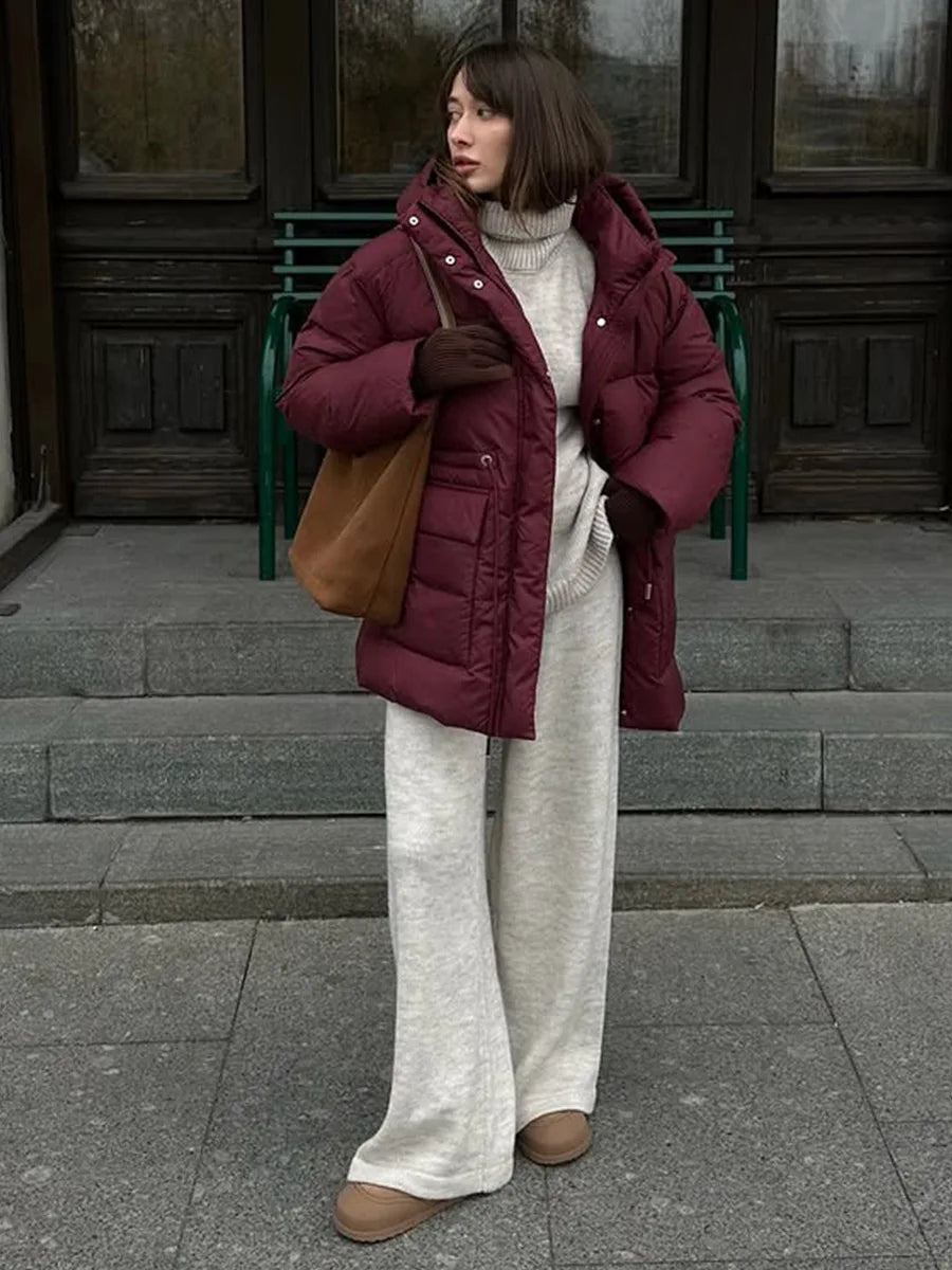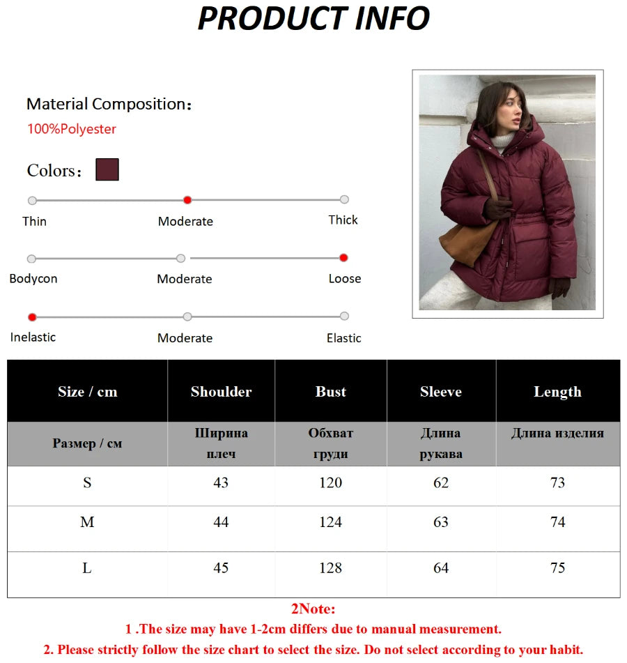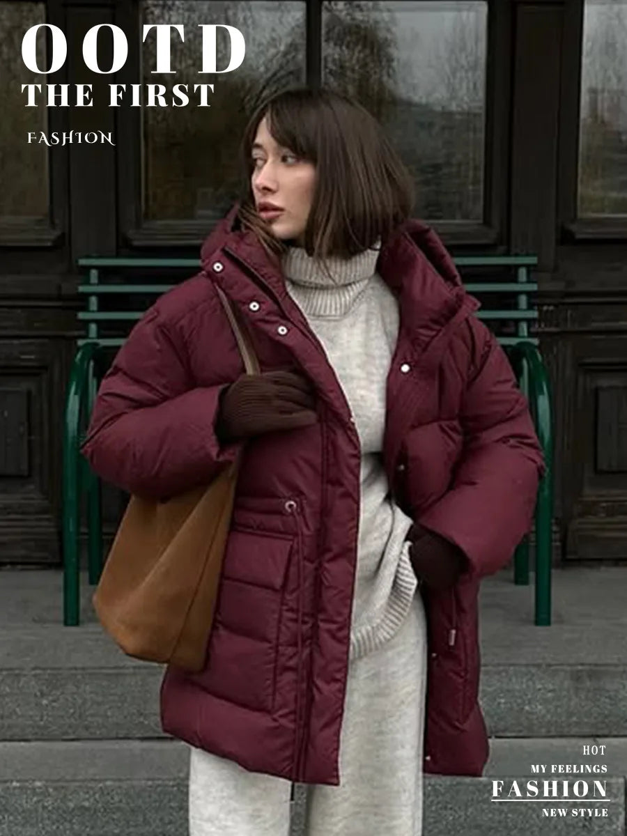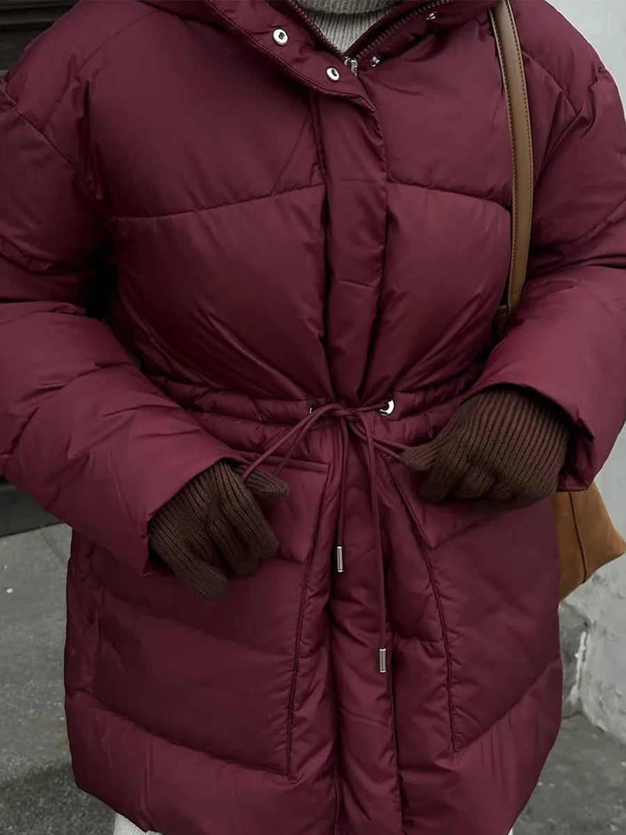 Bornladies Winter Women Wine Red Hooded Puffer Coat Drawstring Waist Zipper Warm