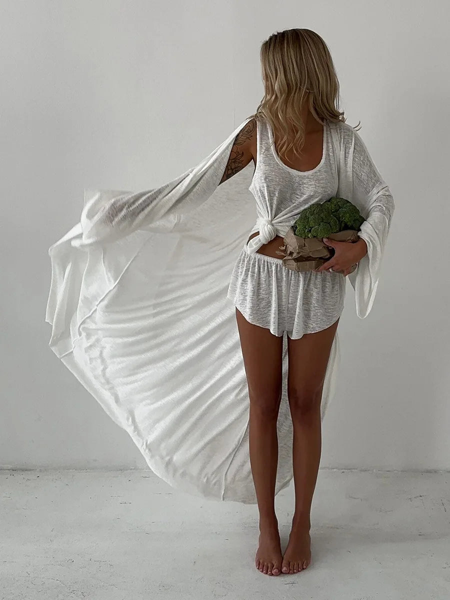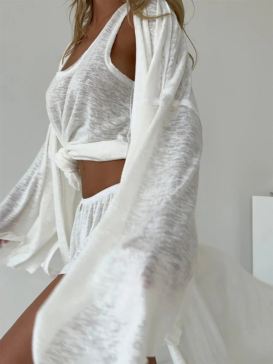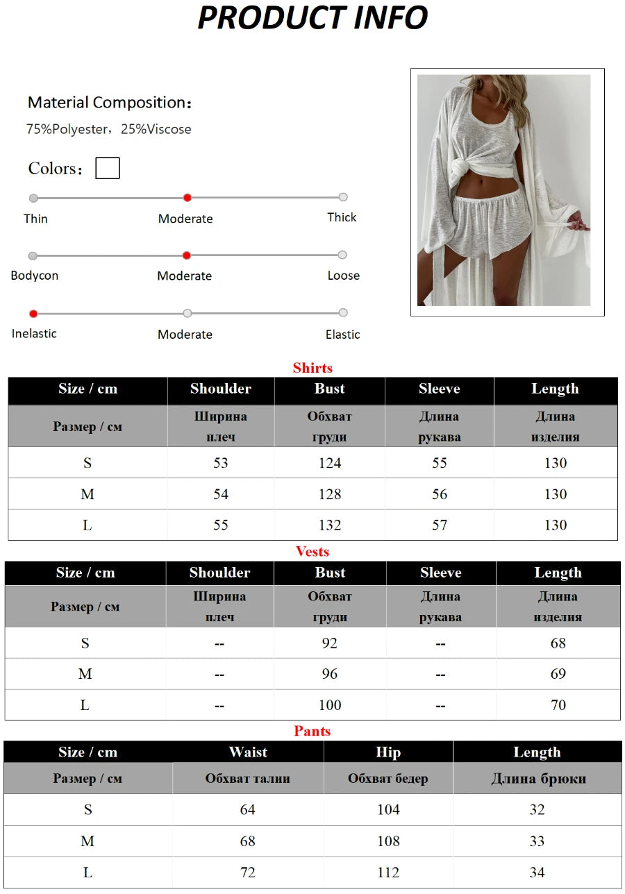 Bornladies White Robe Vest Shorts 3 Piece Set Woman Autumn Semi Transparent