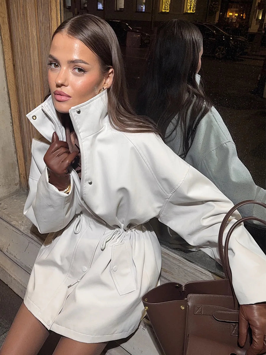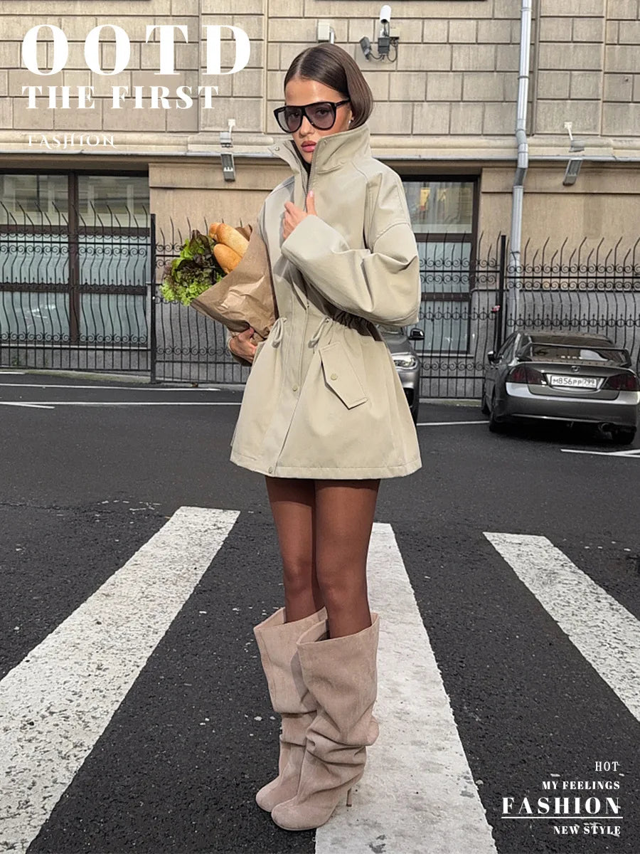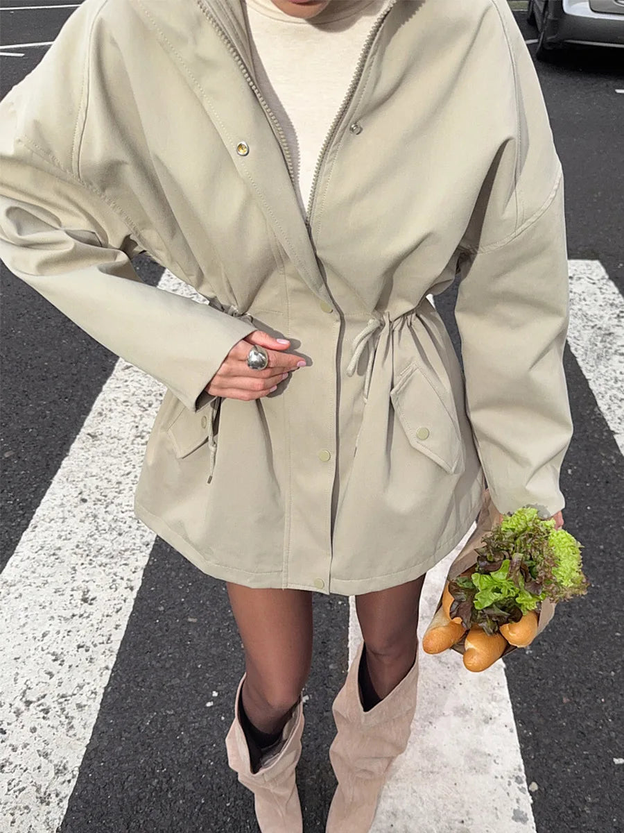 Bornladies Women s Stand Collar Mid length Trench Coat Drawstring Waist Autumn