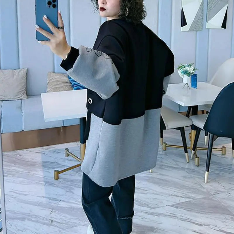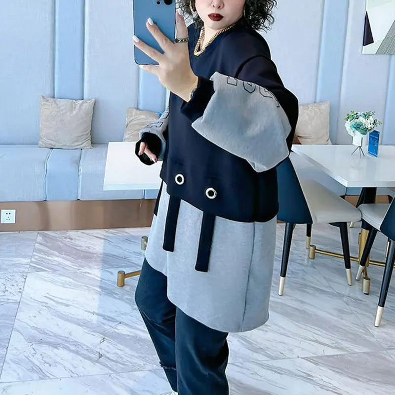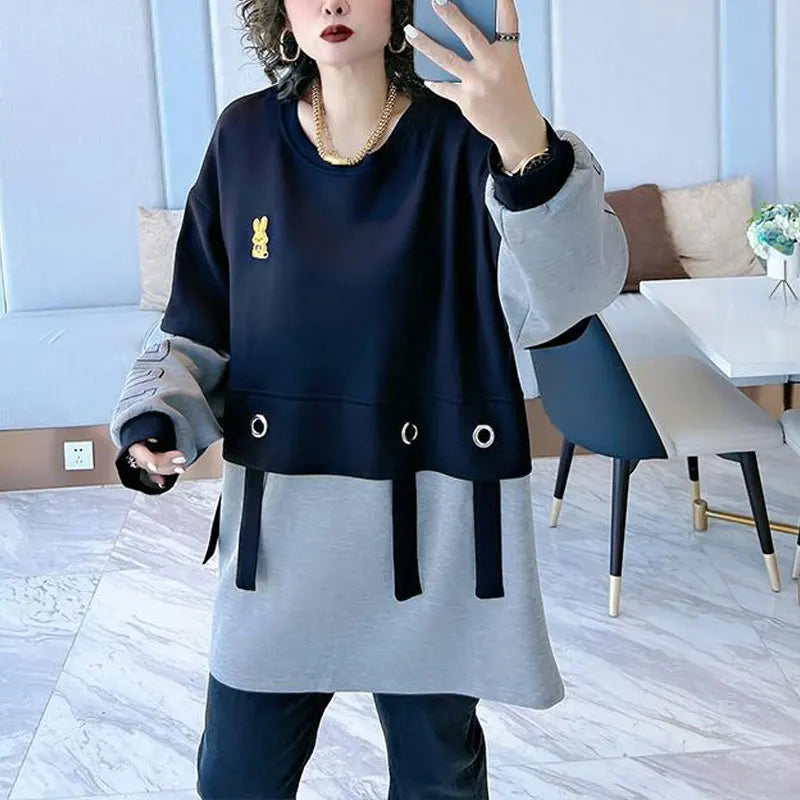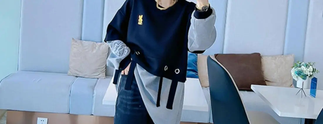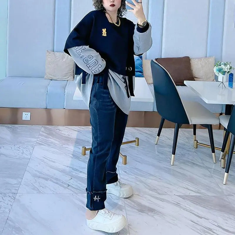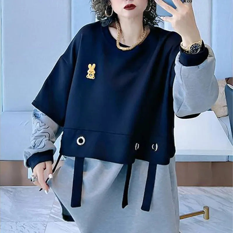 Casual Korean Loose Patchwork Pullovers Spring Autumn Letter Fake Two Pieces ...